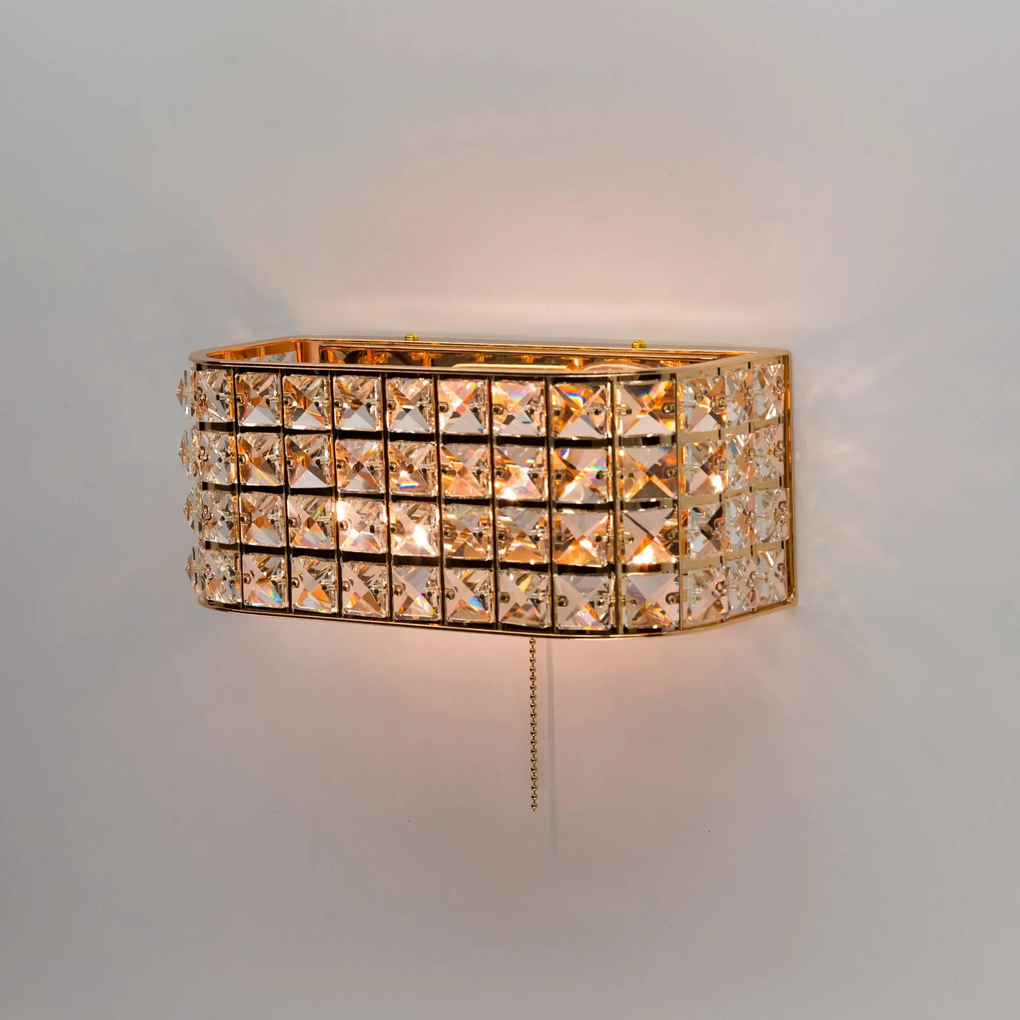 Элегантные настенные бра из серии Портал в золотом исполнении станут настоящей находкой для любителей мягких тёплых тонов в интерьере. Восхитительная игра хрусталя в сочетании со сверкающим основанием благородного золотого цвета способны привести в восторг истинных ценителей современной классики. Закругленные края прямоугольных конструкций делают их ещё более изящными и стильными. Все элементы изделий изготовлены из материалов высочайшего качества. Термостойкие патроны с цоколем Е14 из качественного углепластика дадут возможность применять лампы накаливания мощностью до 60 Ватт. Модель способна полноценно осветить площадь от 3-ёх до 6-ти квадратных метров, а встроенный выключатель в виде золотой цепочки станет удобным и приятным дополнением.