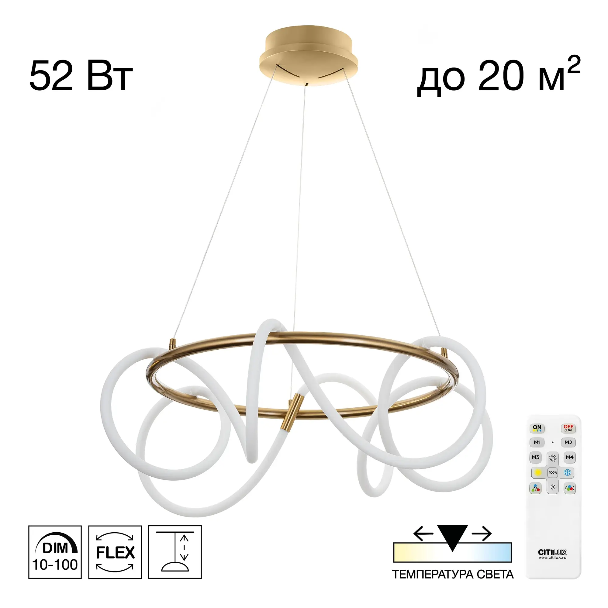 Мощность изделия 52Вт, световой поток 5200Лм, индекс цветопередачи CRI >80. Диаметр модели 60см, высота легко регулируется при установке в диапазоне от 50см до 1,5м.