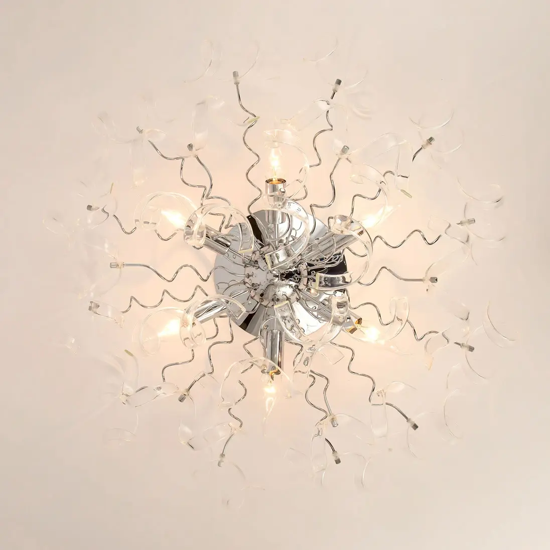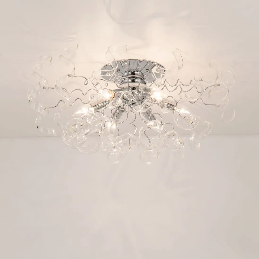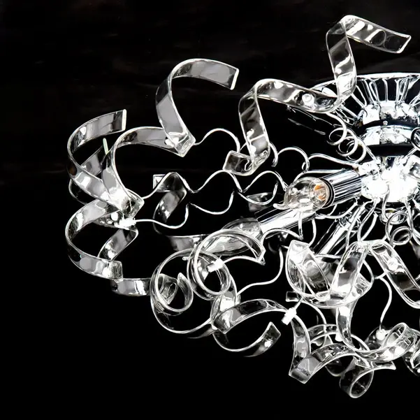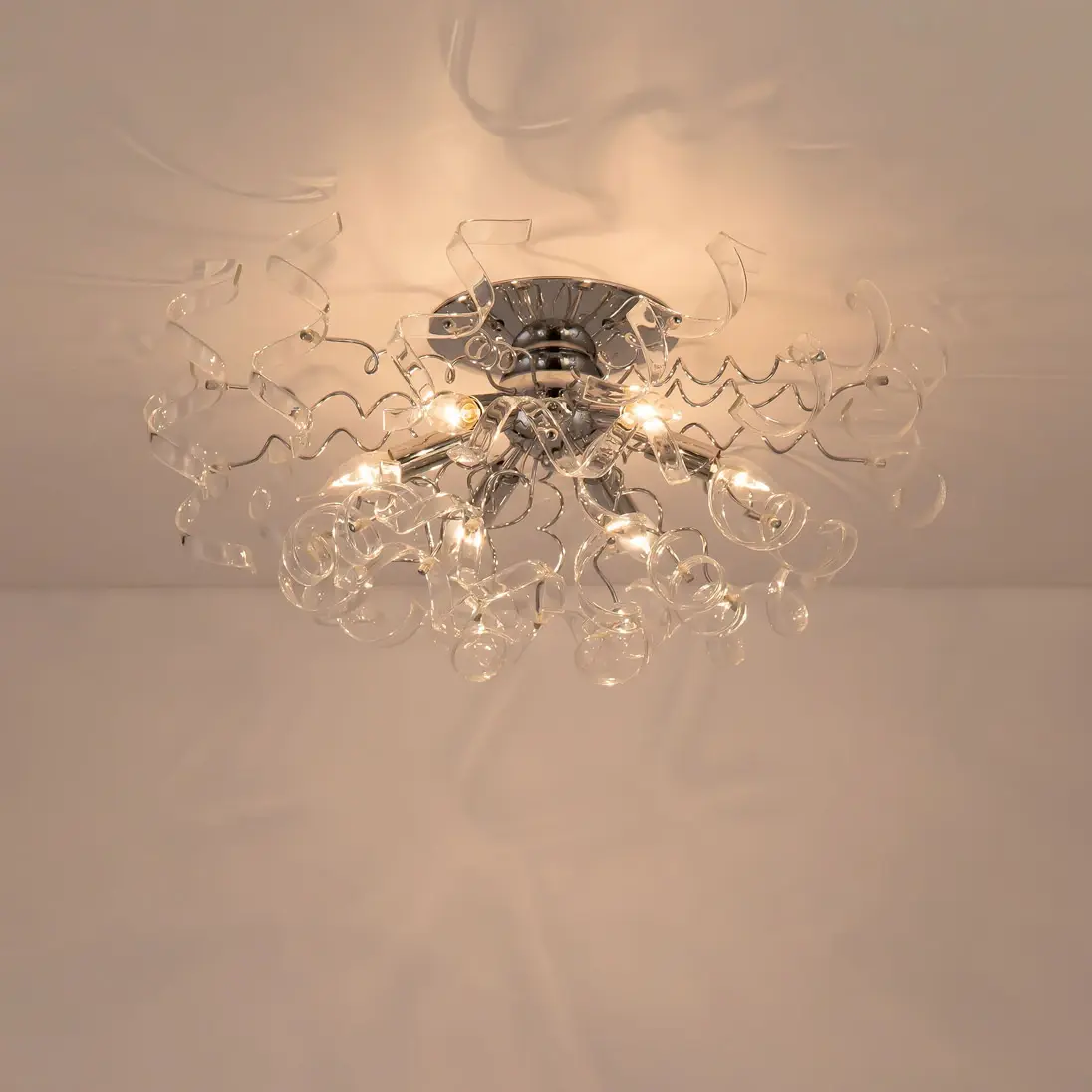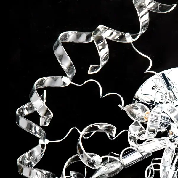 Серия потолочных люстр Рандом стала одной из самых удачных находок наших дизайнеров. Модели из коллекции способны кардинально преобразить ваше пространство. Неординарность конструкции заключается, в первую очередь, в декоративных стеклянных элементах, в виде завитушек, которые слегка преломляют световой поток, и тем самым, наполнят ваш интерьер причудливыми узорами. Коллекция включает в себя три цветовых решениях – прозрачный, прозрачный + белый, прозрачный +янтарный. Помимо этого светильники представлены в двух типоразмерах – на 6 и на 9 ламп, что поможет сделать оптимальный выбор, в зависимости от площади вашего помещения. Шестирожковая модель, декорированная исключительно прозрачными стеклянными элементами, буквально растворится в любом интерьере, и при этом прекрасно осветит комнаты площадью 11-17 квадратных метров. Основание светильника выполнено из металла с надёжным гальваническим покрытием, защищающим изделие от коррозии. Высота конструкции составляет всего 30 сантиметров, тем самым делая её подходящей для помещений с потолками любой высоты.