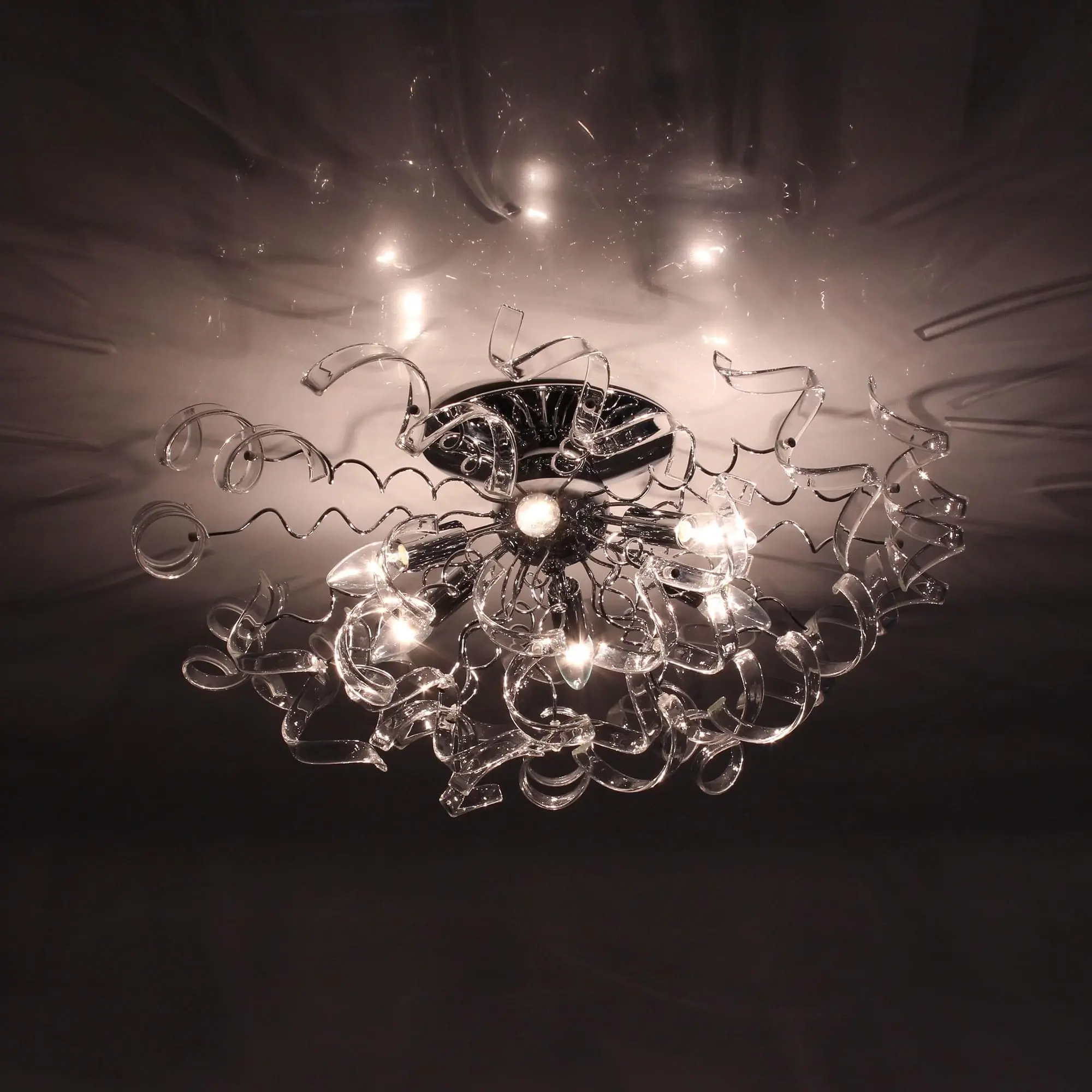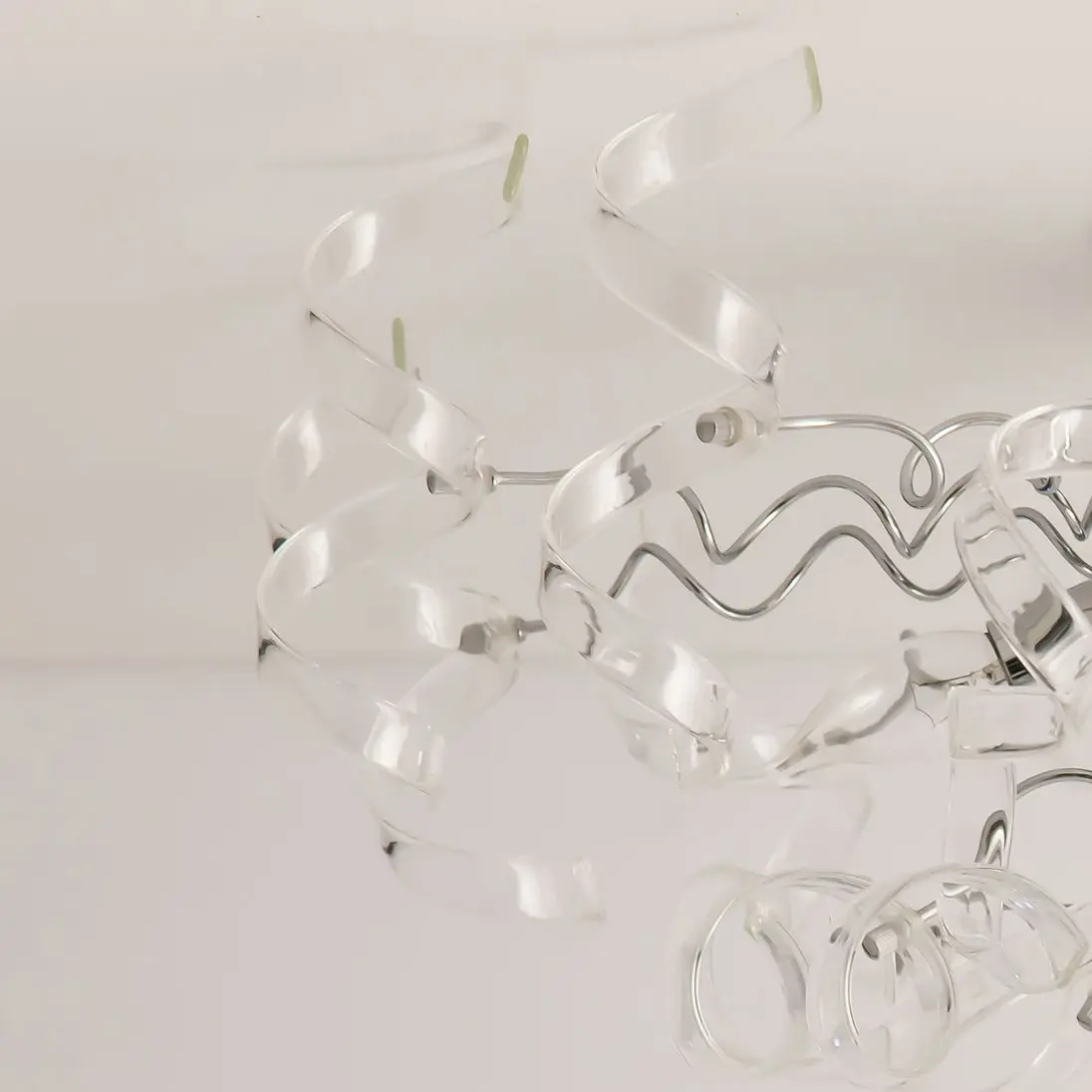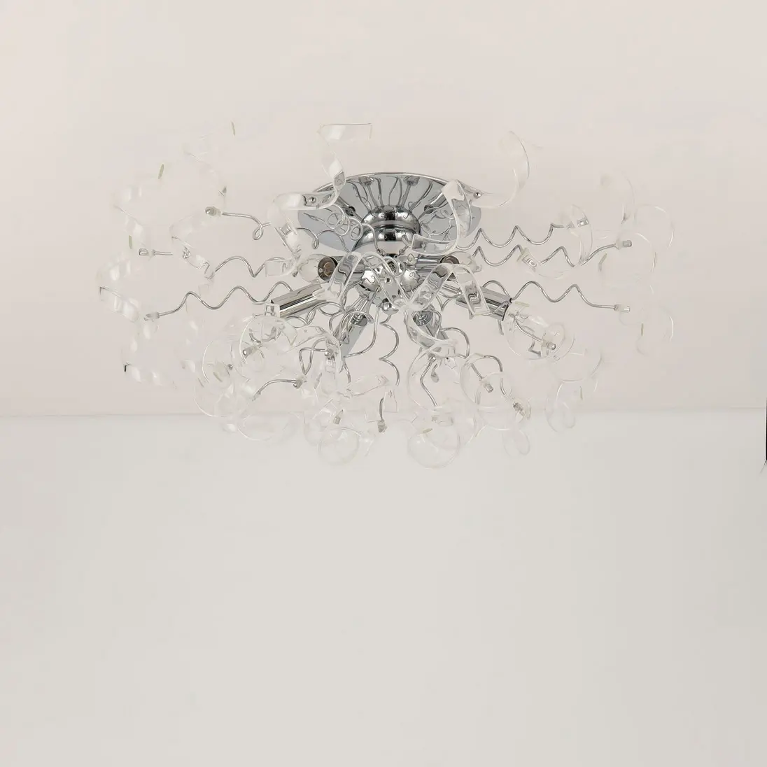 Серия потолочных люстр Рандом стала одной из самых удачных находок наших дизайнеров. Модели из коллекции способны кардинально преобразить ваше пространство. Неординарность конструкции заключается, в первую очередь, в декоративных стеклянных элементах, в виде завитушек, которые слегка преломляют световой поток, и тем самым, наполнят ваш интерьер причудливыми узорами. Коллекция включает в себя три цветовых решениях – прозрачный, прозрачный + белый, прозрачный +янтарный. Помимо этого светильники представлены в двух типоразмерах – на 6 и на 9 ламп, что поможет сделать оптимальный выбор, в зависимости от площади вашего помещения. Шестирожковая модель, декорированная исключительно прозрачными стеклянными элементами, буквально растворится в любом интерьере, и при этом прекрасно осветит комнаты площадью 11-17 квадратных метров. Основание светильника выполнено из металла с надёжным гальваническим покрытием, защищающим изделие от коррозии. Высота конструкции составляет всего 30 сантиметров, тем самым делая её подходящей для помещений с потолками любой высоты.