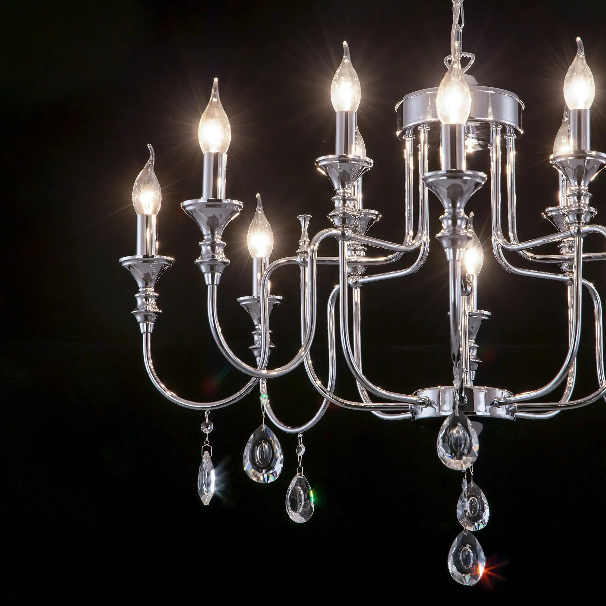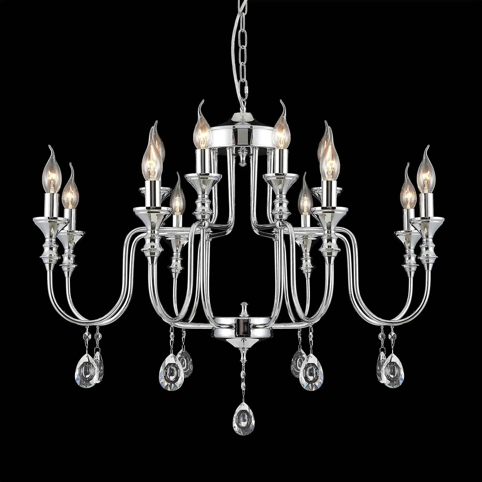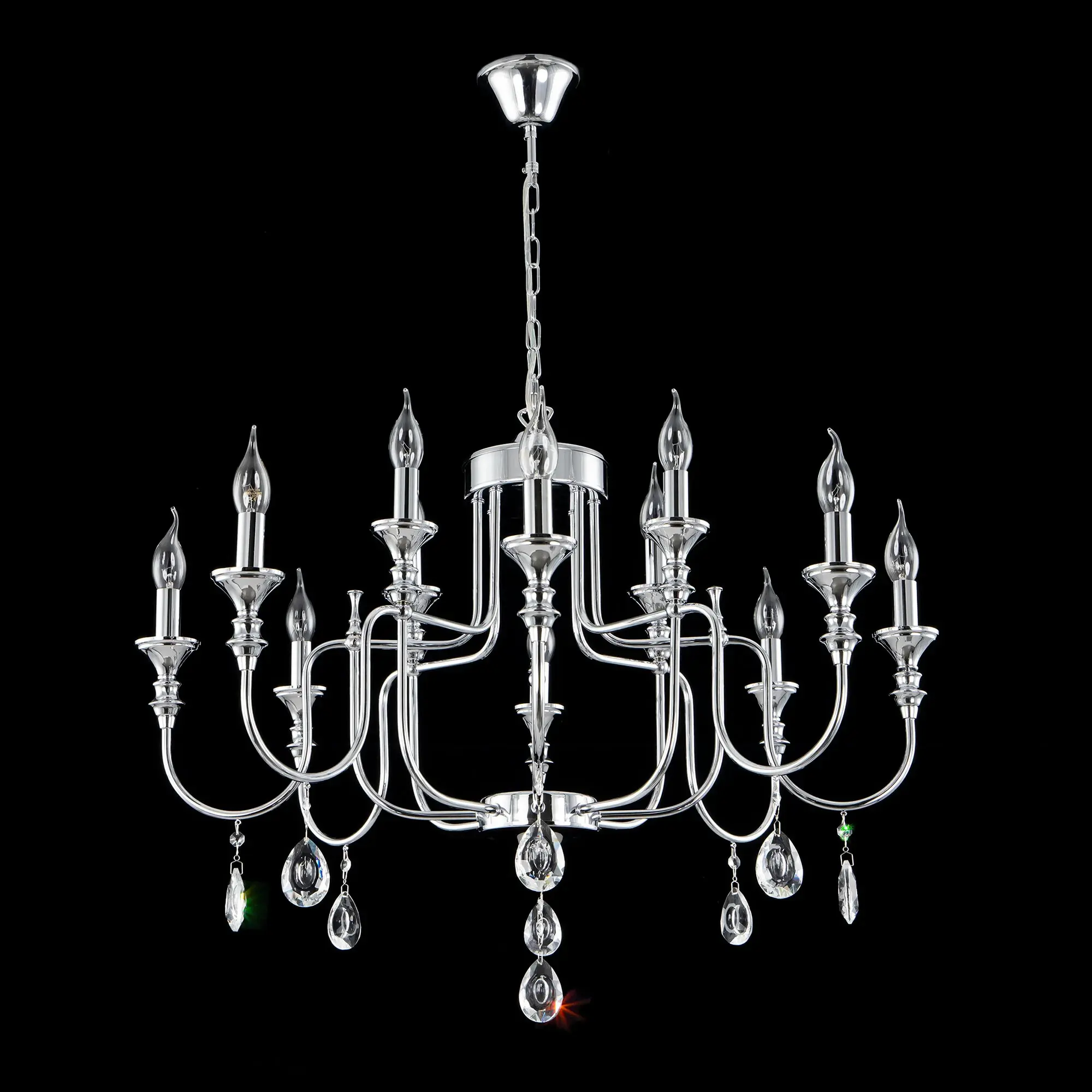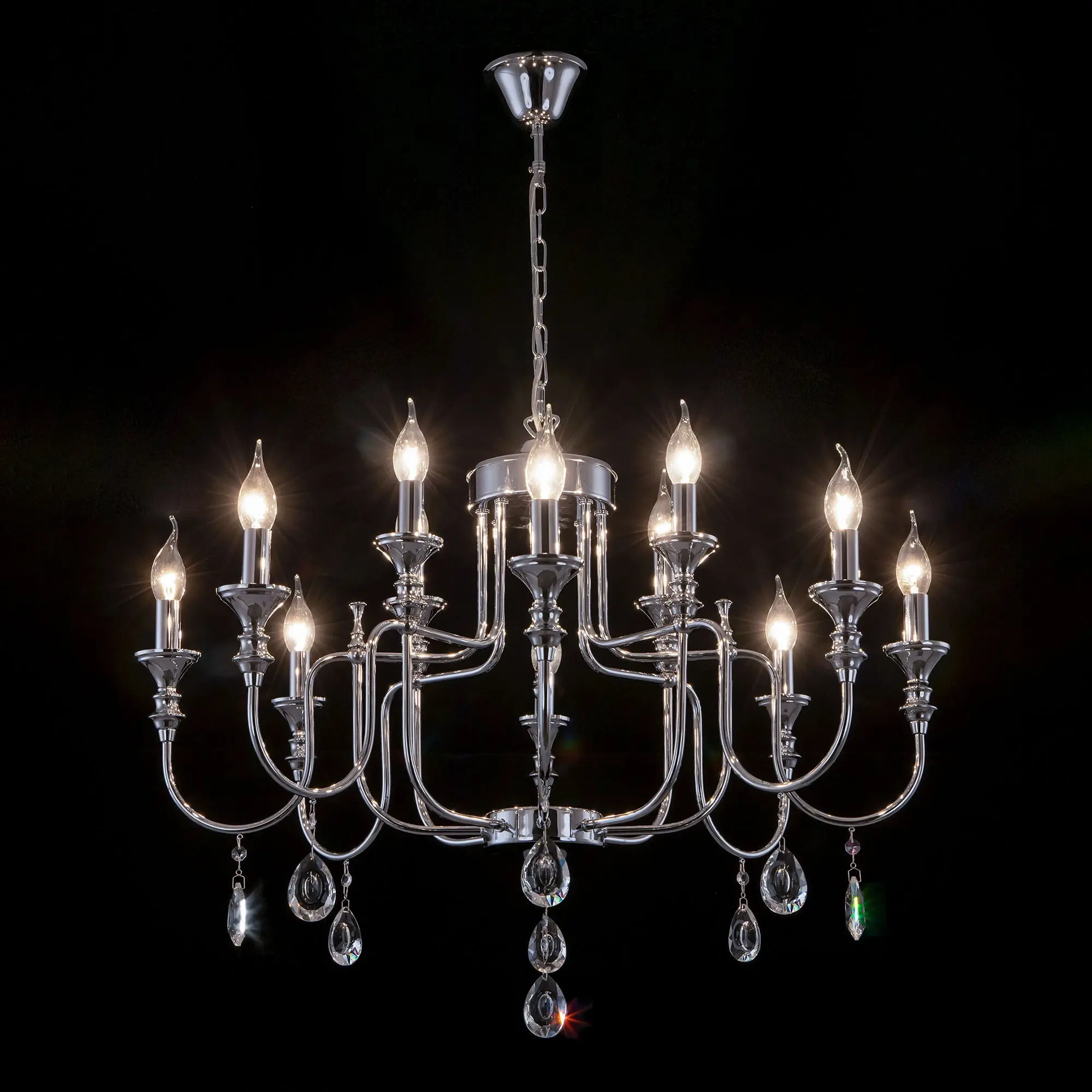 Подвесная люстра Citilux Рига CL437221 с хрустальными подвесками. Корпус светильника металлический, хромированный. Подвески из прозрачного хрусталя высокого качества, с необычной огранкой. В изделии 12 ламп с цоколем Е14, максимальной мощностью для ламп накаливания 60Вт. Светодиодные лампы можно использовать более яркие. Высота модели регулируется в диапазоне от 82см до 1,3м, диаметр 81см. Осветит около 34м². Тип крепления – на крюк.,