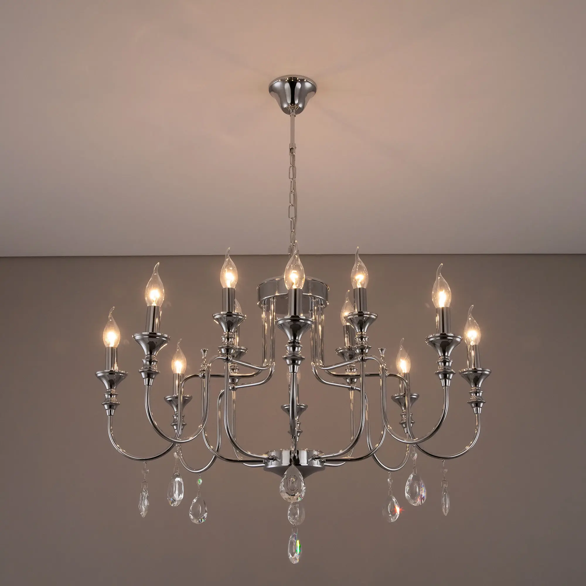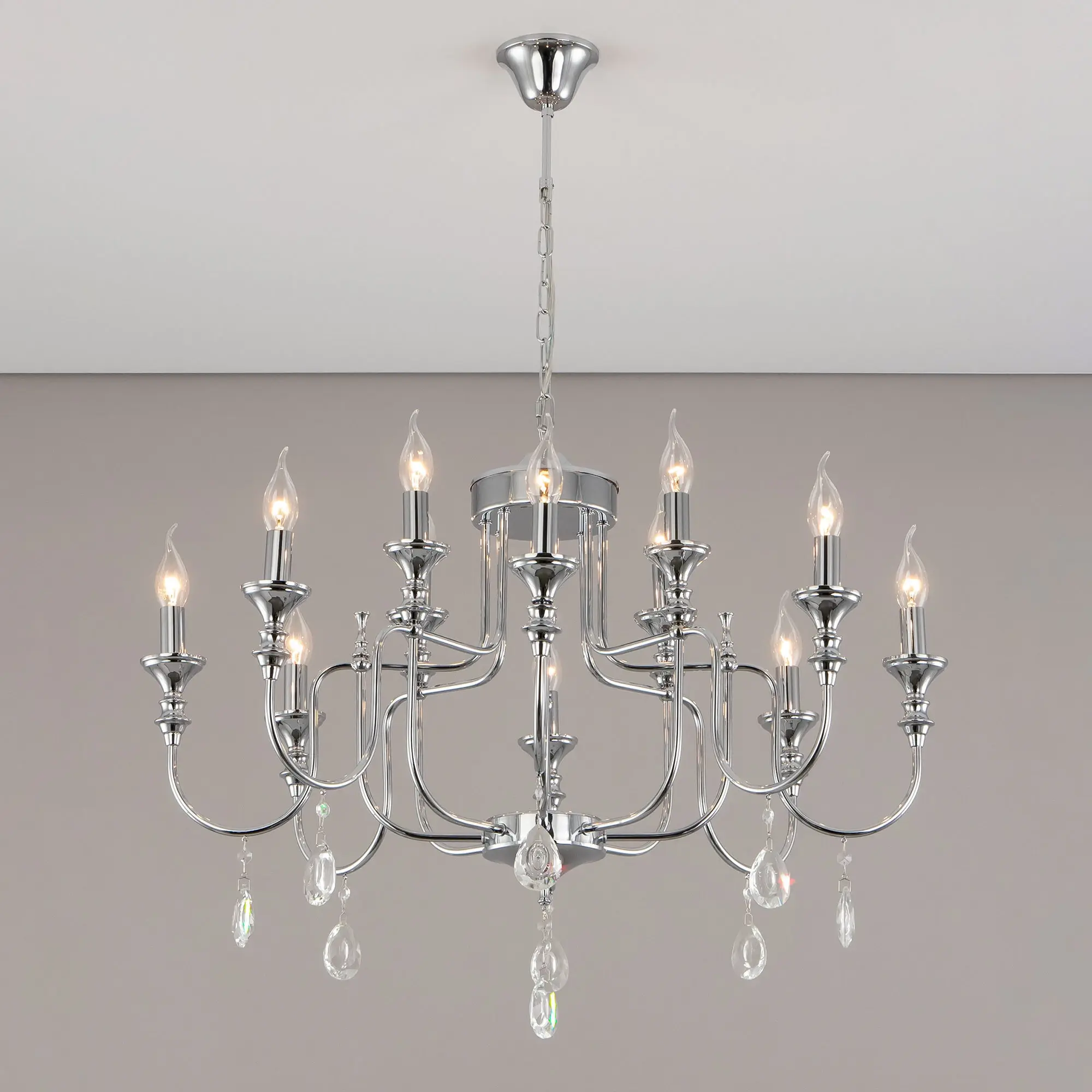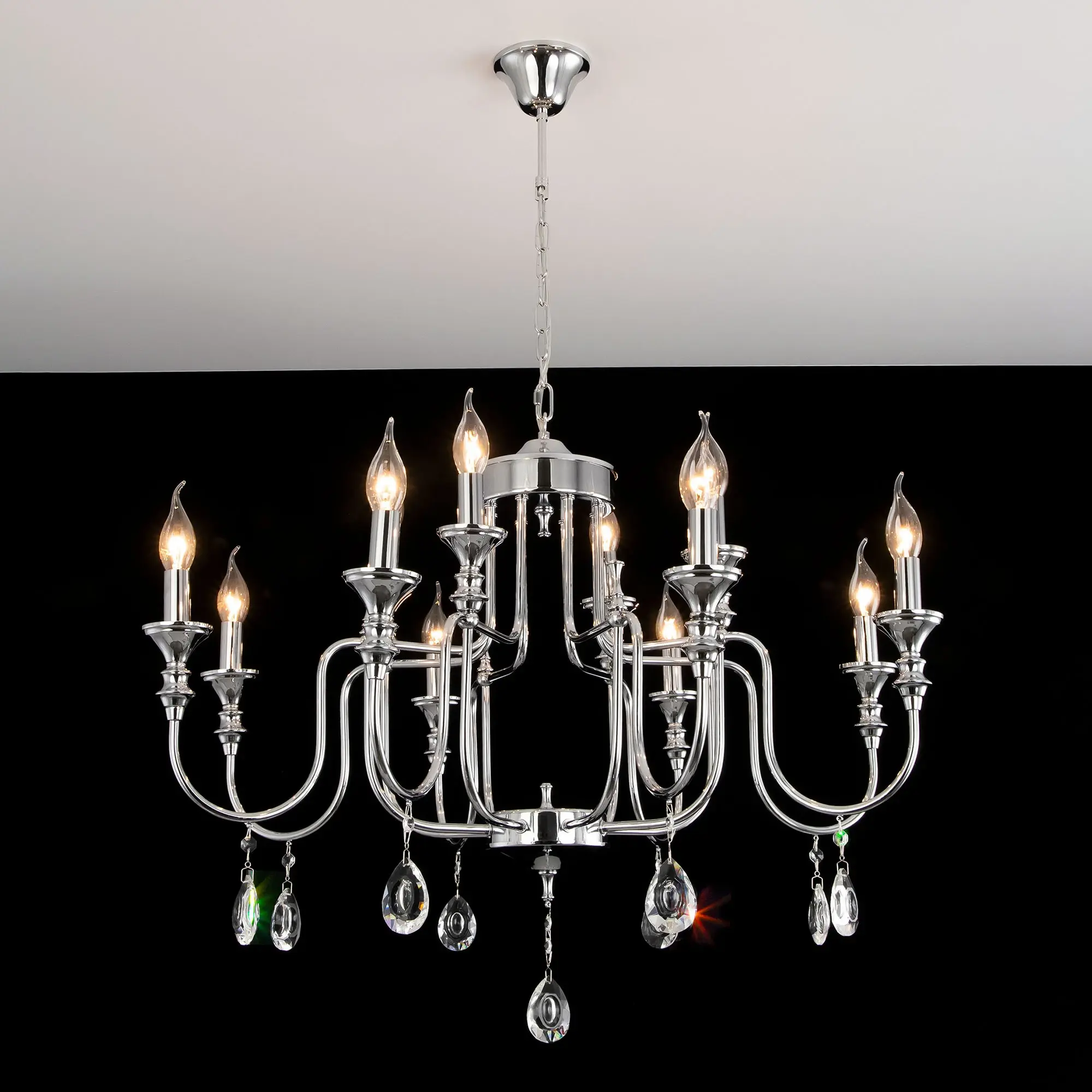 Подвесная люстра Citilux Рига CL437221 с хрустальными подвесками. Корпус светильника металлический, хромированный. Подвески из прозрачного хрусталя высокого качества, с необычной огранкой. В изделии 12 ламп с цоколем Е14, максимальной мощностью для ламп накаливания 60Вт. Светодиодные лампы можно использовать более яркие. Высота модели регулируется в диапазоне от 82см до 1,3м, диаметр 81см. Осветит около 34м². Тип крепления – на крюк,