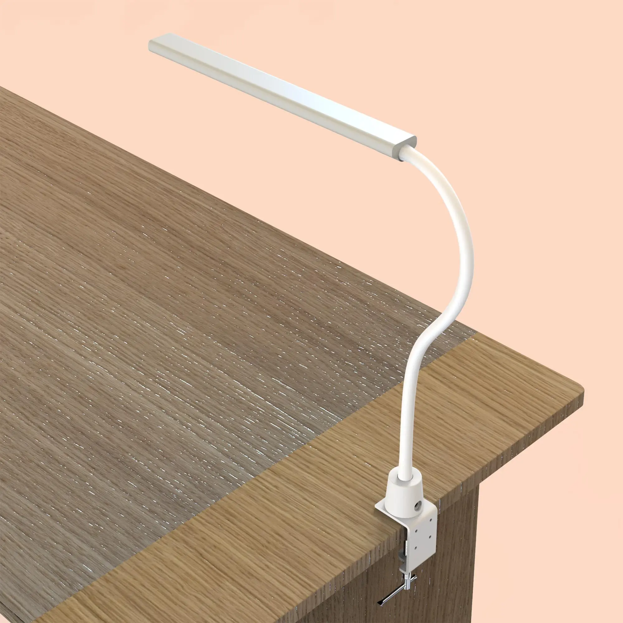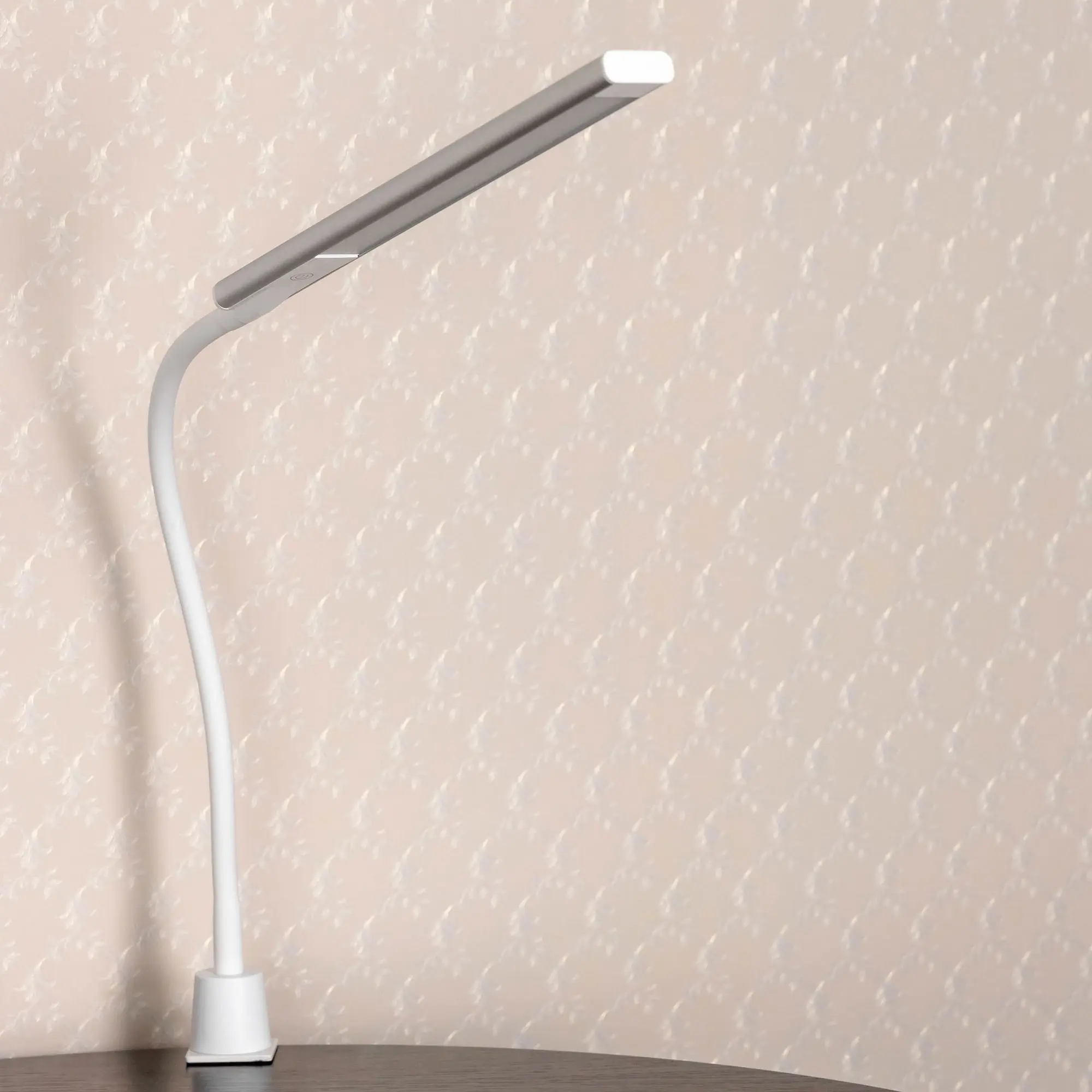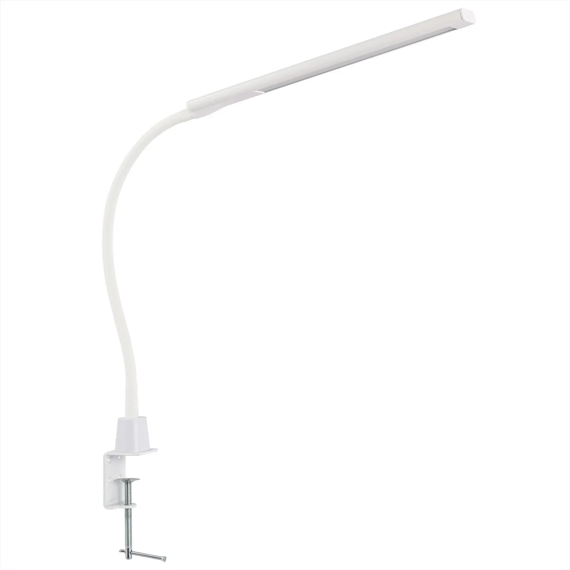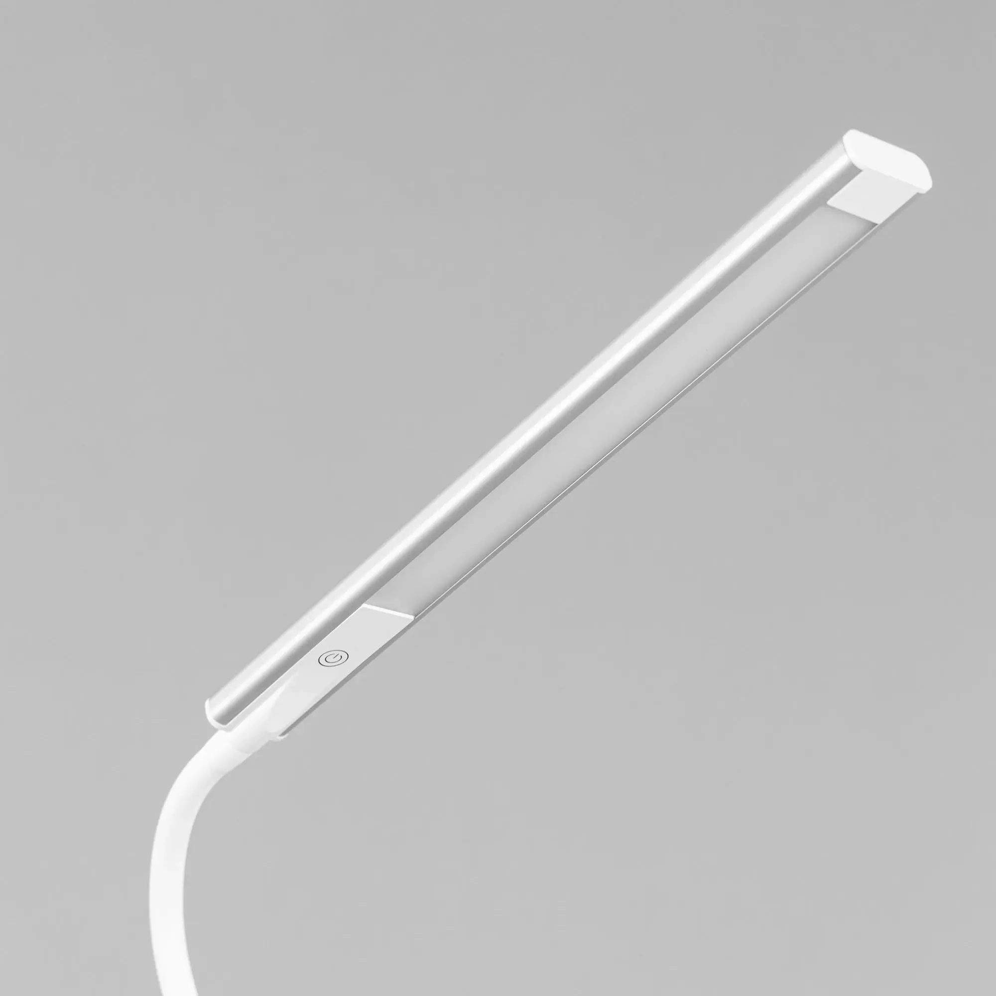 Светодиодная лампа со струбциной на гибкой стойке Citilux Рио CL803090N. Основание металлическое, белого цвета, светодиодный модуль цвета алюминий. Гибкая стойка позволяет направить свет в любую сторону. Мощность 7Вт, цветовая температура 4000К – тёплый белый свет. Сенсорное управление со ступенчатым диммером 100%-40%-15%. Высота от 10см до 75см, осветит около 2м². Длина сетевого провода 1,8м.,