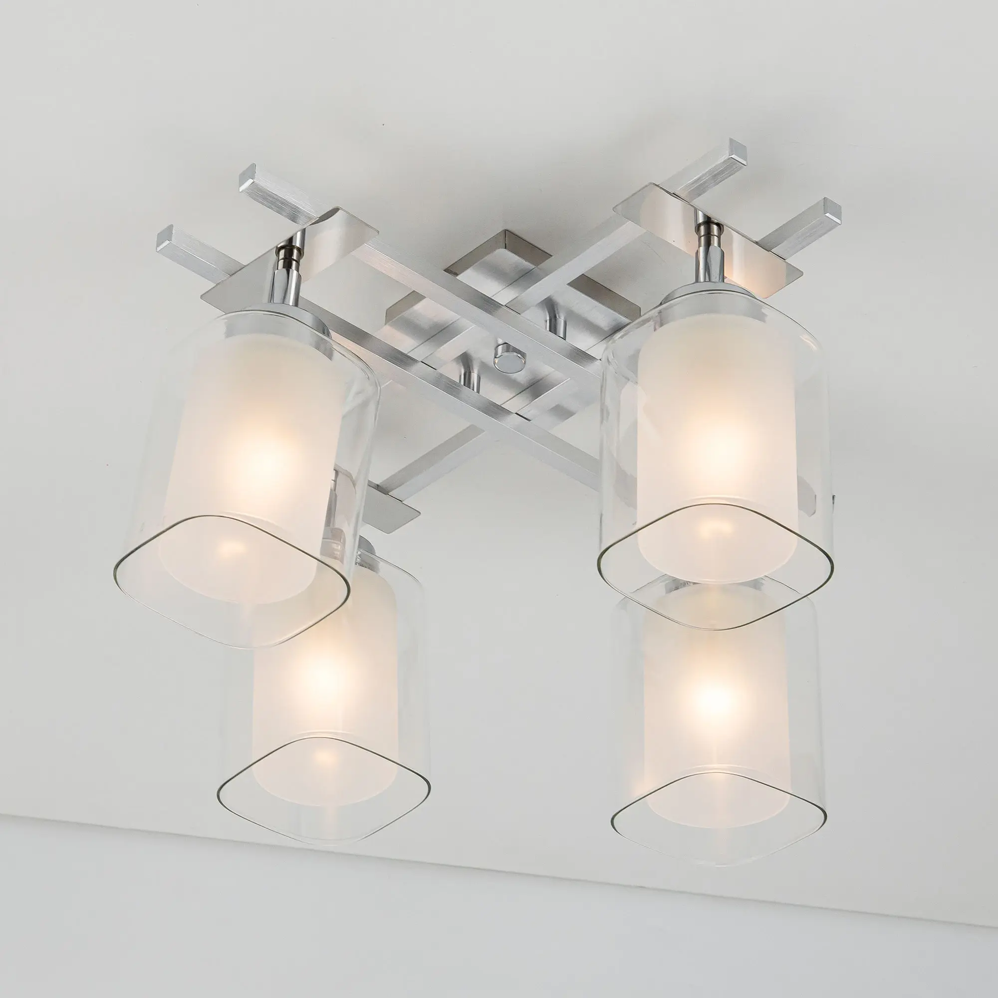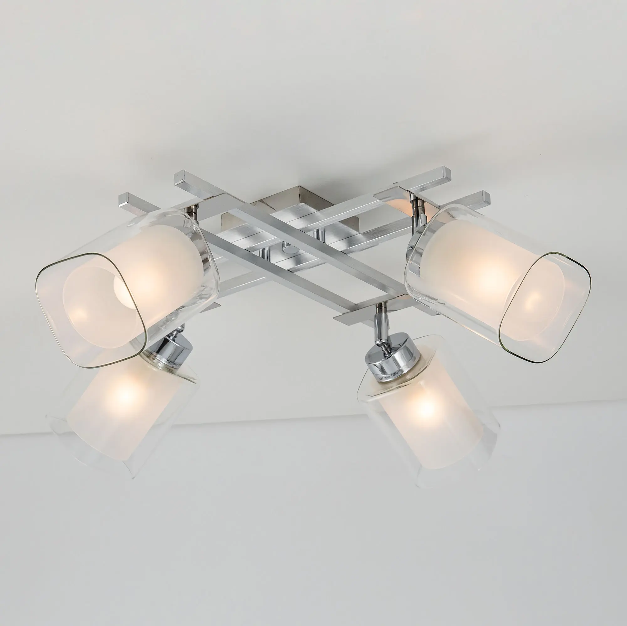Люстра потолочная четырехрожковая Citilux Риволи CL104140 квадратной формы. Корпус светильника изготовлен из металла, цвет алюминий с декоративными хромированными элементами. Плафоны стеклянные двойные. Внешний плафон прозрачный, в сечении имеет квадратную форму. Внутренний плафон полуматовый в форме цилиндра. Плафоны установлены на поворотные шарниры, что позволяет менять внешний вид светильника и направление света. Тип крепления – планка. Модель может работать с двухклавишным выключателем. В светильнике используется лампы с цоколем E27, максимальная мощность лампы накаливания 75Вт. Площадь освещения около 13 кв. м. Модель отлично подойдет в помещения, оформленные в современном стиле.,