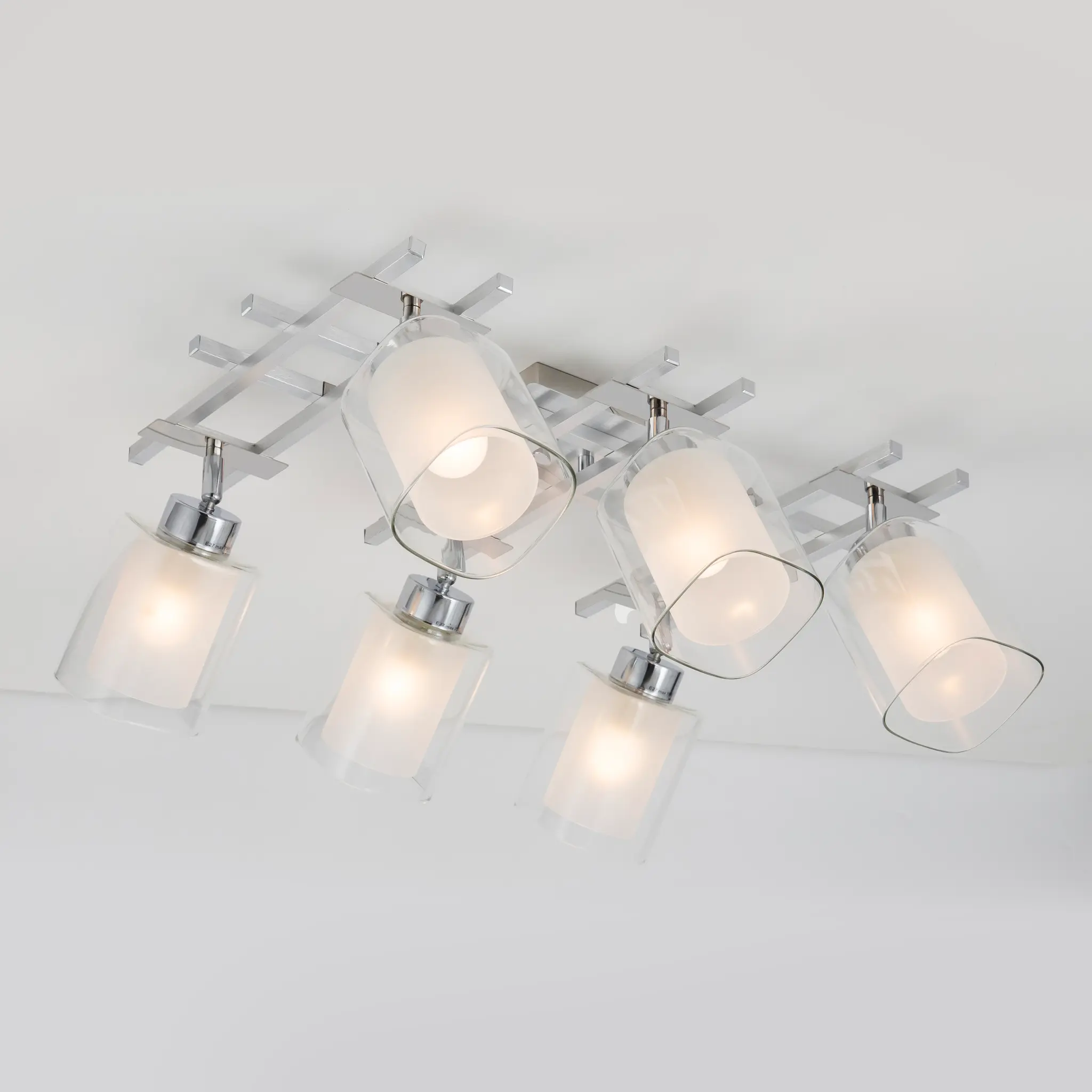 Люстра потолочная шестирехрожковая Citilux Риволи CL104160 прямоугольной формы, с квадратным основанием. Корпус светильника изготовлен из металла, цвет алюминий с декоративными хромированными элементами. Плафоны стеклянные двойные. Внешний плафон прозрачный, в сечении имеет квадратную форму. Внутренний плафон полуматовый в форме цилиндра. Плафоны установлены на поворотные шарниры, что позволяет менять внешний вид светильника и направление света. Тип крепления – планка. Модель может работать с двухклавишным выключателем. В светильнике используется лампы с цоколем E27, максимальная мощность лампы накаливания 75Вт. Площадь освещения около 19 кв. м. Модель отлично подойдет в помещения, оформленные в современном стиле.,