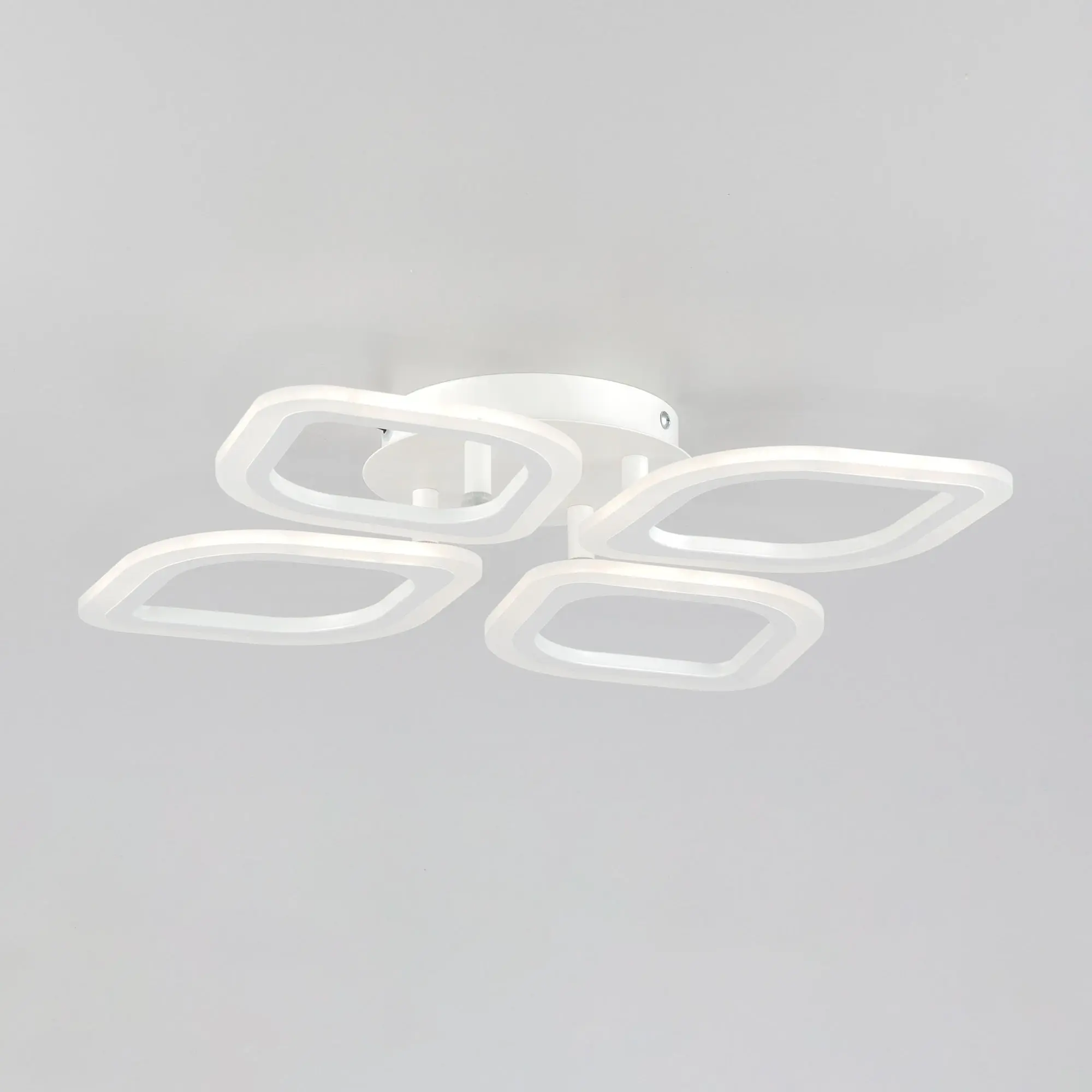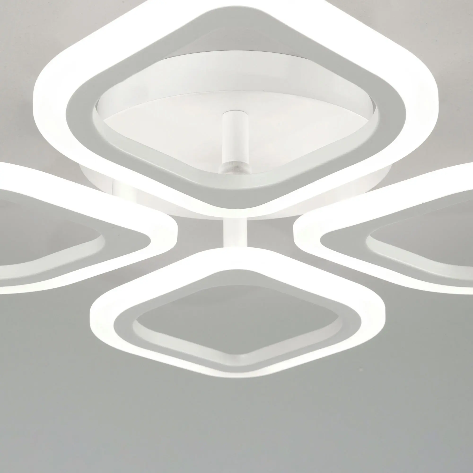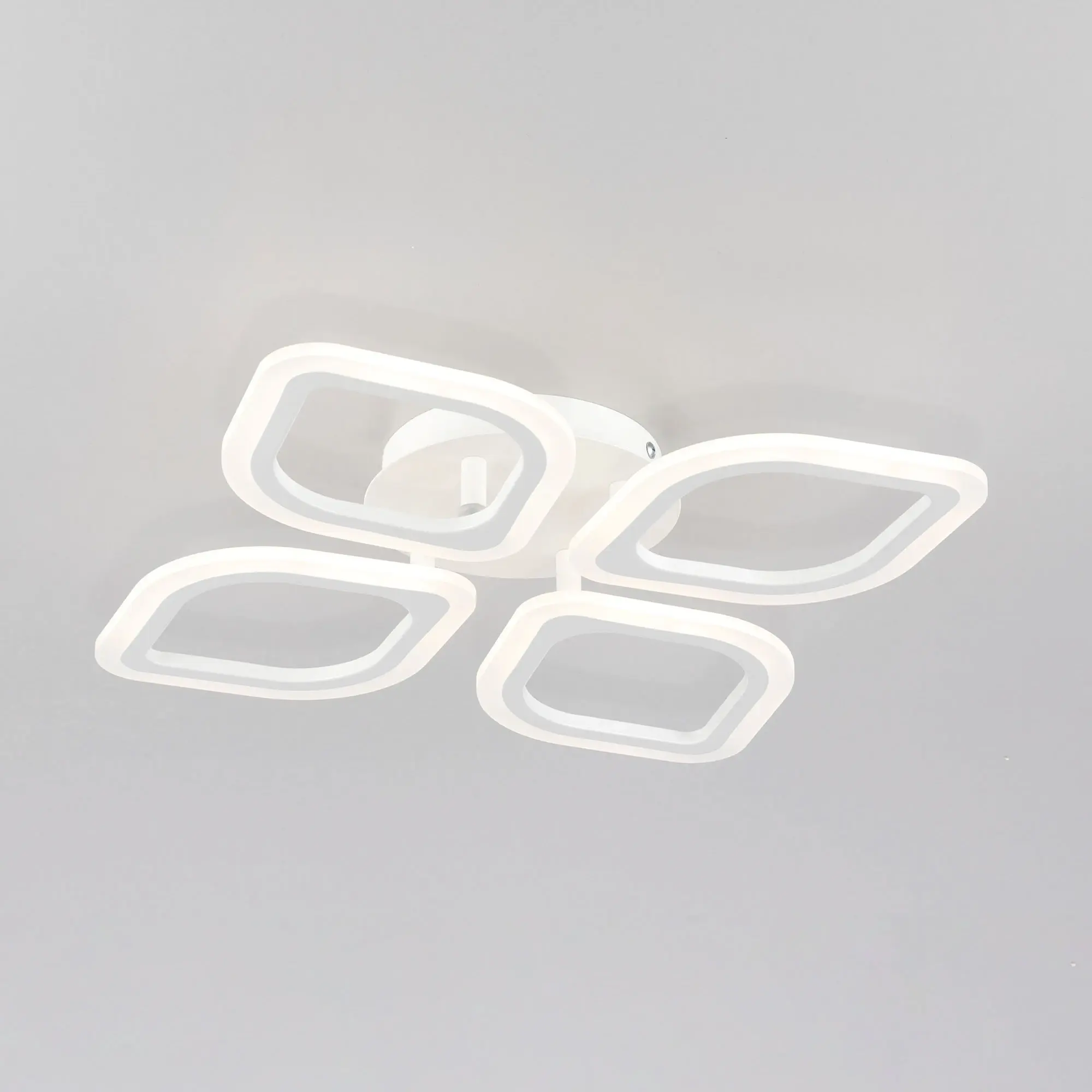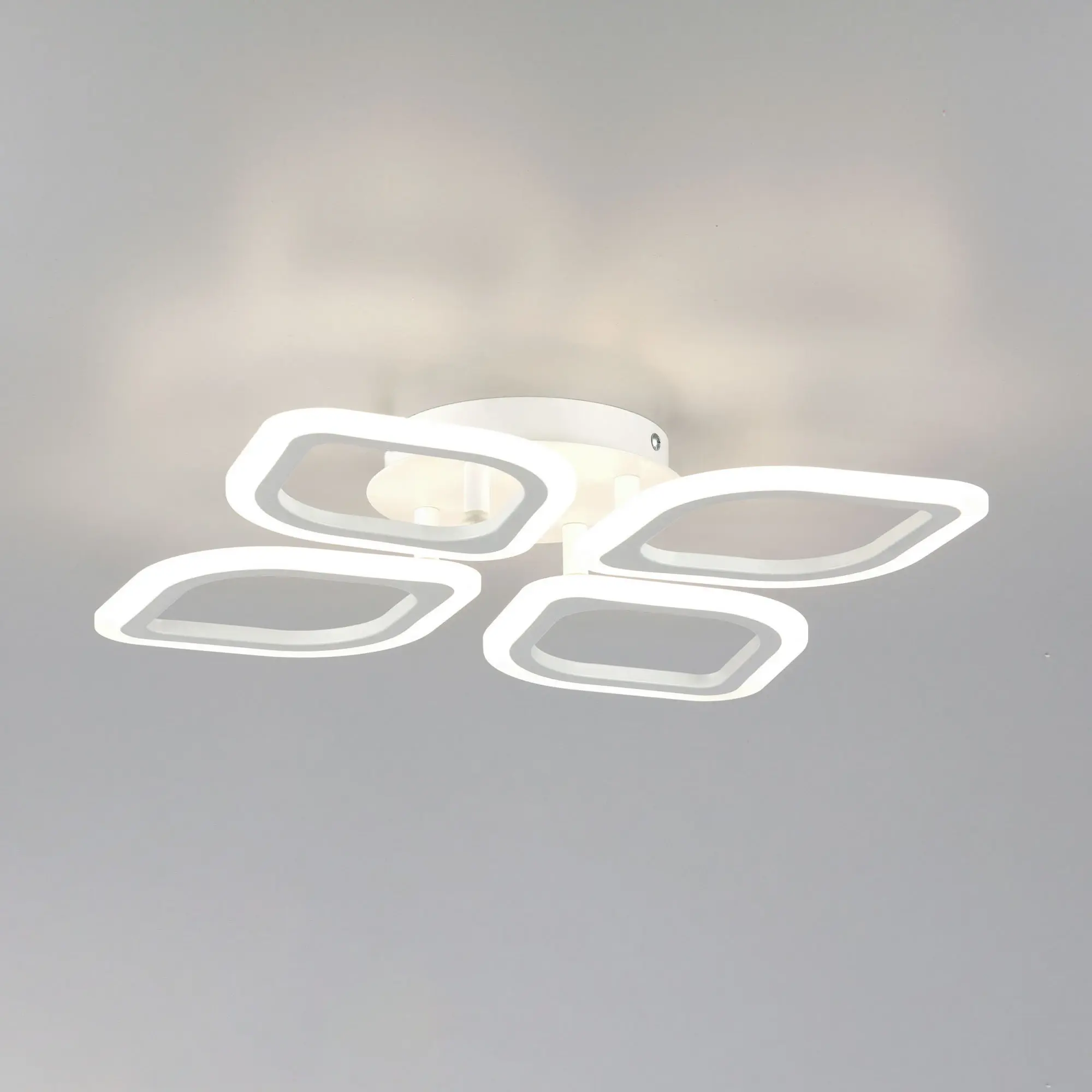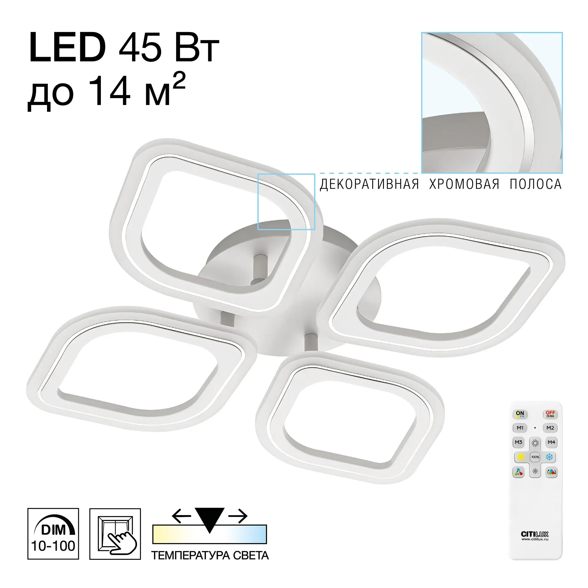 Светодиодная потолочная люстра Citilux Ромби CL236040R с пультом дистанционного управления. Светильник белый матовый, с круглым основанием. Четыре светодиодных модуля плафона, формирующих внешний вид люстры, выполнены в форме лепестков. Корпус плафонов металлический, рассеиватель из оптического полимера. Люстрой можно управлять с помощью пульта дистанционного управления и настенным выключателем. Изделие оснащено яркими светодиодами, с возможностью плавной регулировки яркости от 10% до 100%. Цветовая температура регулируется в диапазоне от 3000К до 5500К, позволяя настроить любые оттенки теплого, нейтрального или холодного света, без мерцания и пульсаций. Есть настраиваемые режимы памяти и таймер выключения. Модель подходит для всех типов потолков, в том числе натяжных, тип крепления – планка. Пульт ДУ в комплекте, тип батареек ААА (батарейками не комплектуется). Люстра плоская – высота всего 8см, размер 40х40см, мощность 45Вт, световой поток 4500Лм
