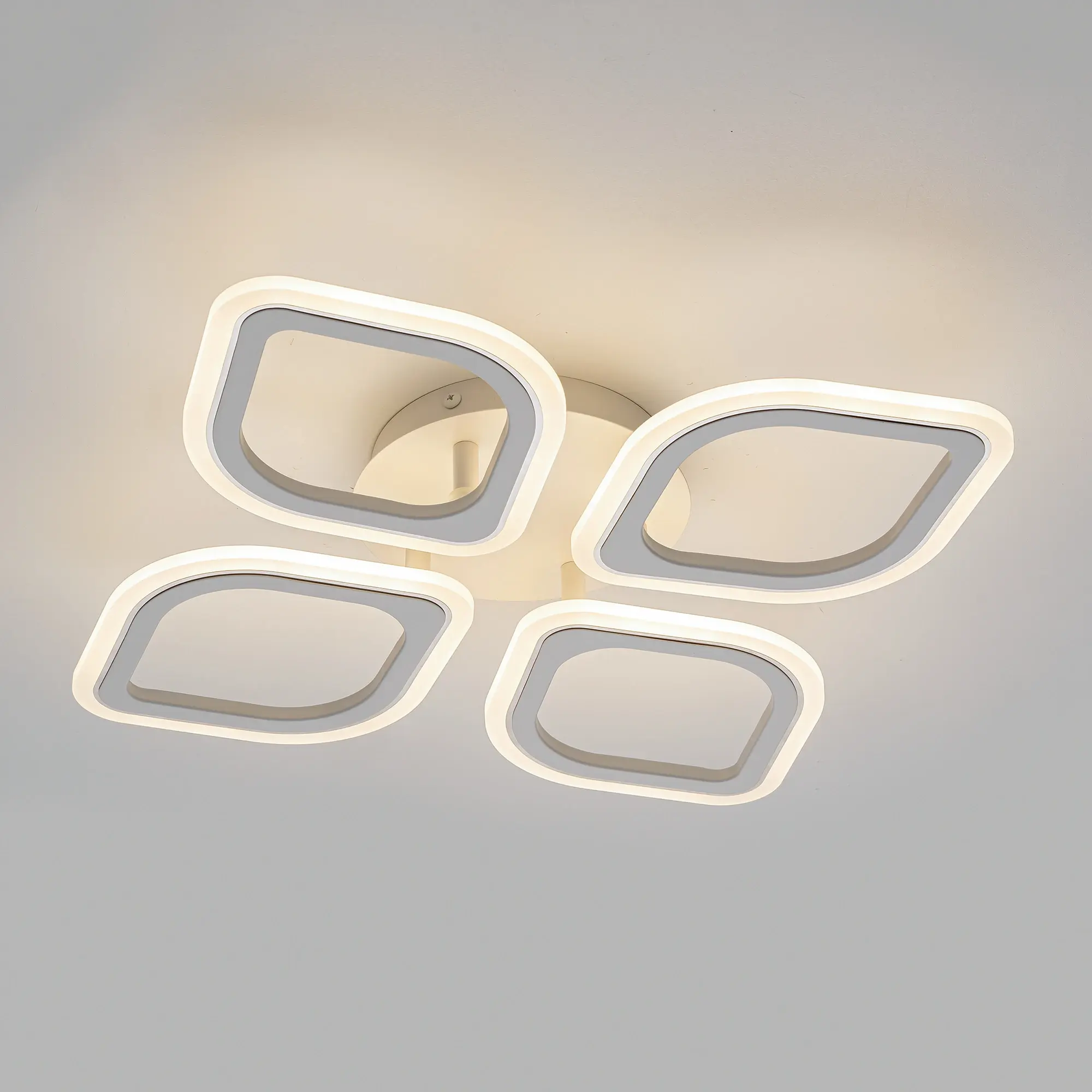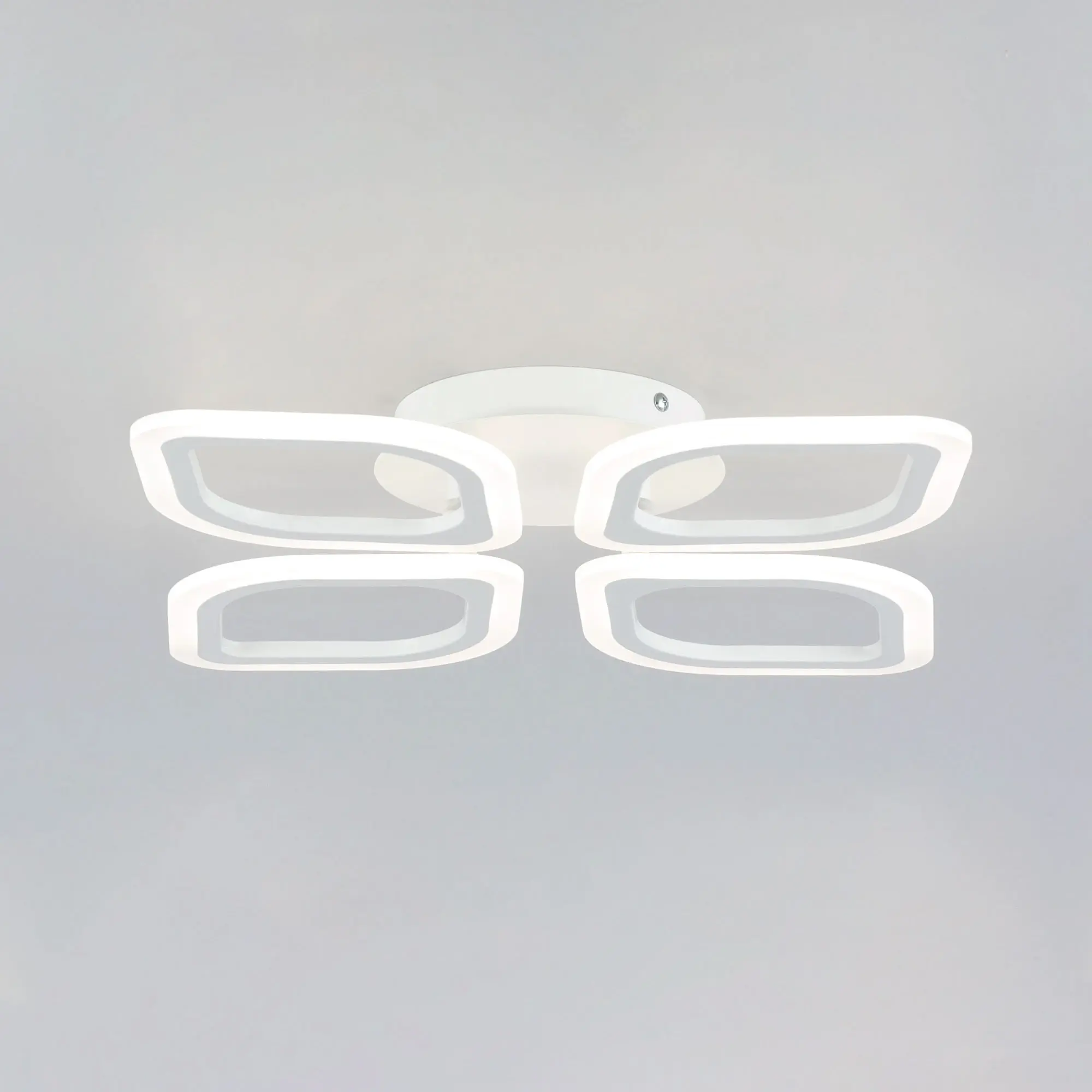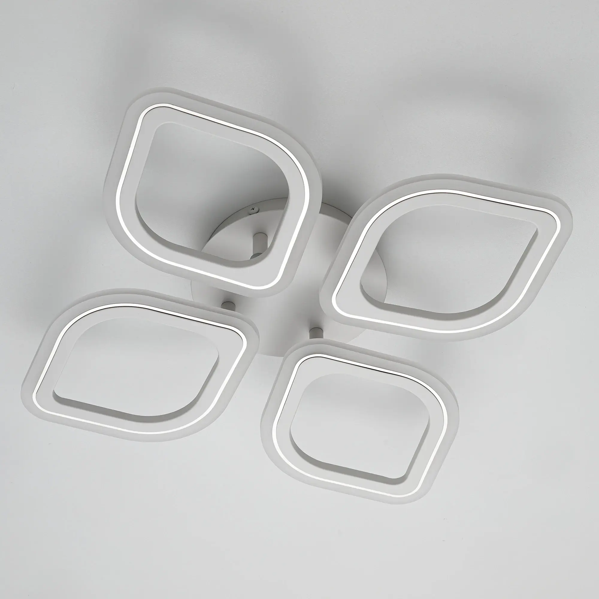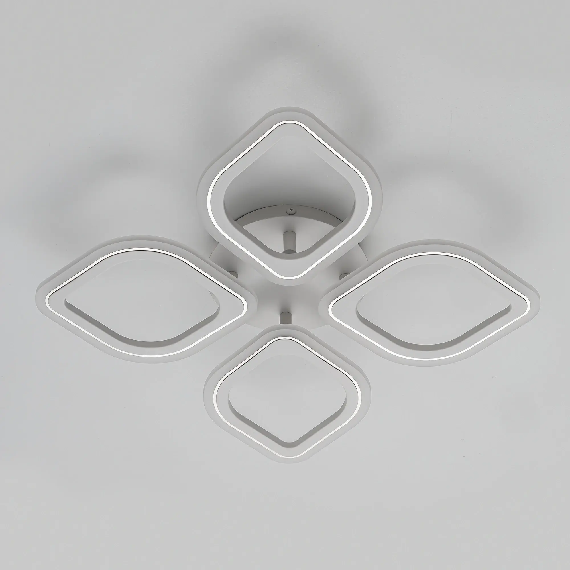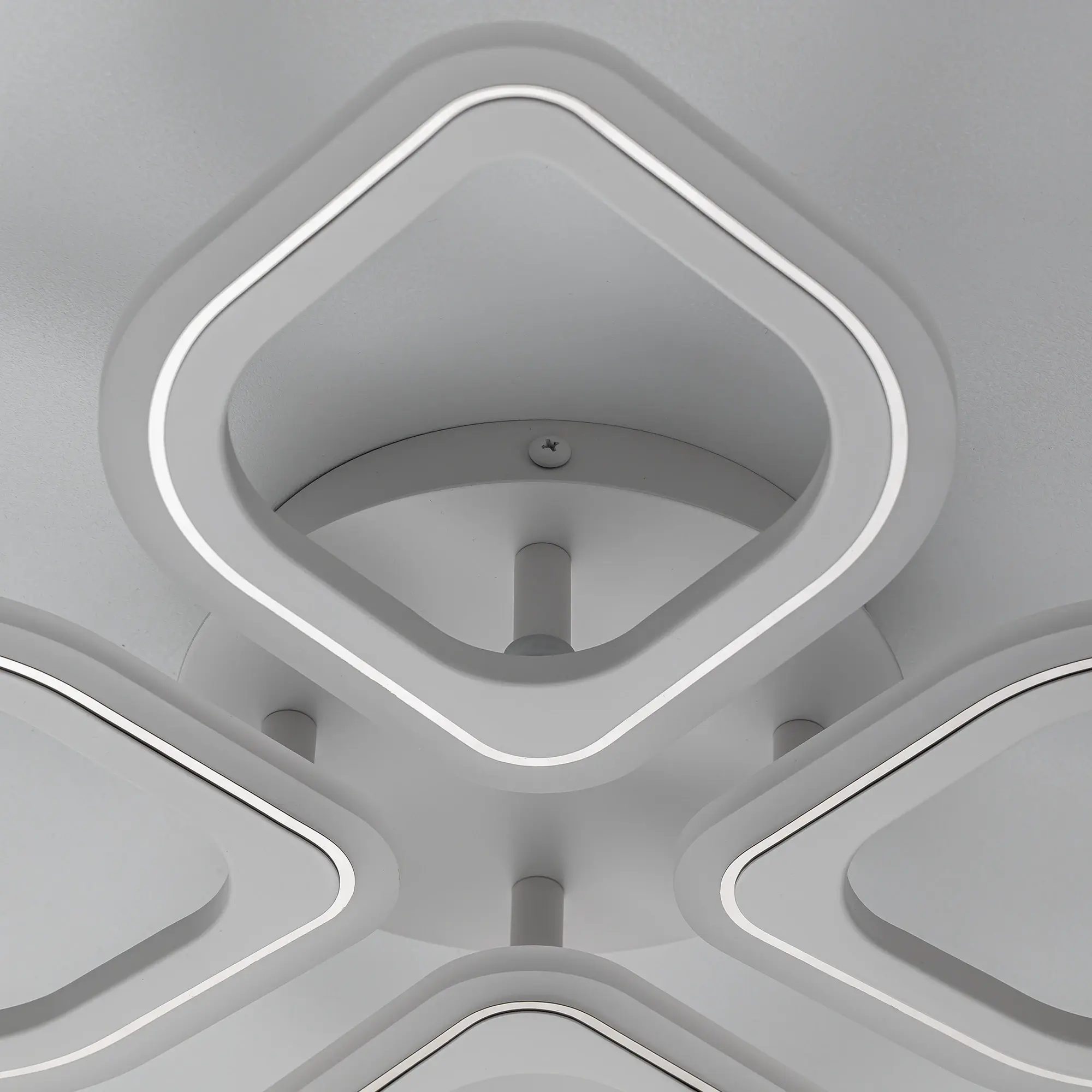 Светодиодная потолочная люстра Citilux Ромби CL236040R с пультом дистанционного управления. Светильник белый матовый, с круглым основанием. Четыре светодиодных модуля плафона, формирующих внешний вид люстры, выполнены в форме лепестков. Корпус плафонов металлический, рассеиватель из оптического полимера. Люстрой можно управлять с помощью пульта дистанционного управления и настенным выключателем. Изделие оснащено яркими светодиодами, с возможностью плавной регулировки яркости от 10% до 100%. Цветовая температура регулируется в диапазоне от 3000К до 5500К, позволяя настроить любые оттенки теплого, нейтрального или холодного света, без мерцания и пульсаций. Есть настраиваемые режимы памяти и таймер выключения. Модель подходит для всех типов потолков, в том числе натяжных, тип крепления – планка. Пульт ДУ в комплекте, тип батареек ААА (батарейками не комплектуется). Люстра плоская – высота всего 8см, размер 40х40см, мощность 45Вт, световой поток 4500Лм