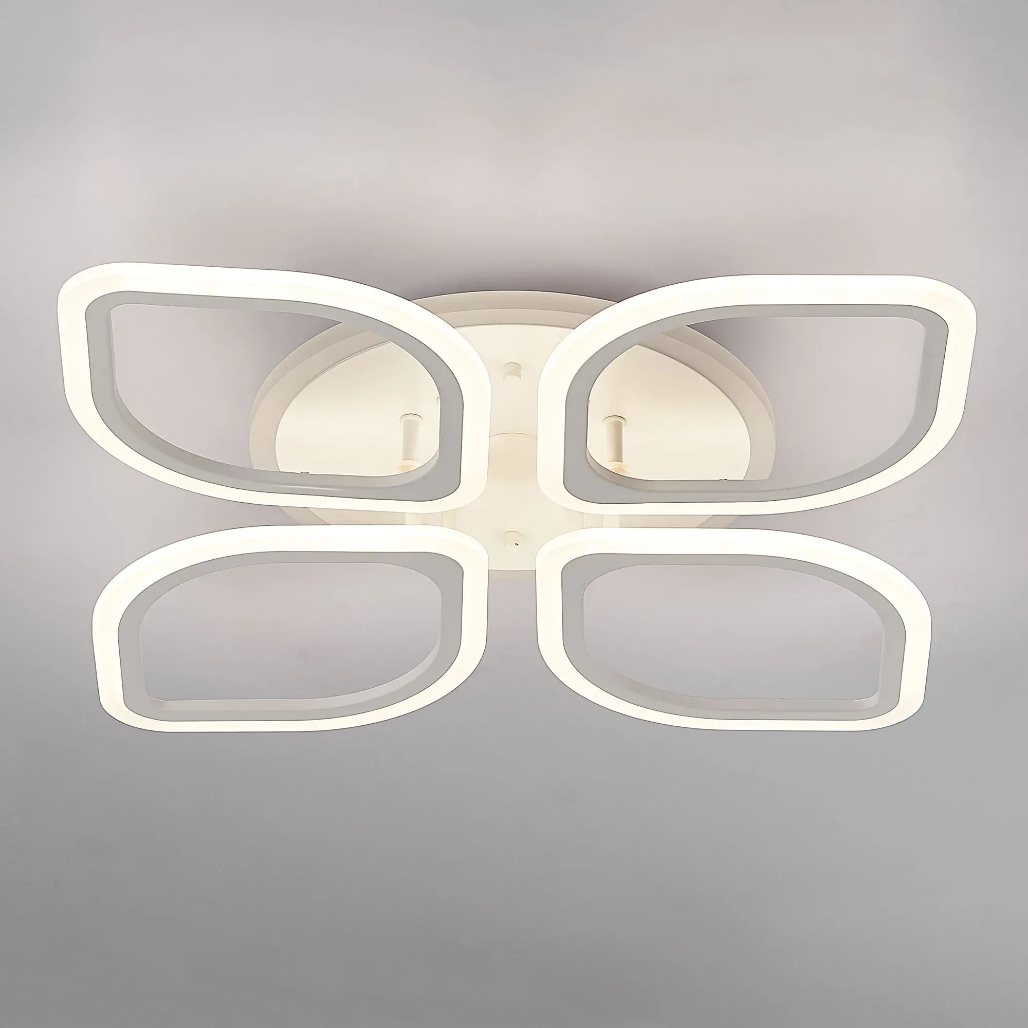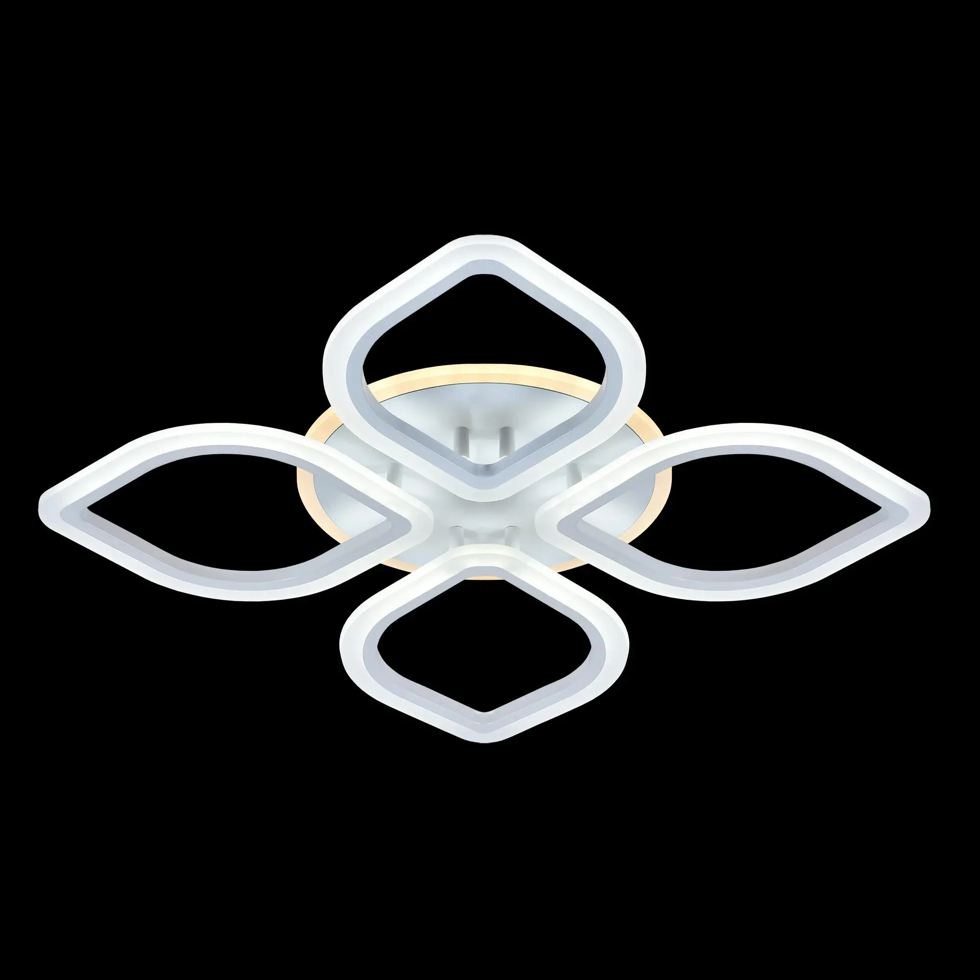 Светильник белый матовый, с круглым основанием. Четыре светодиодных модуля плафона, формирующих внешний вид люстры, выполнены в форме лепестков. Корпус плафонов белого цвета изготовлен из металла, рассеиватель белый матовый из оптического полимера. Модель подходит для всех типов потолков, в том числе натяжных.