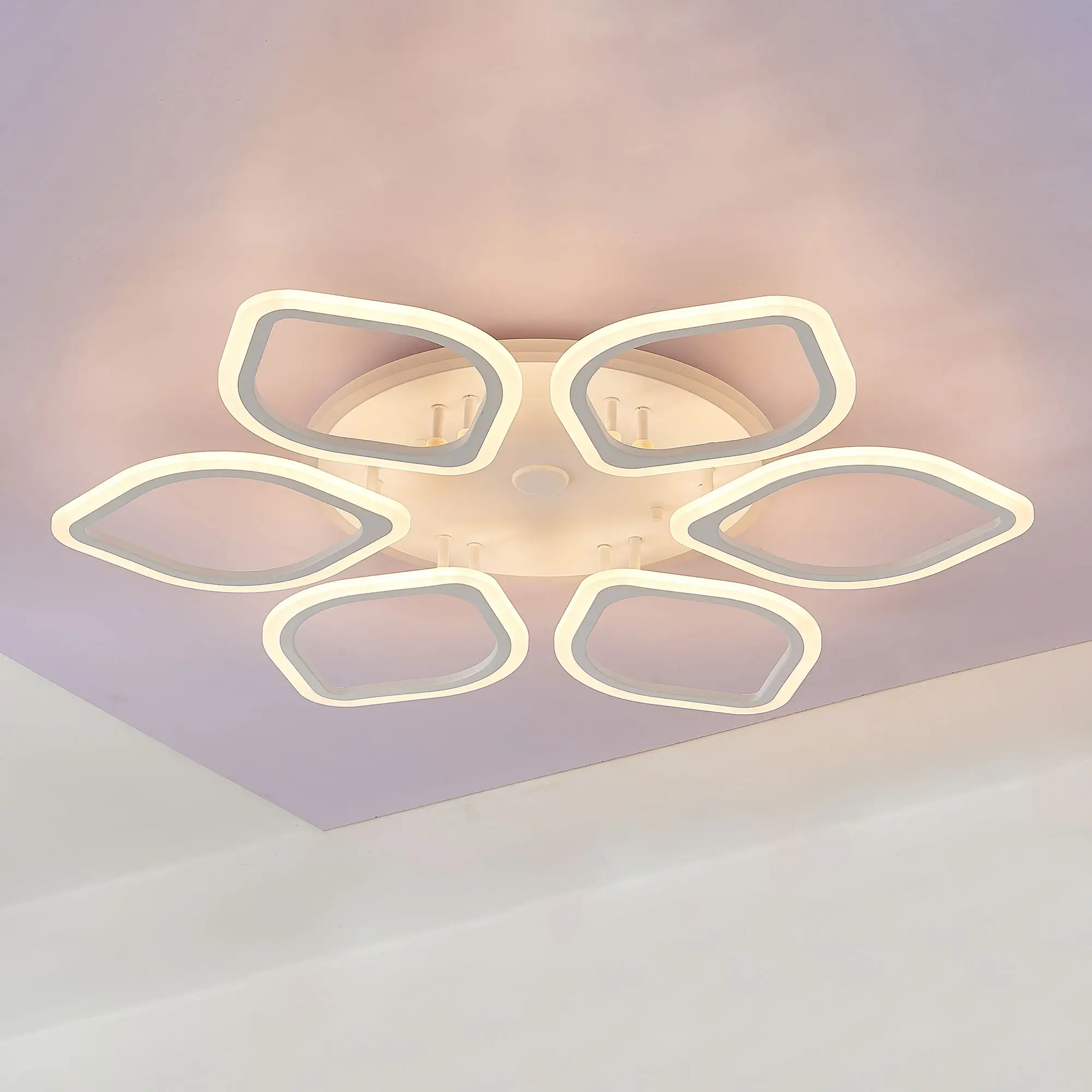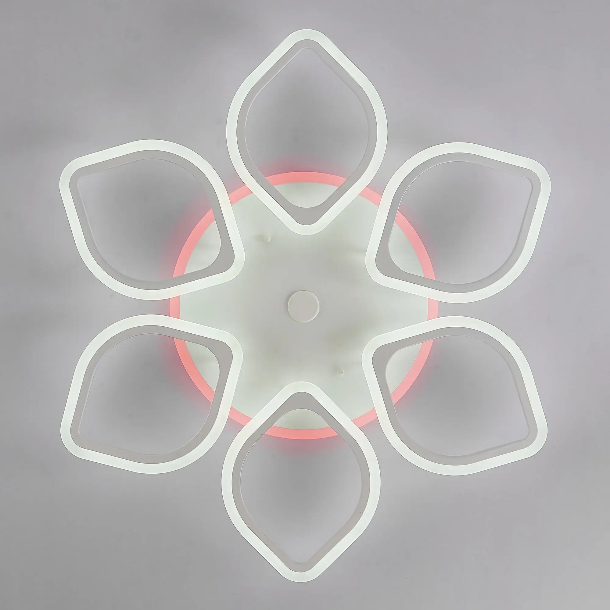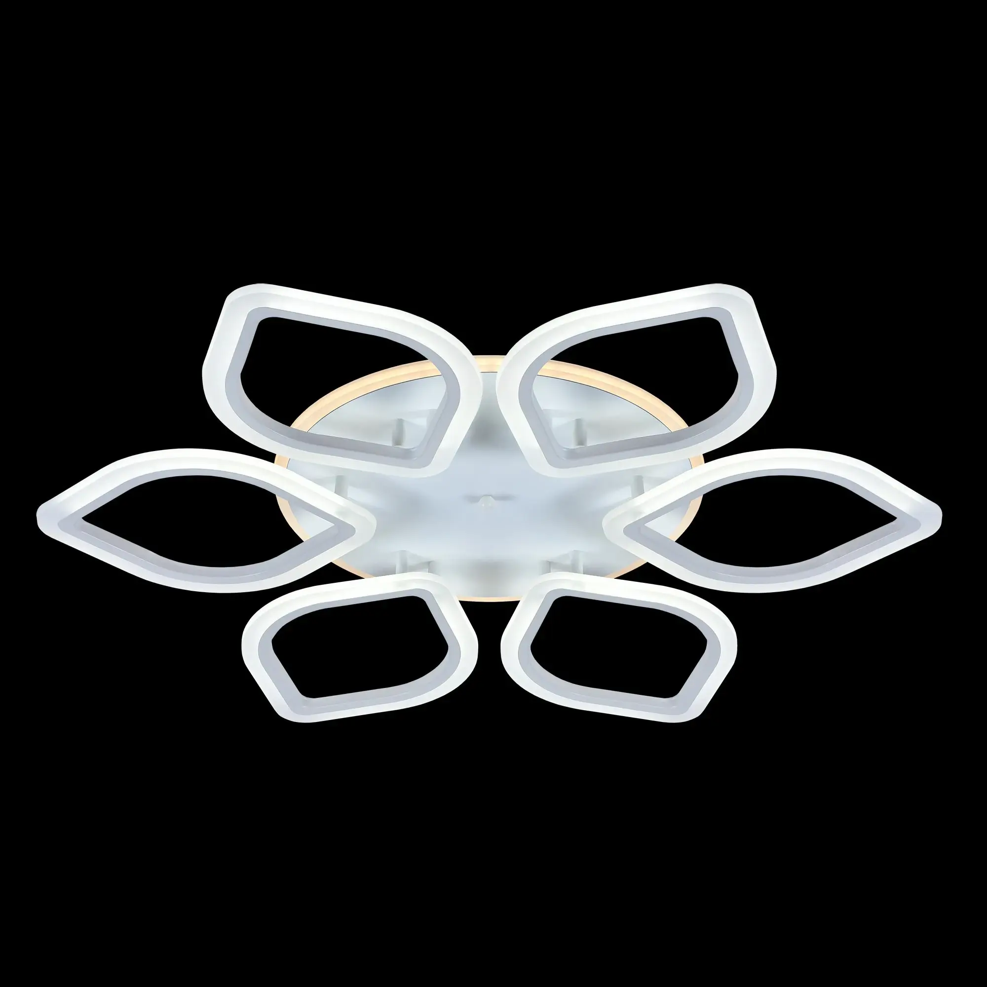 Светильник белый матовый, с круглым основанием. Шесть светодиодных модулей плафонов, формирующих внешний вид люстры, выполнены в форме лепестков. Корпус плафонов белого цвета изготовлен из металла, рассеиватель белый матовый из оптического полимера. Модель подходит для всех типов потолков, в том числе натяжных.