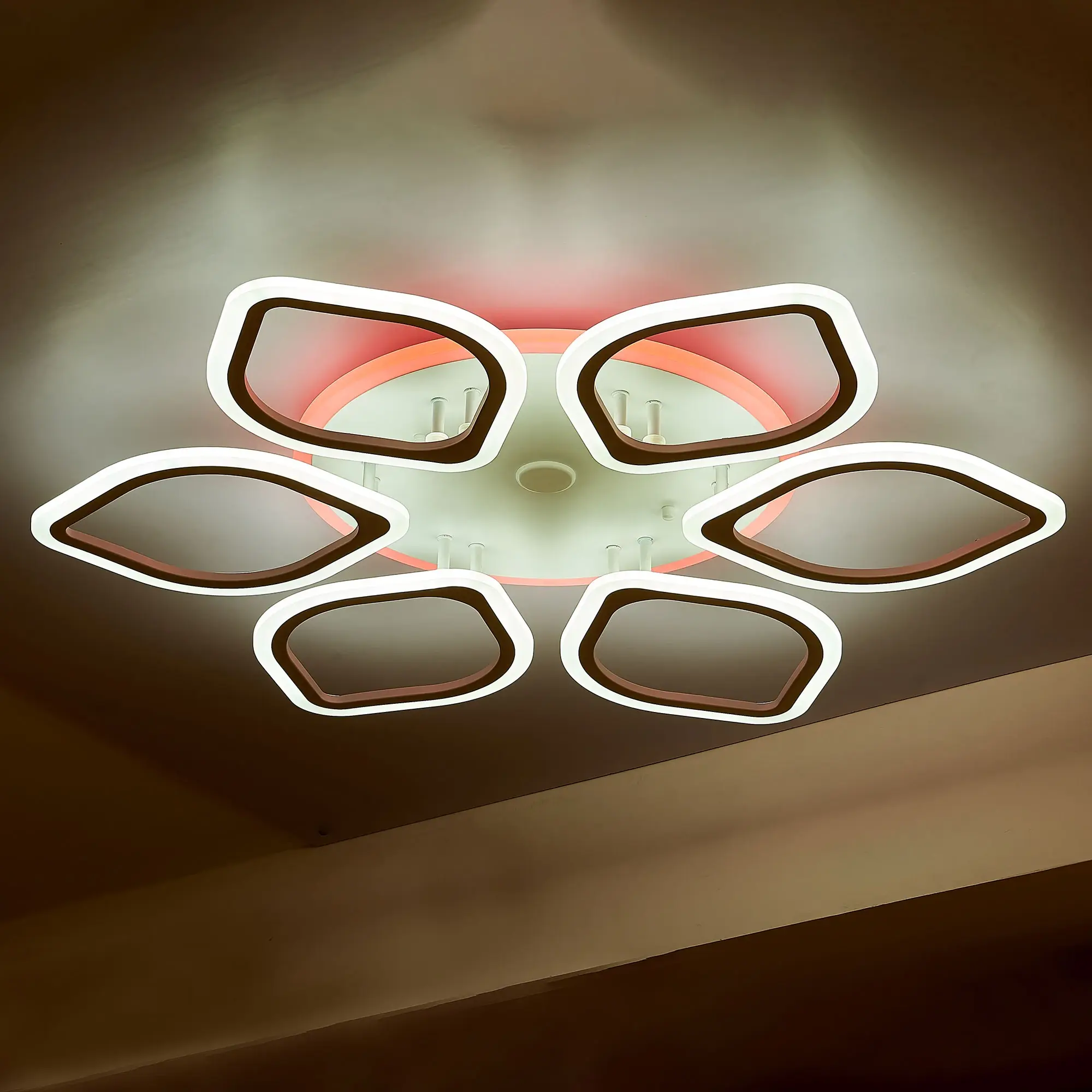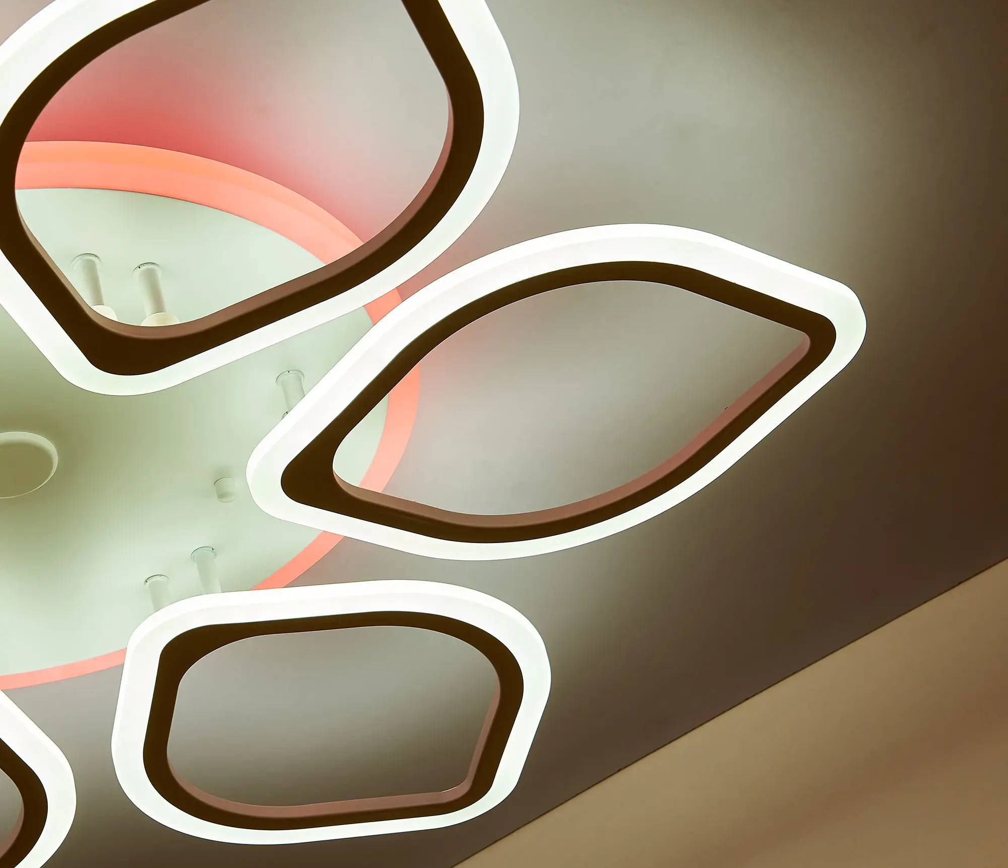 Модель оснащена мощными светодиодами, с возможностью плавной регулировки яркости от 10 до 100%. Цветовая температура регулируется в диапазоне от 3000К до 5500К, позволяя настроить любые оттенки теплого, нейтрального или холодного света. В основании светильника установлена независимая цветная RGB подсветка. Мощность люстры 80Вт, 6500Лм, площадь освещения при стандартной высоте потолков около 23 кв. метра. Пульт ДУ в комплекте, тип батареек ААА (батарейками не комплектуется).