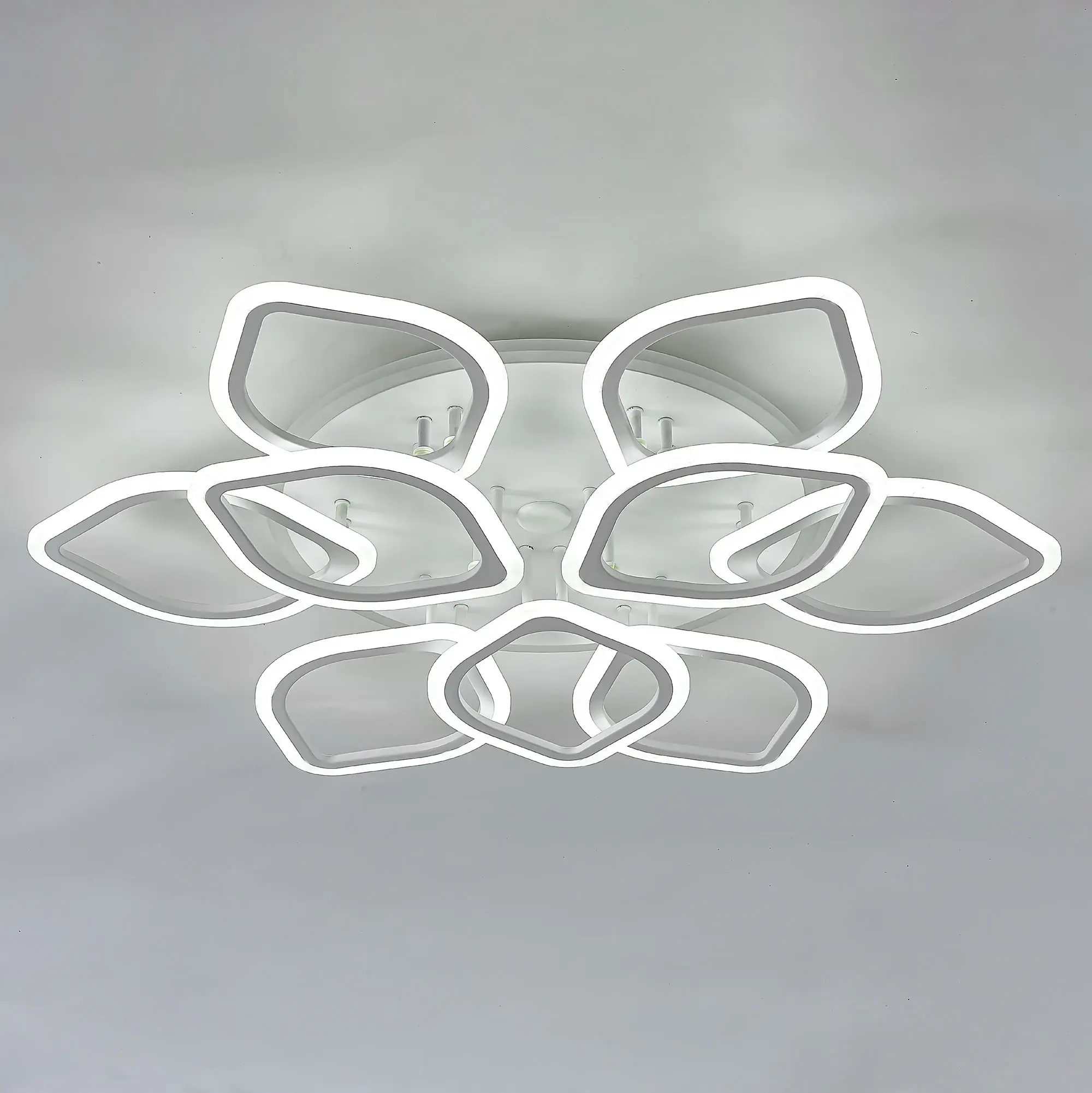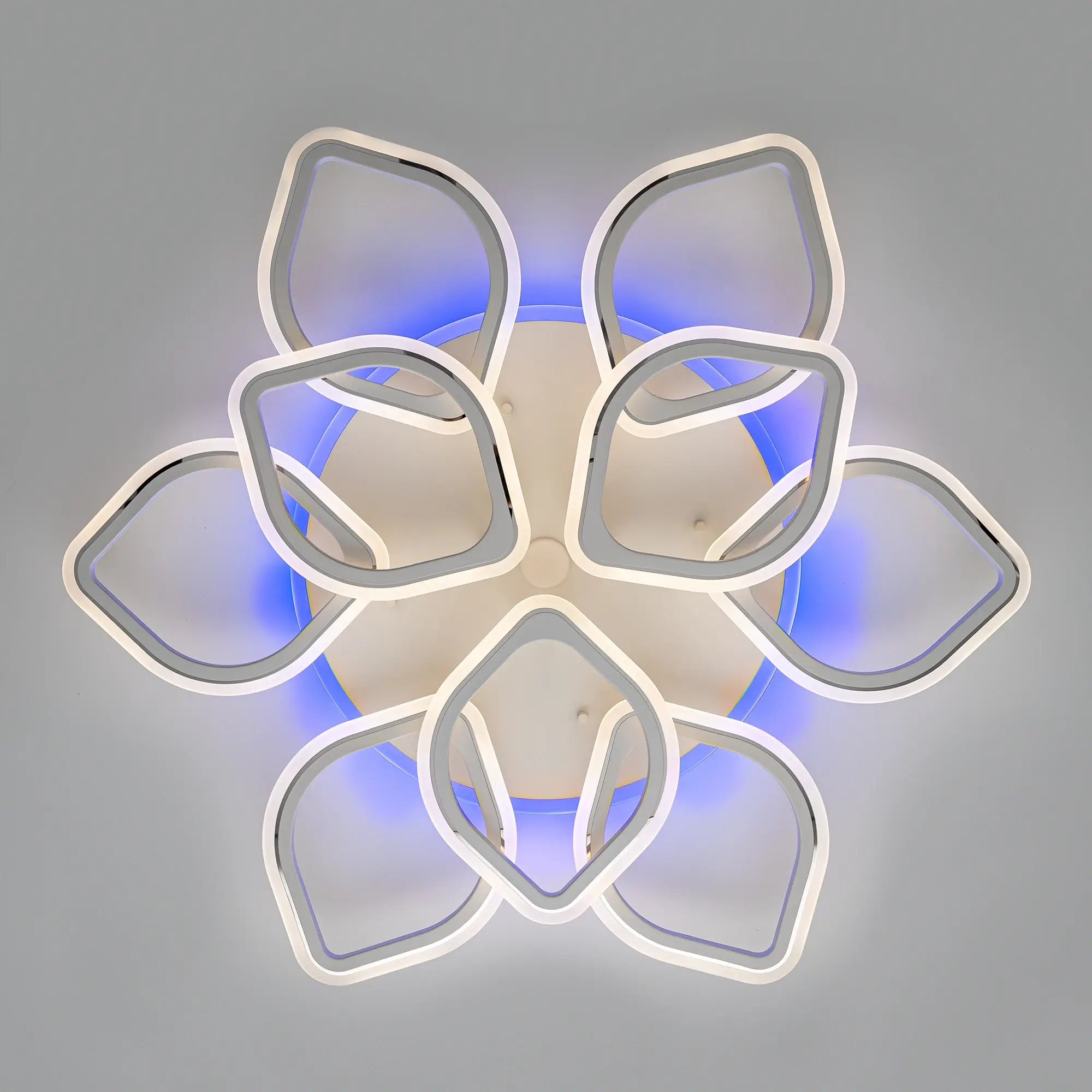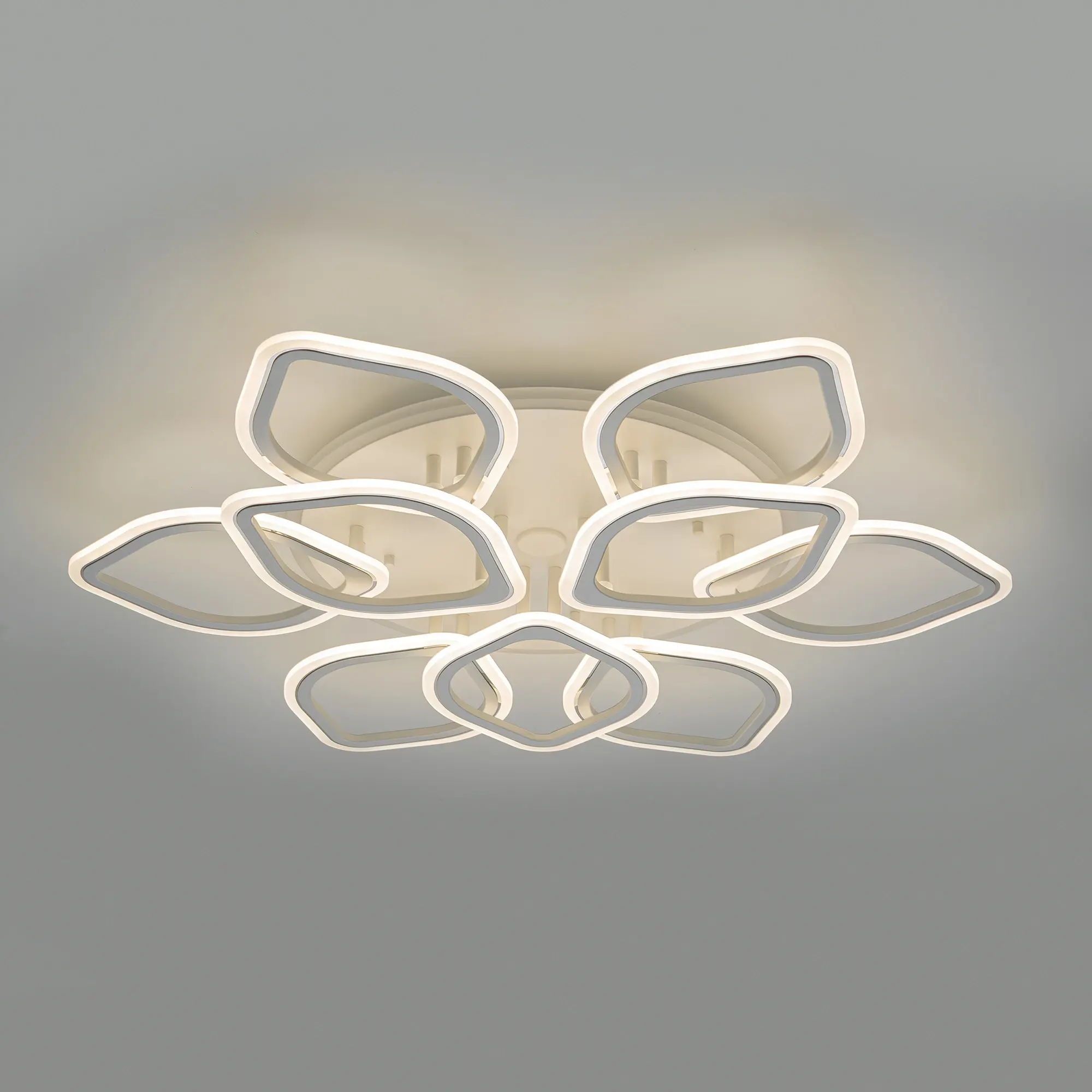 Светильник белый матовый, с круглым основанием. Девять светодиодных модулей плафонов, формирующих внешний вид люстры, выполнены в форме лепестков. Корпус плафонов белого цвета изготовлен из металла, рассеиватель белый матовый из оптического полимера. Модель подходит для всех типов потолков, в том числе натяжных.