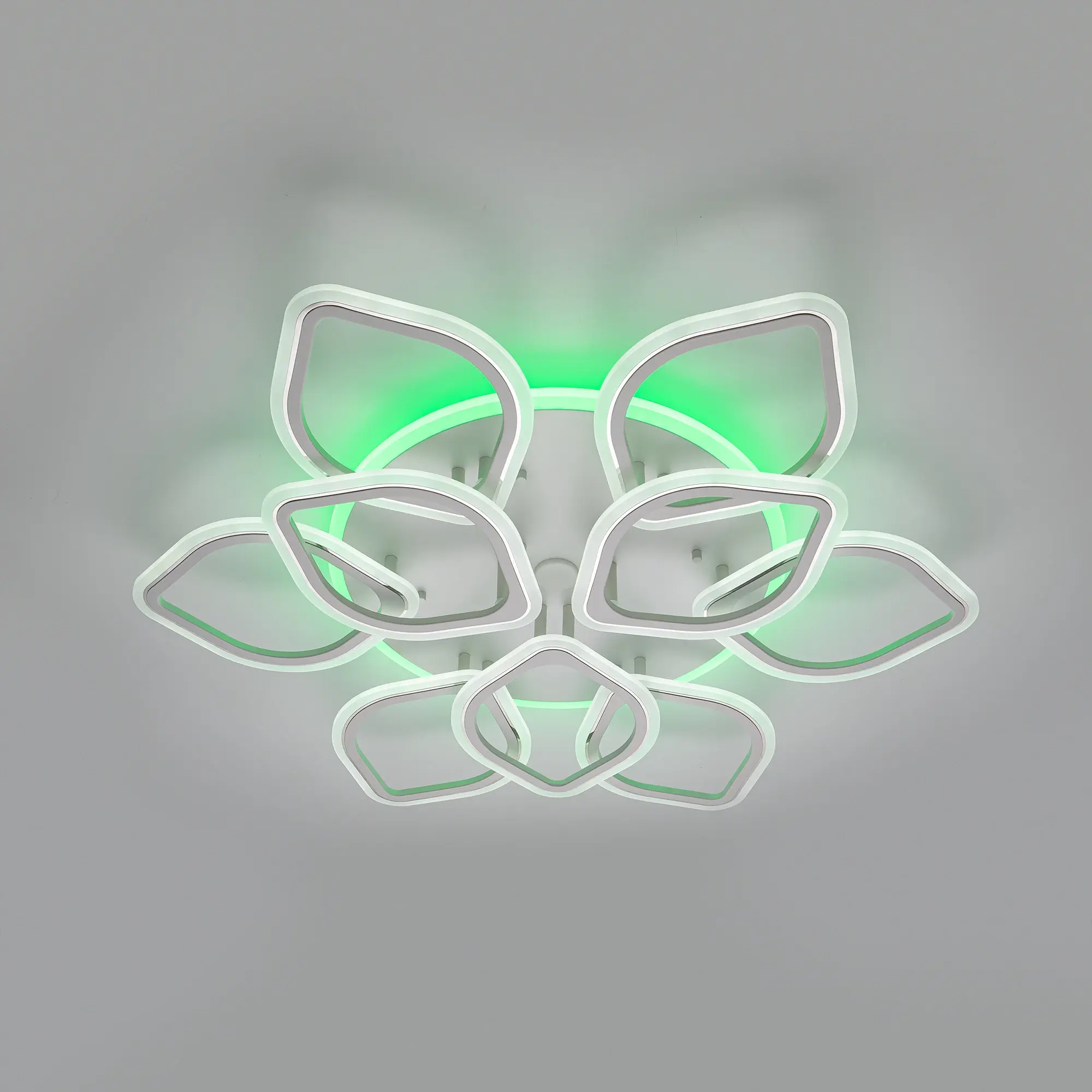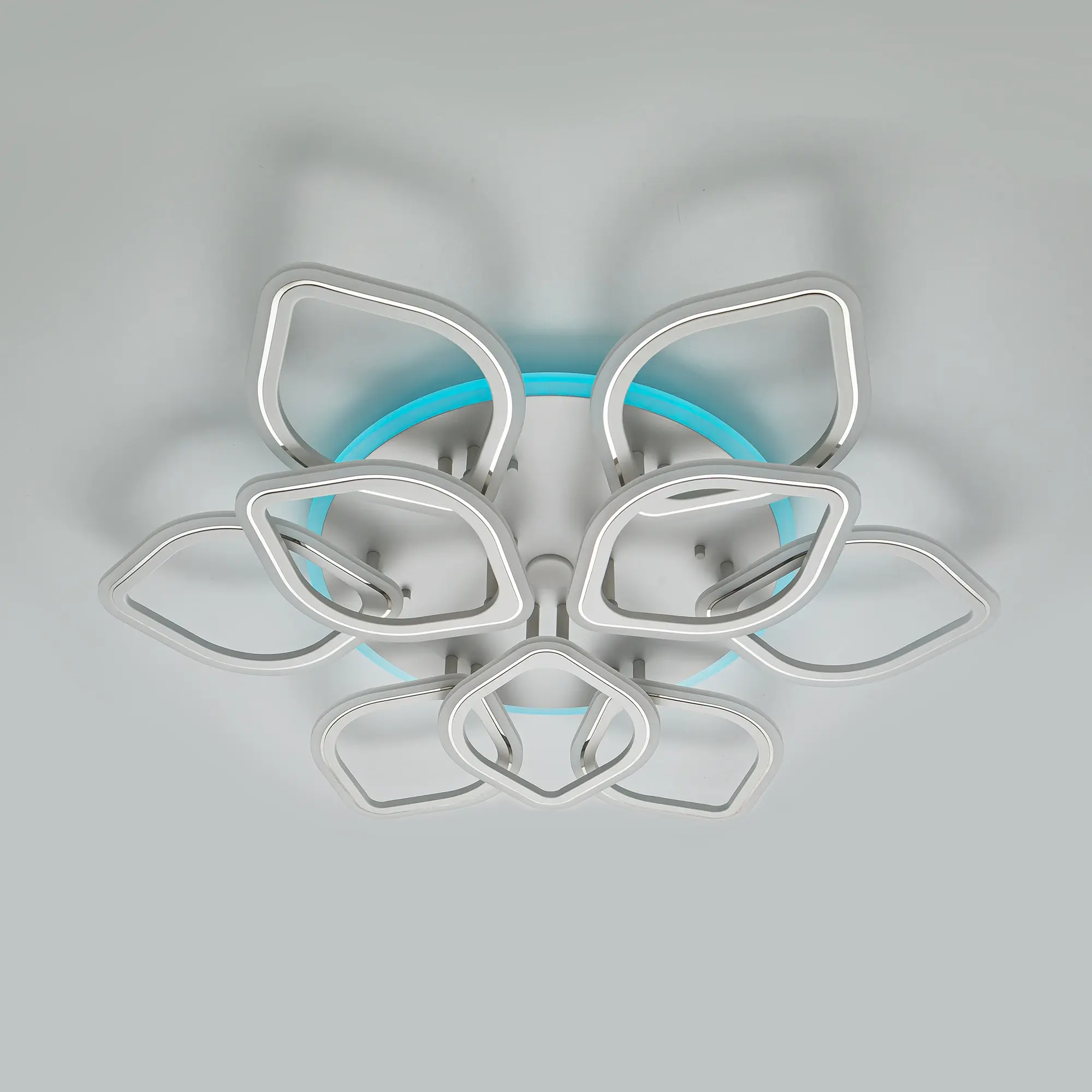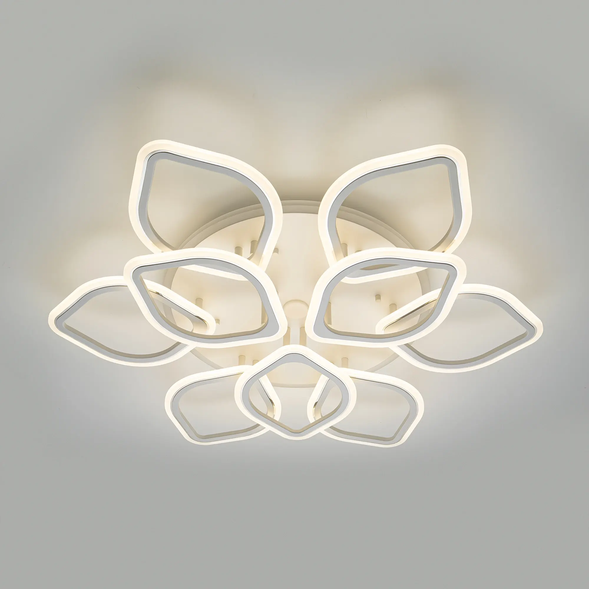 Светильник белый матовый, с круглым основанием. Девять светодиодных модулей плафонов, формирующих внешний вид люстры, выполнены в форме лепестков. Корпус плафонов белого цвета изготовлен из металла, рассеиватель белый матовый из оптического полимера. Модель подходит для всех типов потолков, в том числе натяжных.