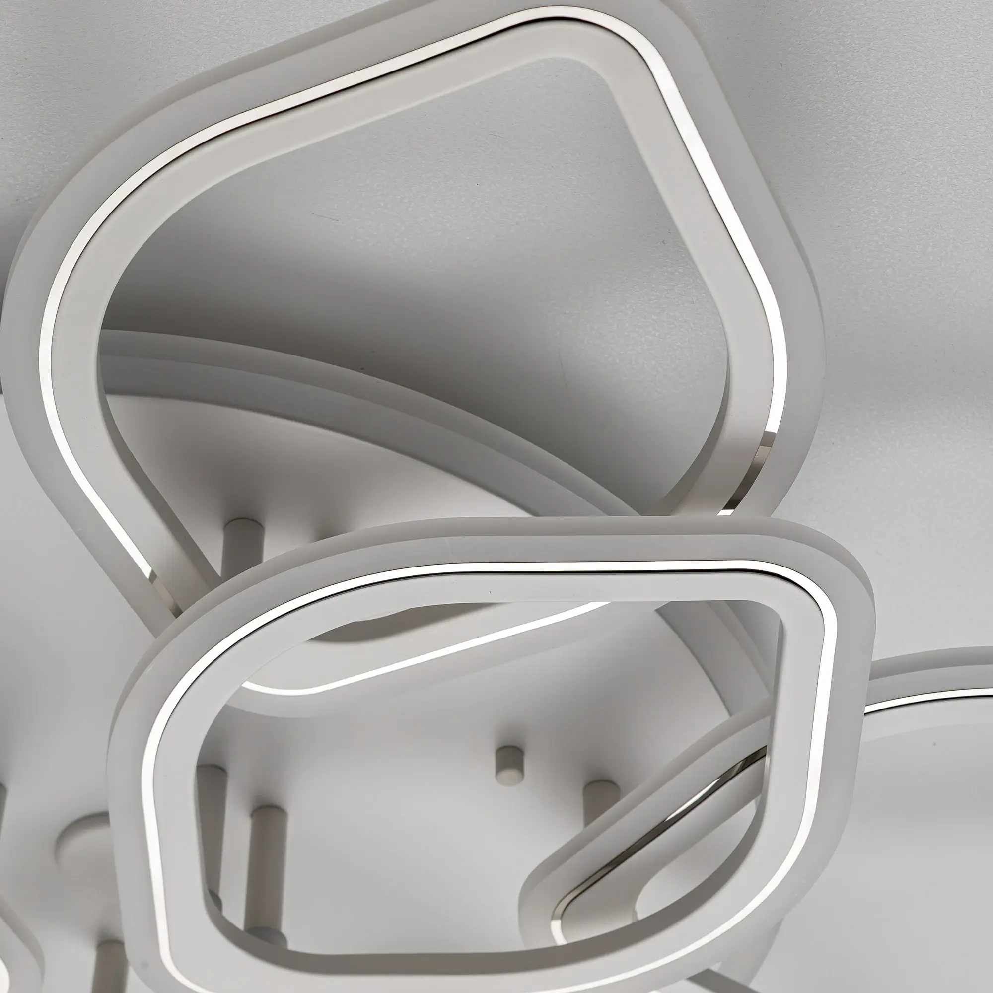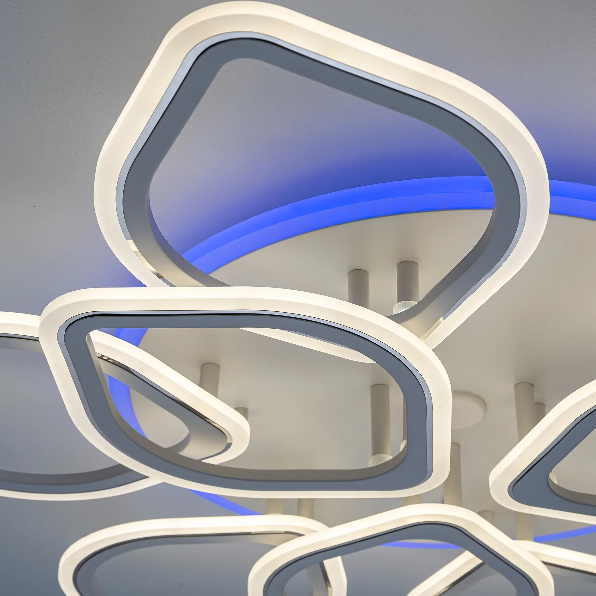 Модель оснащена мощными светодиодами, с возможностью плавной регулировки яркости от 10 до 100%. Цветовая температура регулируется в диапазоне от 3000К до 5500К, позволяя настроить любые оттенки теплого, нейтрального или холодного света. В основании светильника установлена независимая цветная RGB подсветка. Мощность люстры 105Вт, 9500Лм, площадь освещения при стандартной высоте потолков около 29 кв. метра. Пульт ДУ в комплекте, тип батареек ААА (батарейками не комплектуется).
