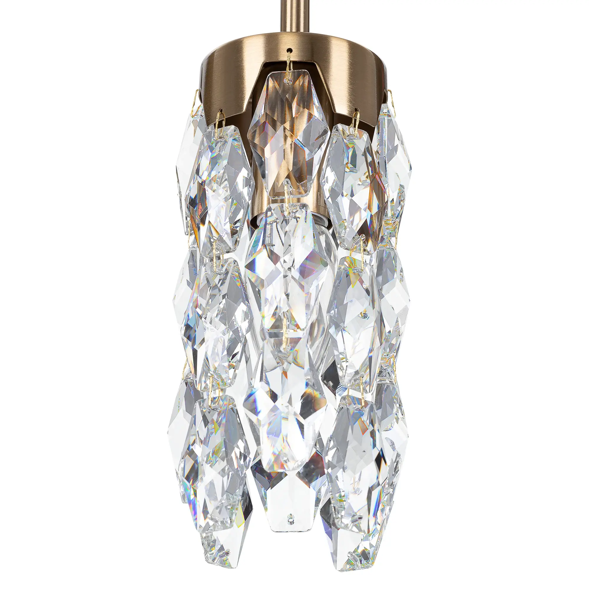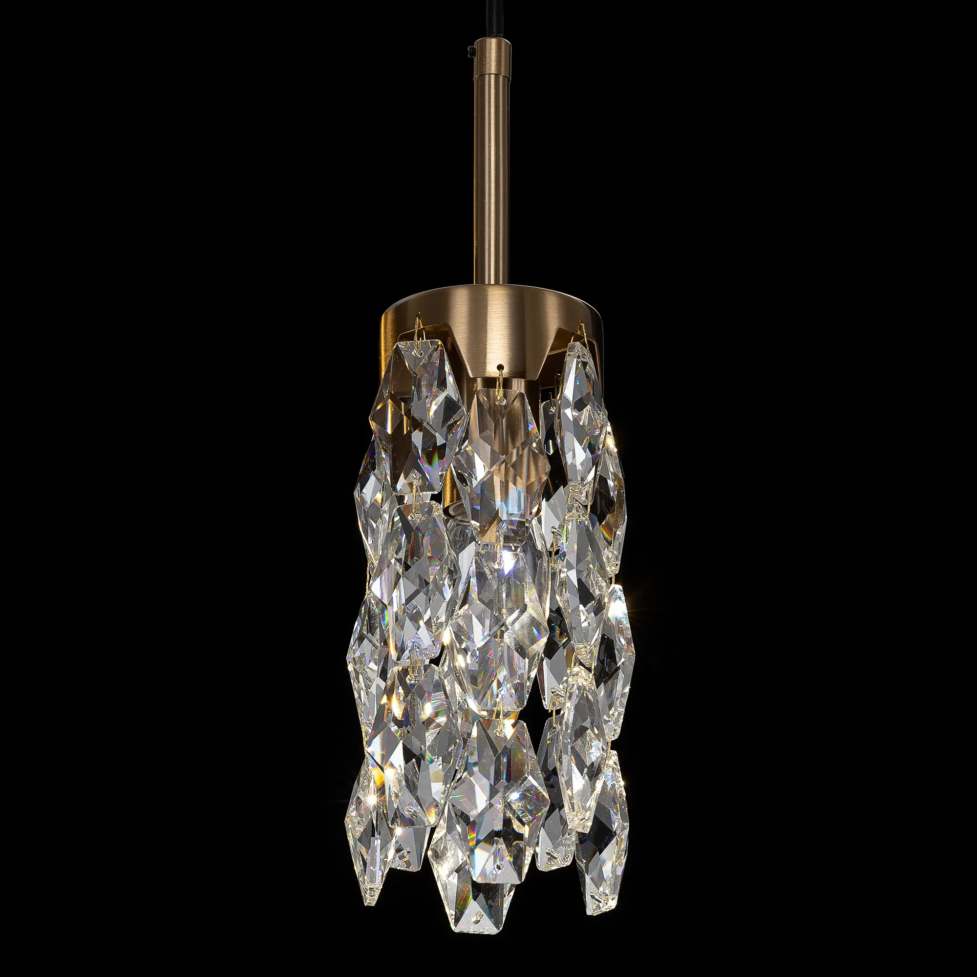 Каркас светильника — металлический, основание круглое, бронзового оттенка, на нем закреплен один подвес. Бронзовый плафон — цилиндрической формы, с хрустальными подвесками. Высоту подвеса можно отрегулировать, подстраиваясь под высоту потолков в помещении. Для изделия используется лампочка с цоколем Е14, максимальная мощность для ламп накаливания — 40Вт.