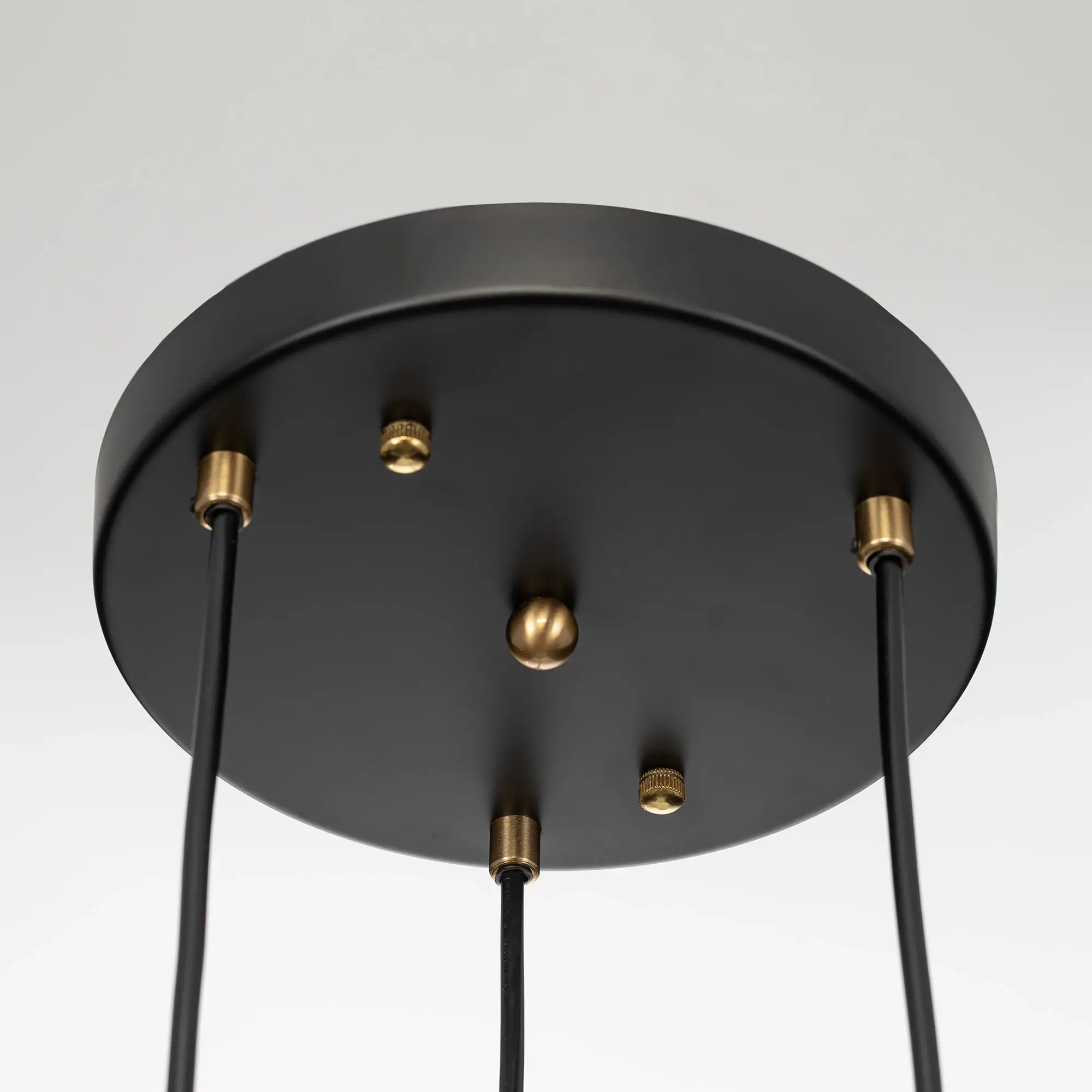 Каркас светильника — металлический, основание круглое, черного оттенка, на нем закреплено три подвеса. Бронзовые плафоны — цилиндрической формы, с хрустальными подвесками. Высоту подвесов можно отрегулировать, подстраиваясь под высоту потолков в помещении. Для изделия используются три лампочки с цоколем Е14, максимальная мощность для ламп накаливания — 40Вт.