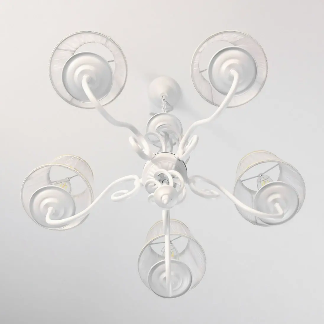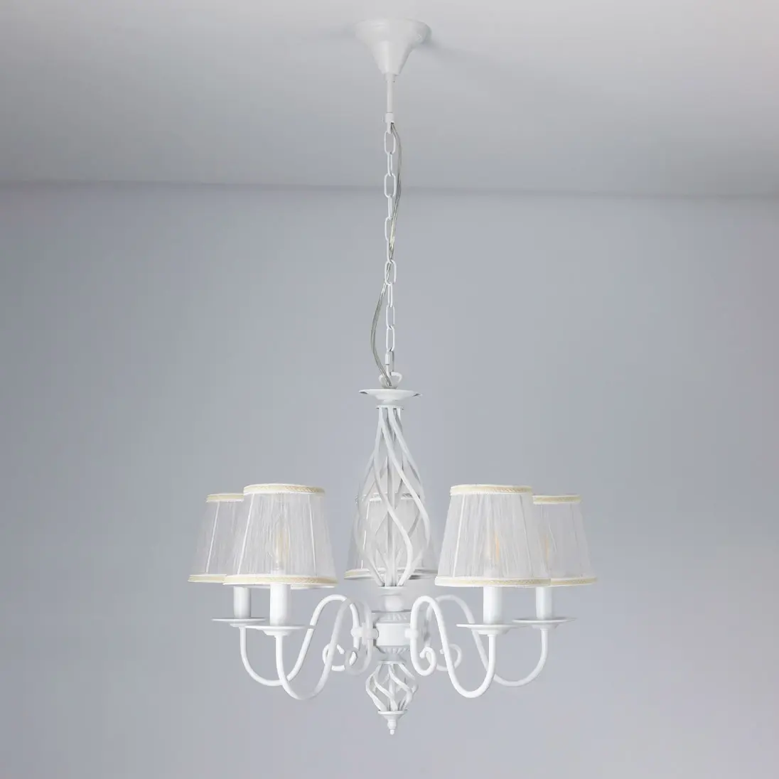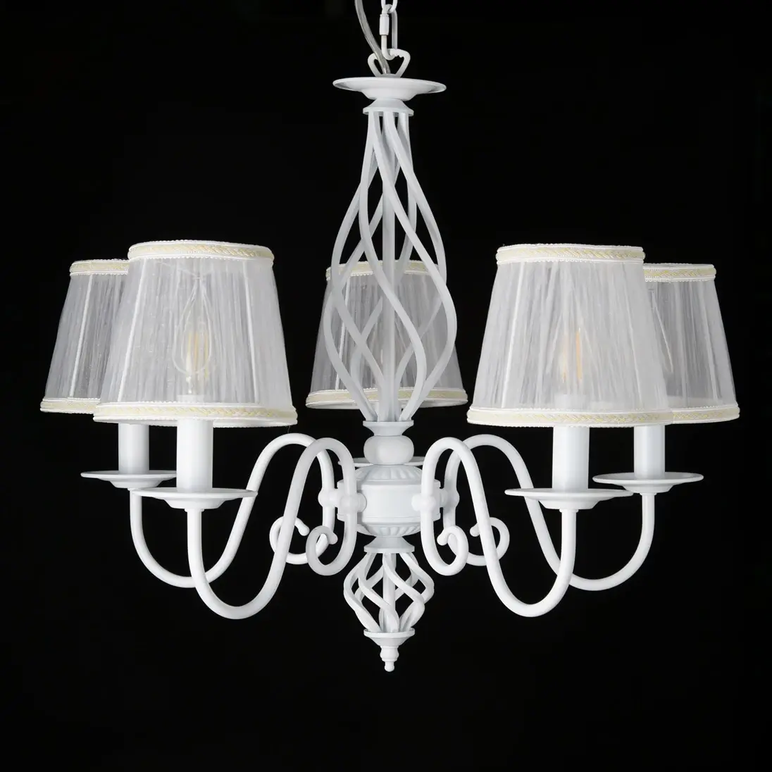 Люстры подвесные коллекции Ровена с завода с возможностью регулировки высоты монтажа. Это позволяет использовать их как в комнатах с высоким потолком, так и в низких помещениях. Минимальная высота с полностью убранной цепочкой составит всего 65 сантиметров, то есть на стандартный не высокий потолок данная модель подойдёт идеально. Серия одна из самых насыщенных с точки зрения модельного ряда. Люстру можно подобрать практически на любую площадь помещения и под любой цвет интерьера, так как модели производятся в двух цветовых решениях. Светильники отлично подойдут практически во все типы комнат, будь то гостиная, спальня или дача. Основание выполнено из прочного металла и окрашено в универсальный белый цвет. Центральная часть люстры украшена оригинальной винтажной фигурой, за счёт которой модель смотрится наполнено, пропорционально. В комплект входит пять белых тканевых абажура, которые сделают свет более мягким и рассеянным. От такого света не будут уставать глаза, также при нем очень уютно. Светлые оттенки светильника очень легко привязать практически к любому интерьеру, а цвет арматуры идеально будет сочетаться с белой мебелью или аналогичными элементами дизайна комнаты. Текстура абажура полупрозрачная, за счёт этого люстры очень яркие – площадь освещения до 16 квадратных метров. Патроны сделаны из качественного термостойкого материала, позволяющего использовать лампочки накаливания до 60 ватт включительно, энергосберегающие или светодиодные лампочки можно применять любой мощности.