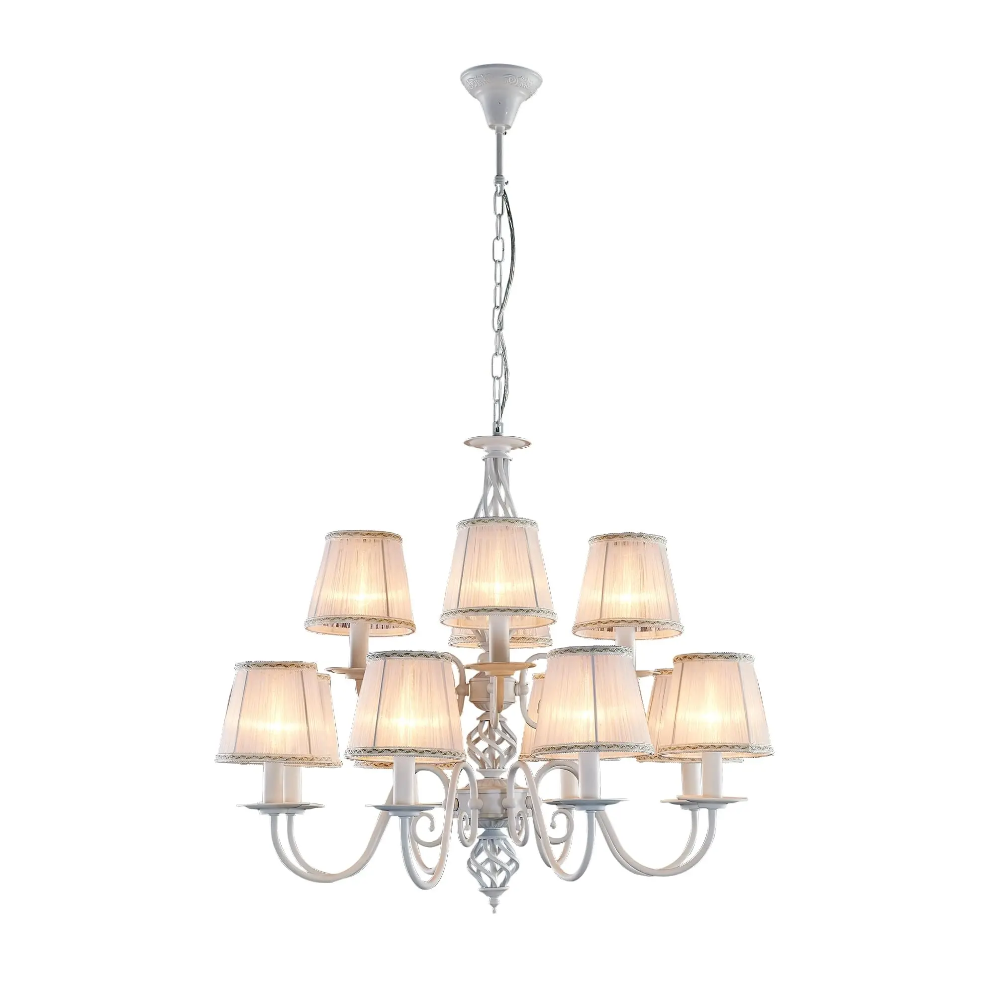 Люстры подвесные коллекции Ровена с завода с возможностью регулировки высоты монтажа. Серия одна из самых насыщенных с точки зрения модельного ряда. Люстру можно подобрать практически на любую площадь помещения и под любой цвет интерьера, так как модели производятся в двух цветовых решениях. Очень оригинально и насыщенно смотрятся двух ярусные позиции. В нижнем ярусе восемь рожков, в верхнем четыре. Между ярусами добавлен винтажный элемент арматуры, подчёркивающий оригинальный стиль всей конструкции. Рекомендуем при сборке рожки верхнего яруса располагать между рожками нижнего. В таком представлении светильник смотрится красивее всего. Светильники отлично подойдут практически во все типы комнат, будь то гостиная, спальня или дача. Основание выполнено из прочного металла и окрашено в универсальный белый цвет. Покраска арматуры гальванизирована, что позволяет люстре не терять своих замечательных декоративный свойств даже при частой влажной уборке. Центральная часть светильника украшена оригинальной винтажной фигурой, за счёт которой люстра смотрится наполнено, пропорционально. Диаметр люстры 79 сантиметров, а максимальная высота 112, что делает её арт объектом в вашей комнате, светильник не потеряется по размеру даже на очень высоком потолке при площади помещения более 25 метров квадратных. В комплект входит двенадцать белых тканевых абажура, которые сделают свет более мягким и рассеянным. От такого света не будут уставать глаза, также при нем очень уютно. Белые оттенки светильника очень легко привязать к интерьерам практически любых оттенков, а цвет арматуры идеально будет сочетаться со светлой мебелью или элементами дизайна комнаты. Текстура абажура полупрозрачная, за счёт этого люстры очень яркие – площадь освещения до 26 квадратных метров. Патроны сделаны из качественного термостойкого материала, позволяющего использовать лампочки накаливания до 60 ватт включительно, энергосберегающие или светодиодные лампочки можно применять любой мощности.