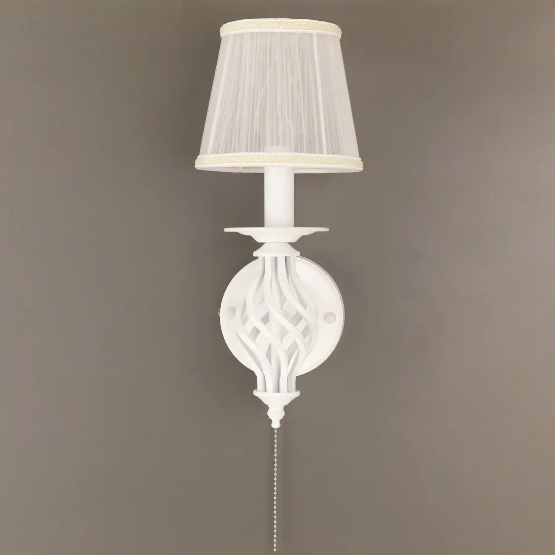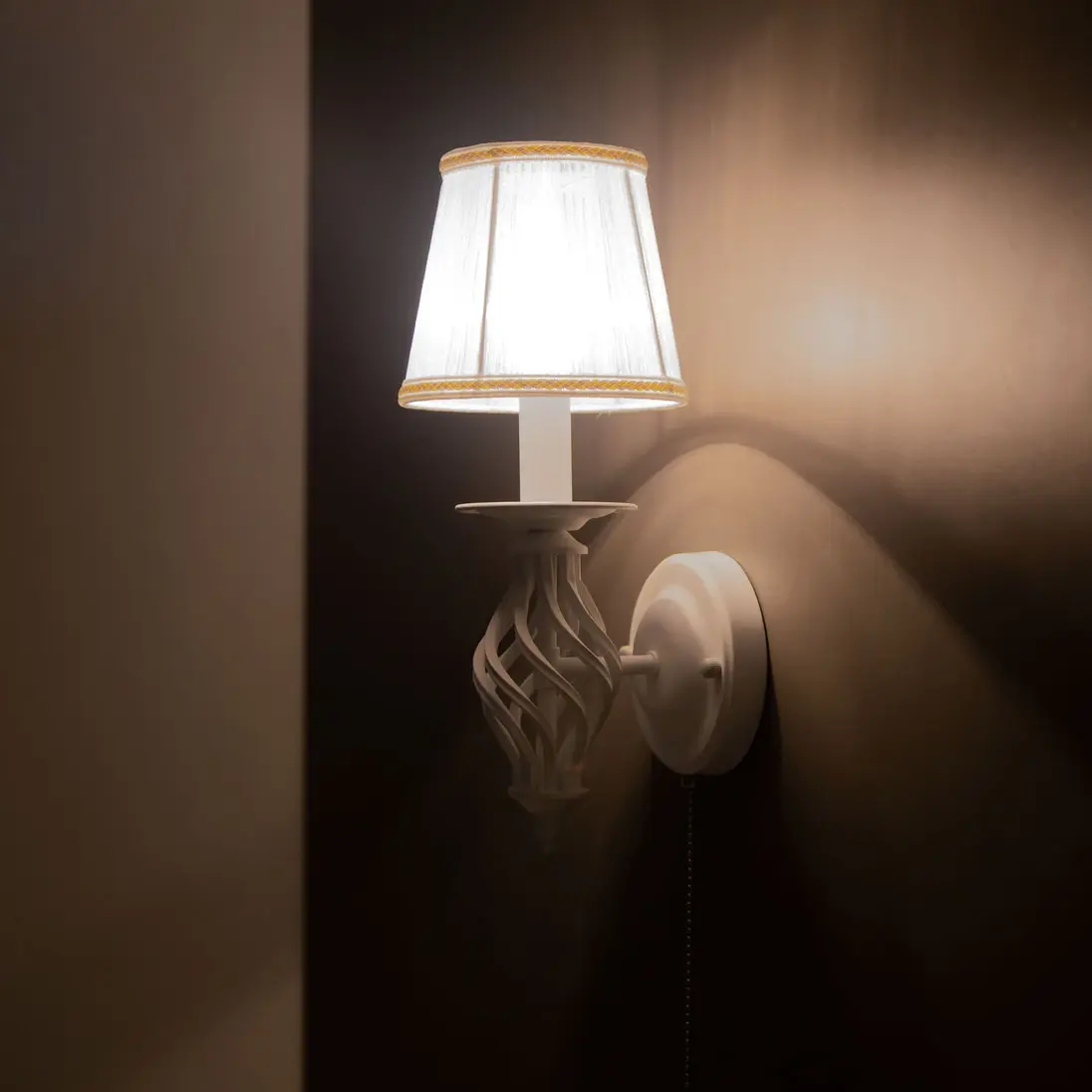 Бра настенная из коллекции «Ровена» выполнена в необычном, оригинальном дизайне - на основании под абажуром добавлен стильный винтажный элемент. Добавление этого элемента идеально позволяет привязать бра к одноименной коллекции подвесных люстр, настольных ламп и напольных торшеров. Так как стиль светильника очень интересный, то бра шикарно будут смотреться и как самостоятельные светильники в интерьере, особенно если устанавливать их по две или более. Модель выполнена из прочного металла, и окрашена в белый цвет. Такая покраска максимально универсальна, отлично смотрится, ни к чему не обязывает и не режет глаз. В комплекте поставляется один полупрозрачный белый абажур, который идеально будет рассеивать свет и создавать уют в вашей комнате. На основании светильника встроен удобный собственный выключатель. Патроны сделаны из качественного термостойкого материала, позволяющие ставить лампочки накаливания до 60 ватт включительно, энергосберегающие и светодиодные лампочки можно применять любой мощности. За счёт этого момента светильник очень яркий, площадь освещения до 3 квадратных метров.