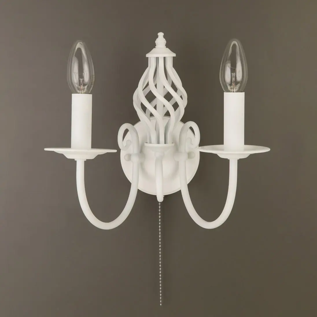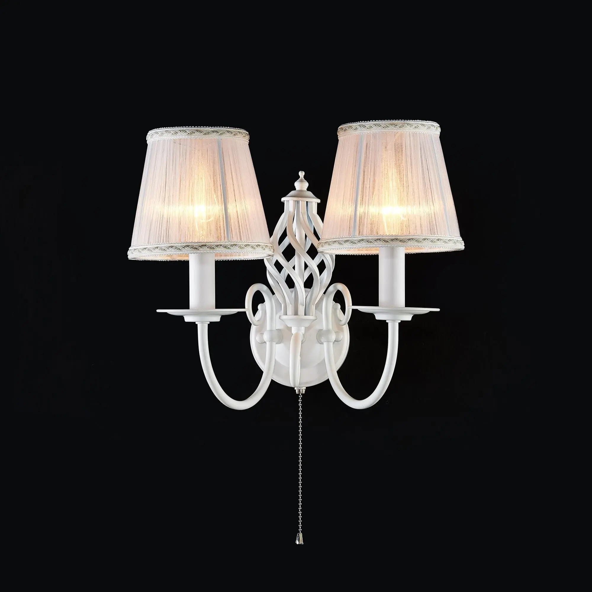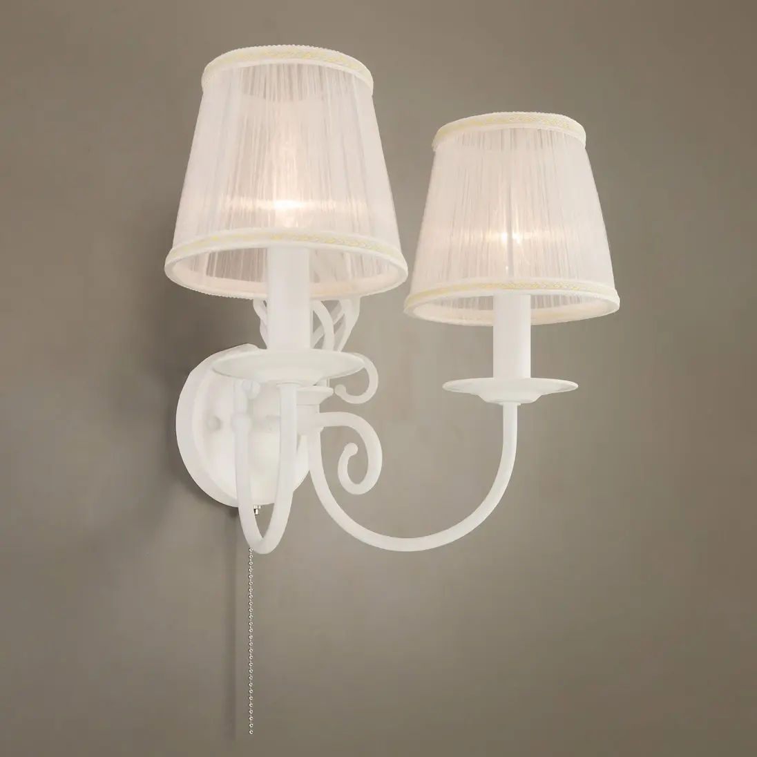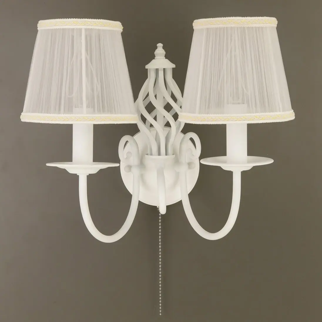 Бра настенная из коллекции «Ровена» выполнена в необычном, оригинальном дизайне - на основании добавлен стильный винтажный элемент, который элегантно обрамлен двумя рожками. Добавление этого элемента идеально позволяет привязать бра к одноименной коллекции подвесных люстр, настольных ламп и напольных торшеров. Так как стиль светильника очень интересный, то бра шикарно будут смотреться и как самостоятельные светильники в интерьере, особенно если устанавливать их по две или более. Модель выполнена из прочного металла, и окрашена в белый цвет. Такая покраска максимально универсальна, отлично смотрится, ни к чему не обязывает, не режет глаз и очень качественно привязывается практически к любому интерьеру. В комплекте поставляется два полупрозрачный белых абажура, которые идеально будут рассеивать свет и создавать уют в вашей комнате. На основании светильника встроен удобный собственный выключатель. Патроны сделаны из качественного термостойкого материала, позволяющего ставить лампочки накаливания до 60 ватт включительно, энергосберегающие и светодиодные лампочки можно применять любой мощности. За счёт этого момента светильник очень яркий, площадь освещения до 5 квадратных метров.