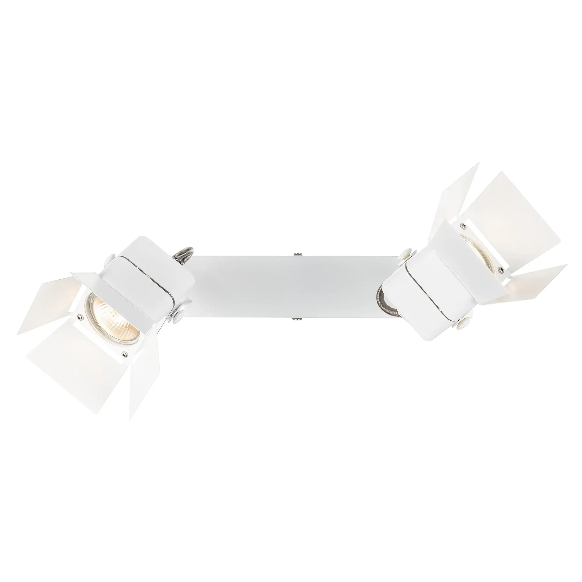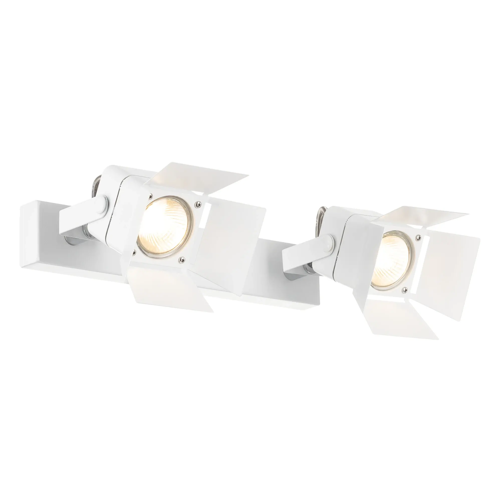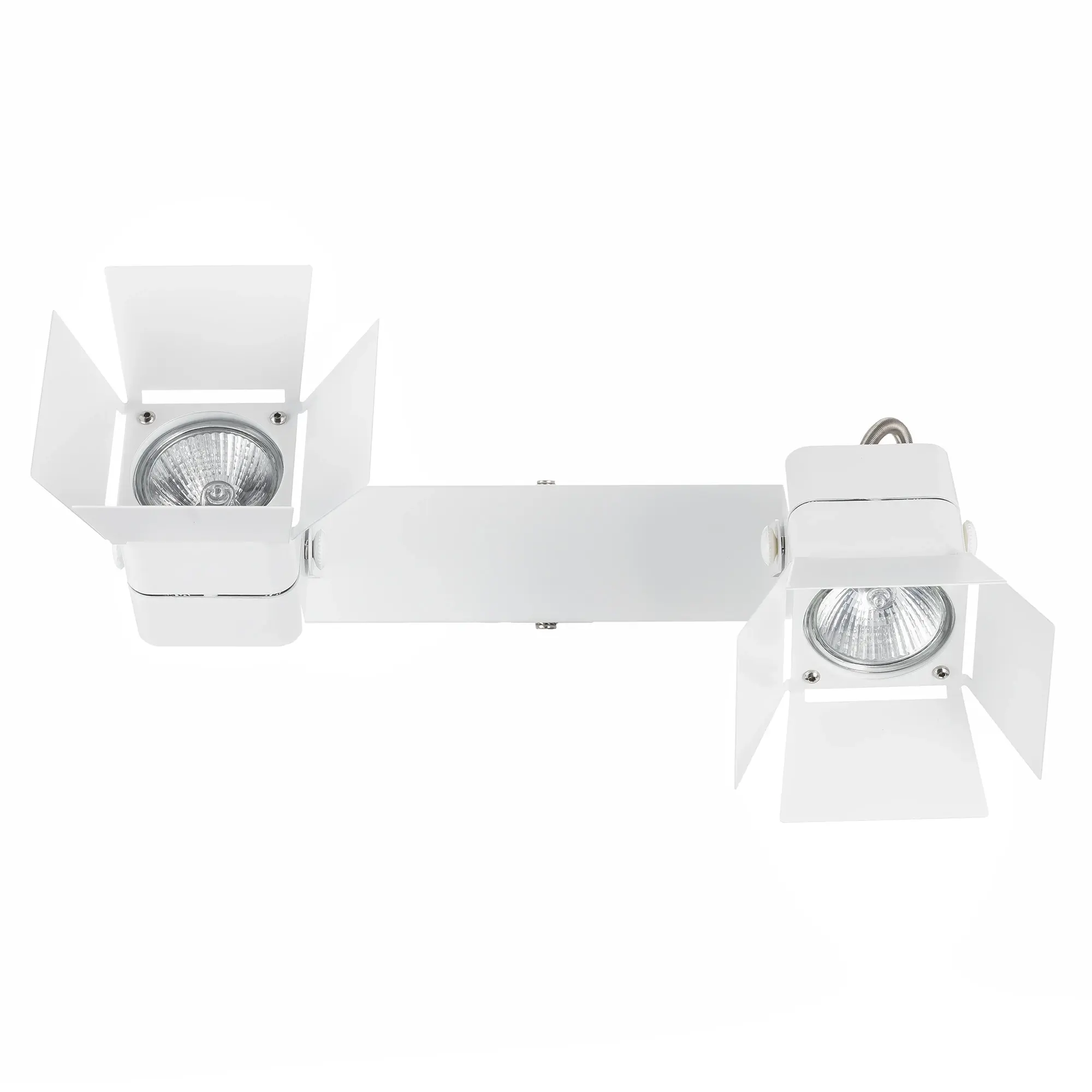 Поворотный настенно-потолочный светильник Citilux Рубик CL526520S в современном стиле. Корпус металлический, с прямоугольным основанием и двумя квадратными поворотными спотами, цвет чёрный матовый. Модель стилизована под профессиональные, сценические и театральные софиты со шторками.