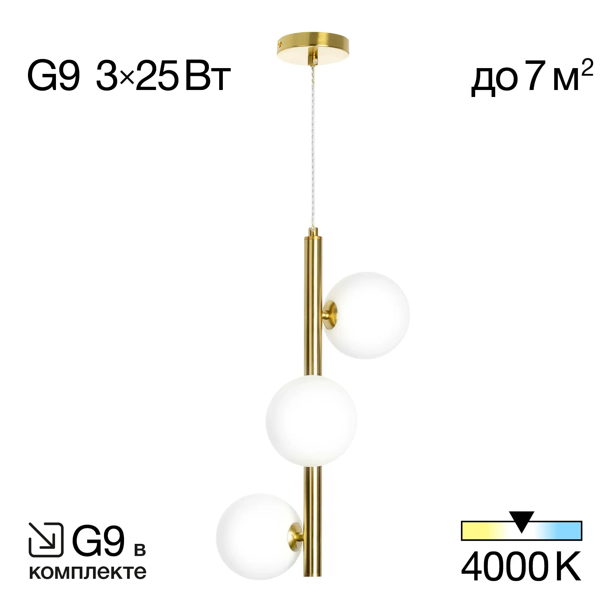 В изделии 3 лампы с цоколем G9 максимальной мощностью для галогенных ламп 25Вт (в комплекте энергосберегающая светодиодная лампа 4,5Вт, цветовая температура 4000К - нейтральный белый свет).
