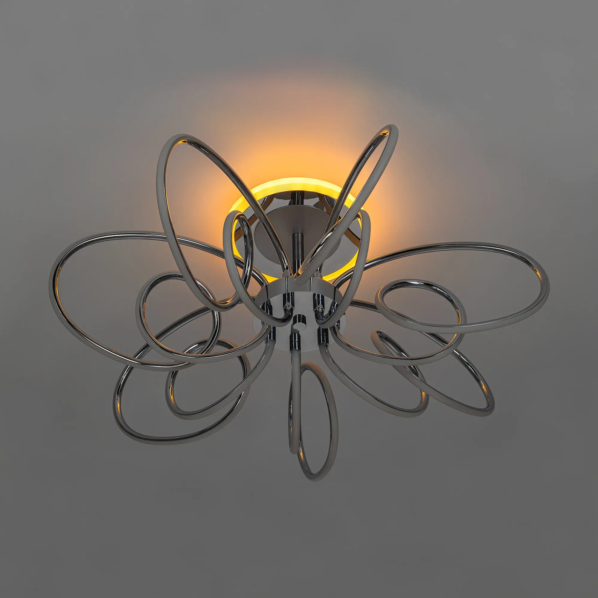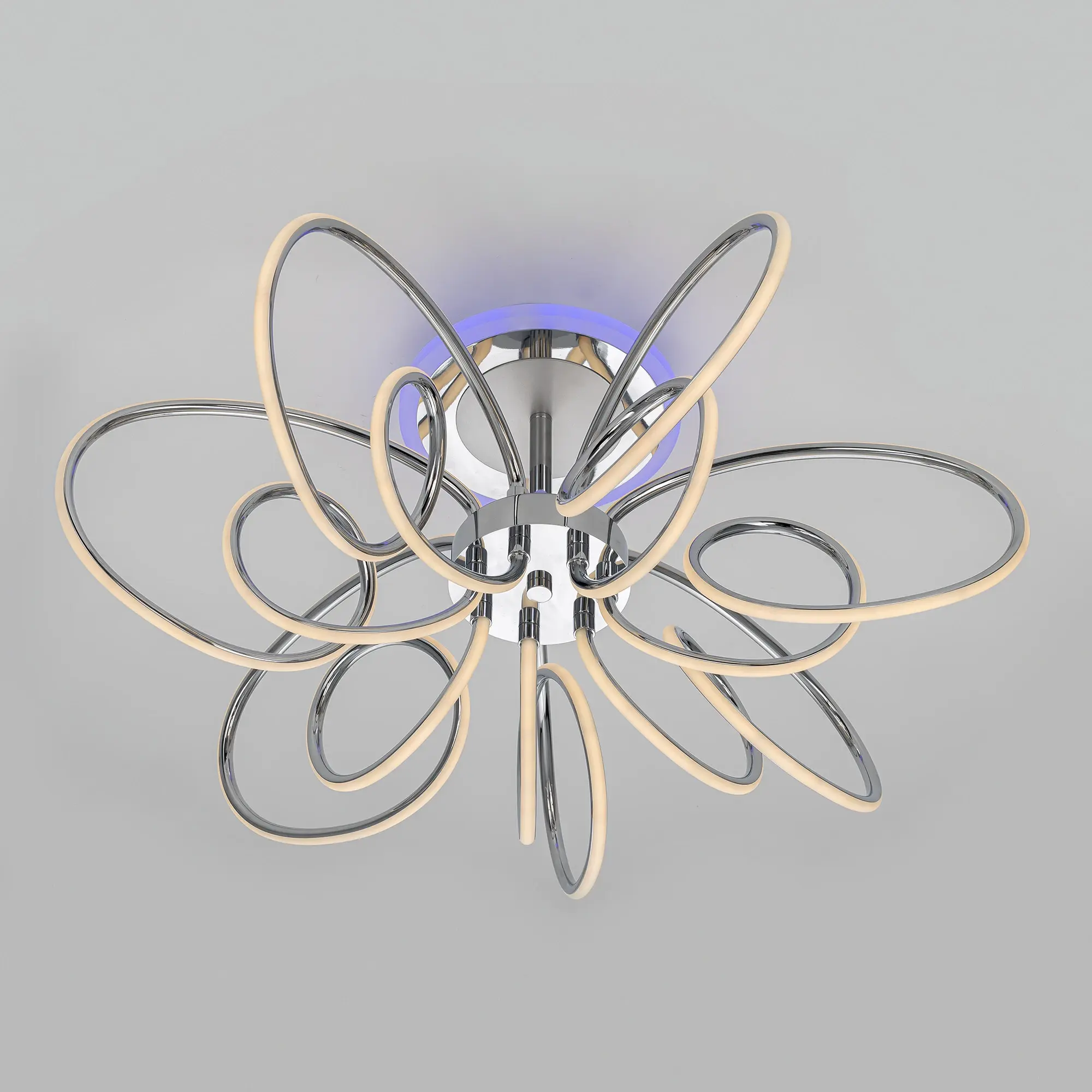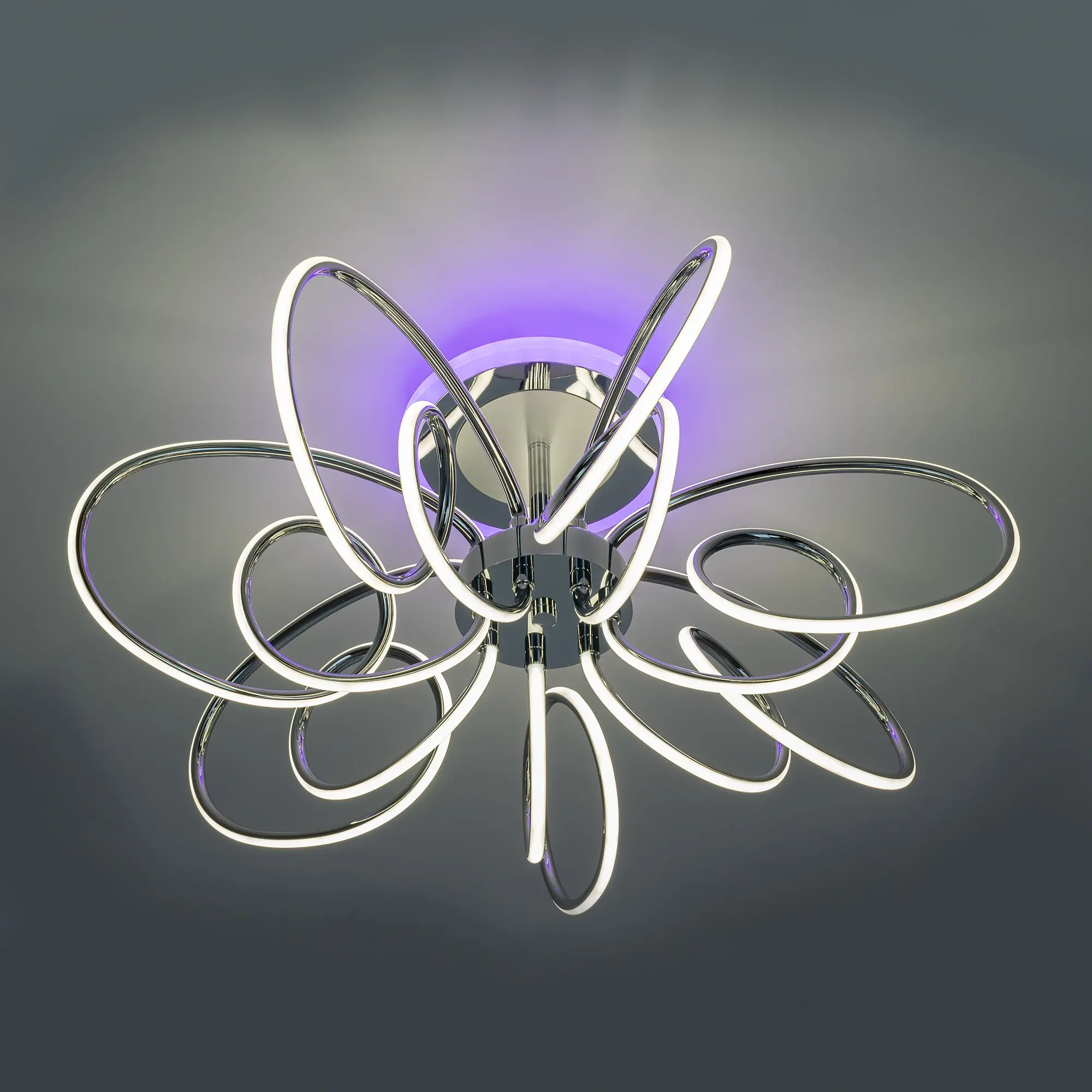 Элегантная потолочная люстра с изящно изогнутыми рожками оснащена независимой красочной RGB подсветкой основания с разными режимами работы и плавной регулировкой яркости.
