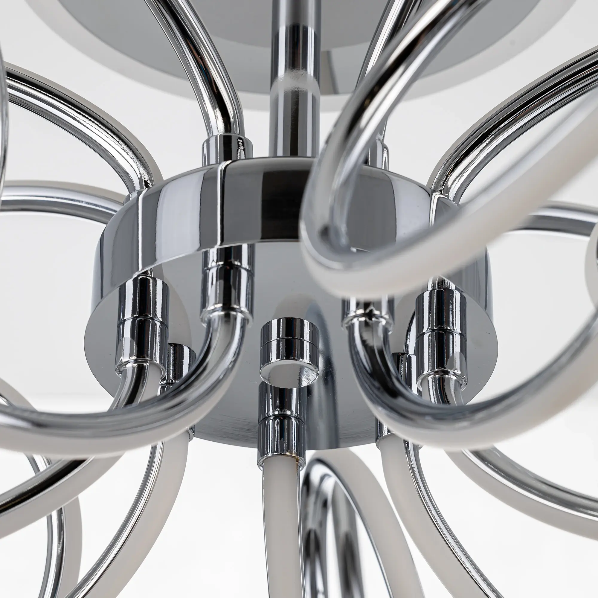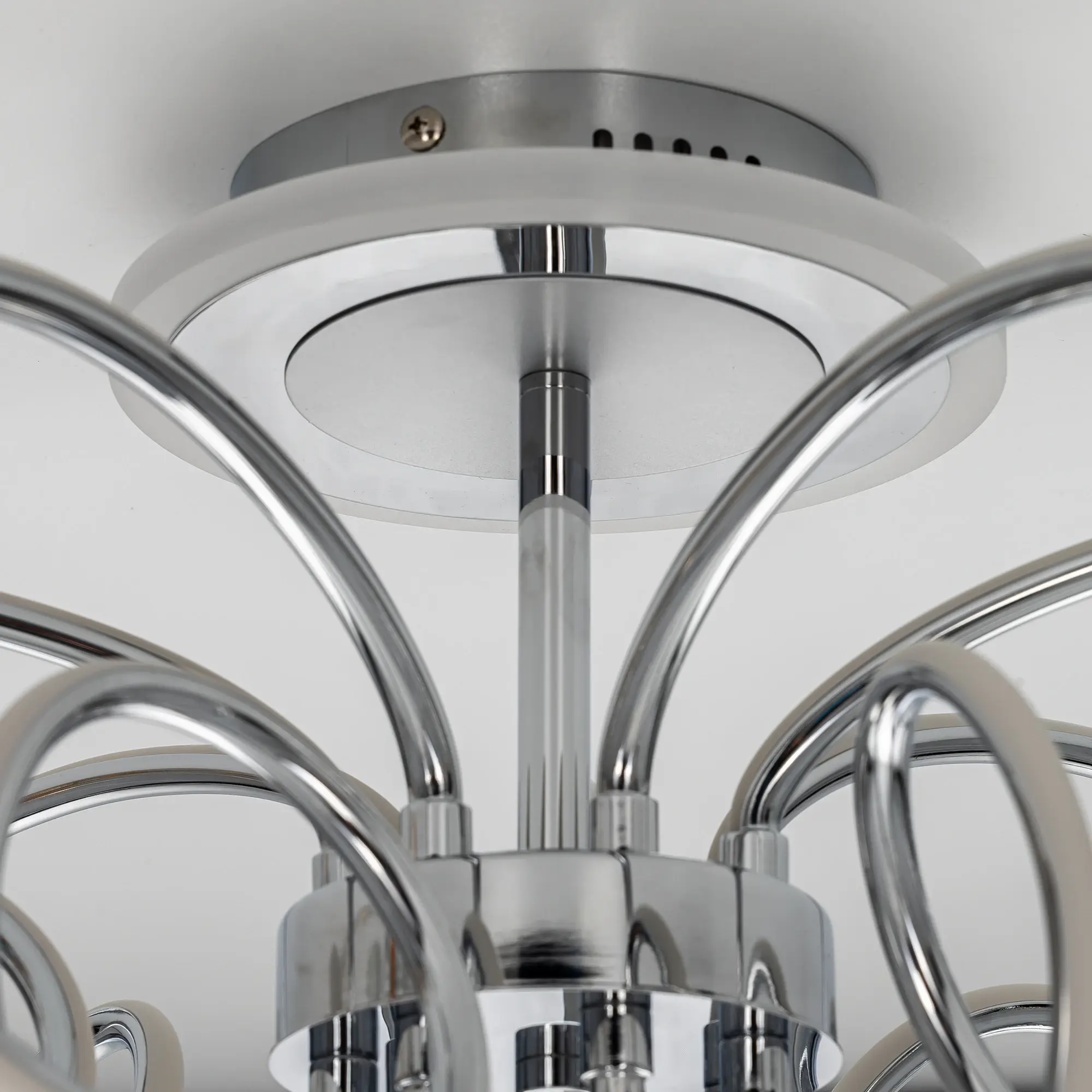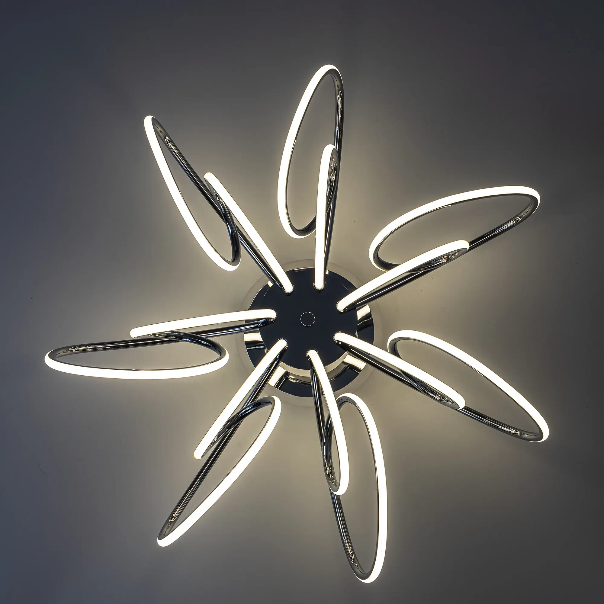 Элегантная потолочная люстра с изящно изогнутыми рожками оснащена независимой красочной RGB подсветкой основания с разными режимами работы и плавной регулировкой яркости.