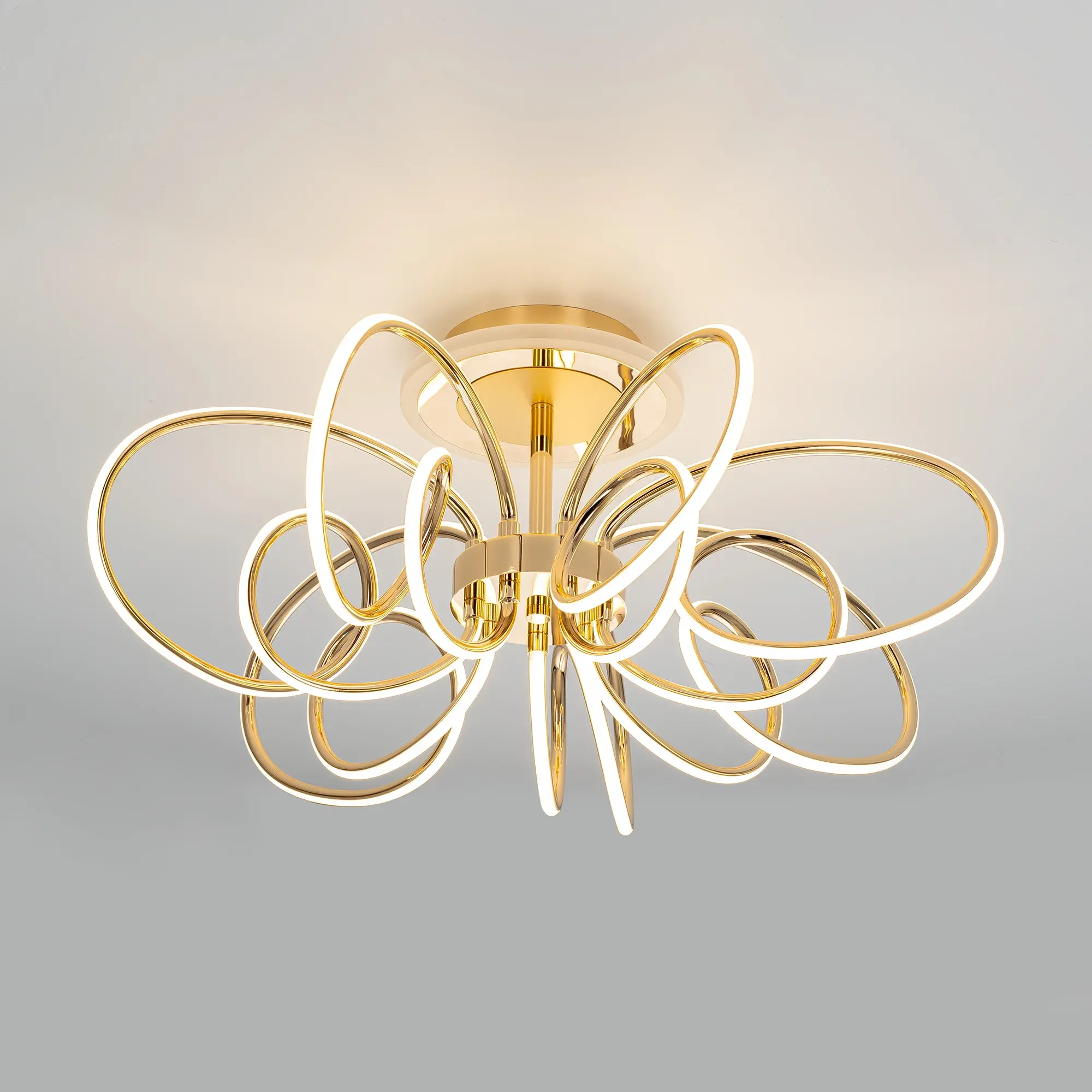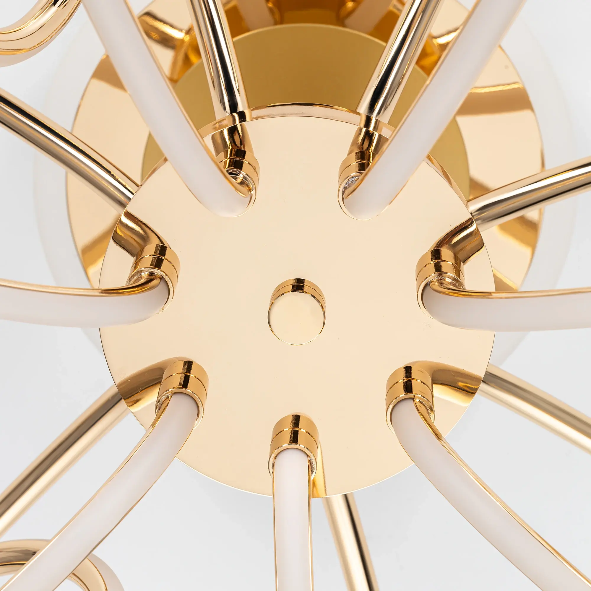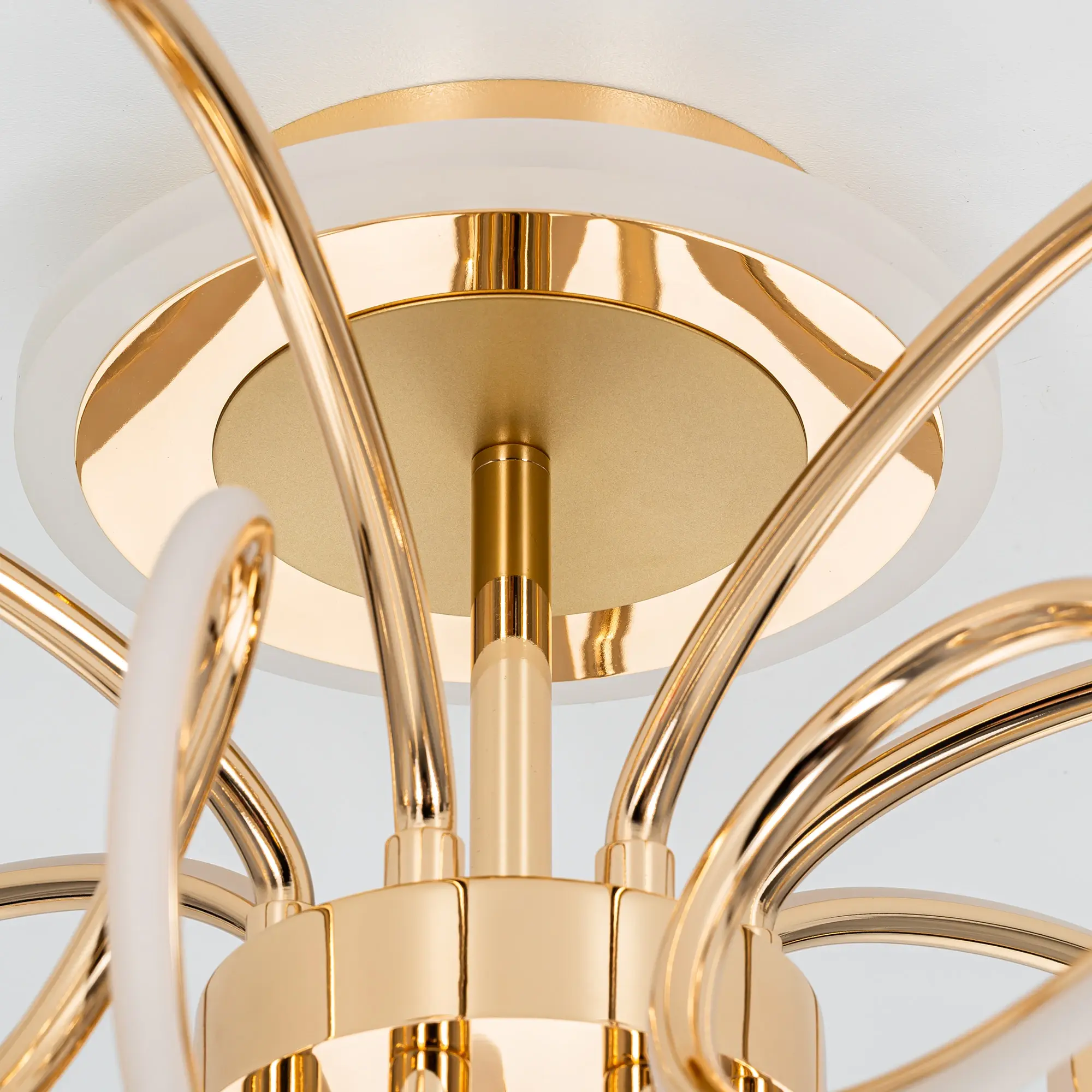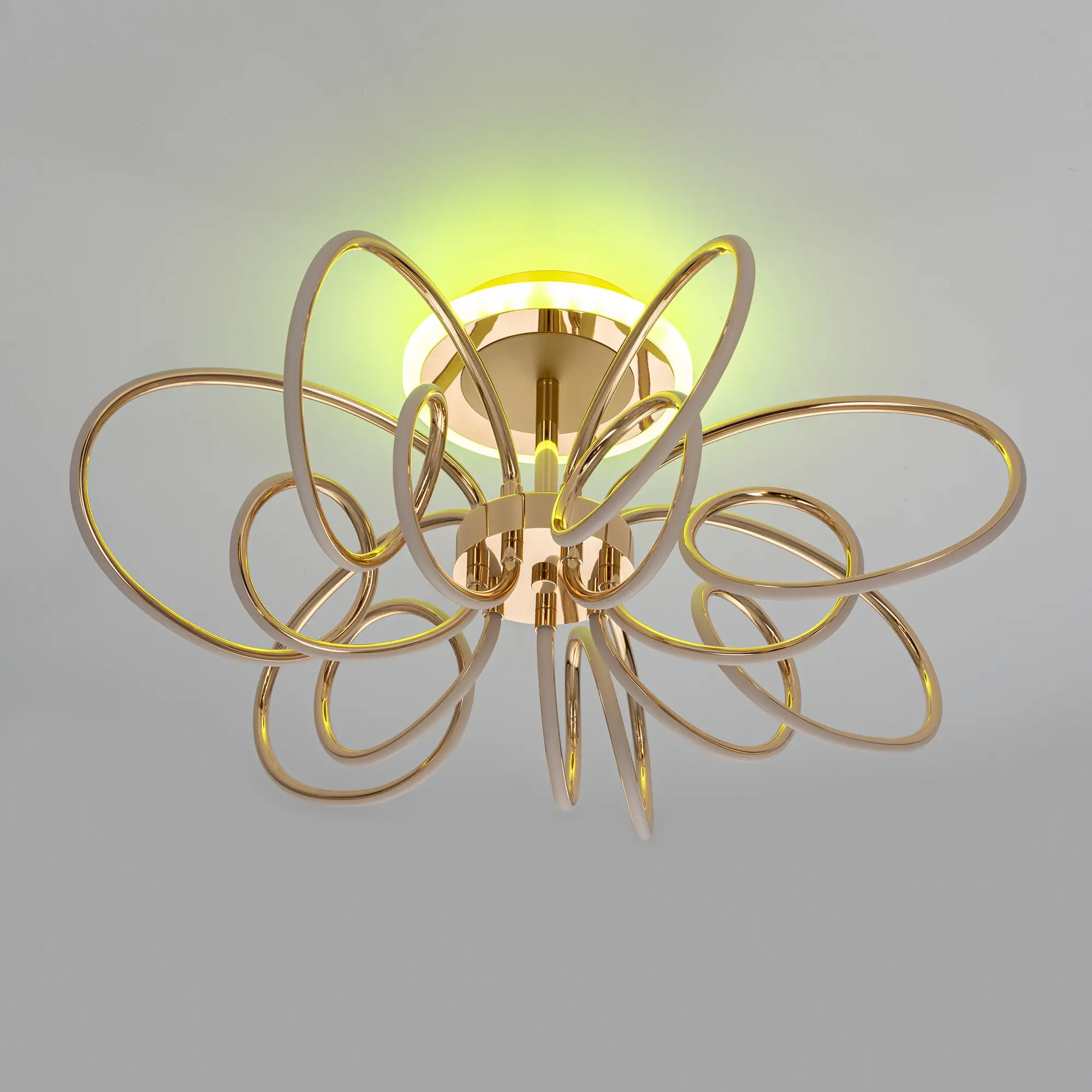 Элегантная потолочная люстра с изящно изогнутыми рожками оснащена независимой красочной RGB подсветкой основания с разными режимами работы и плавной регулировкой яркости.