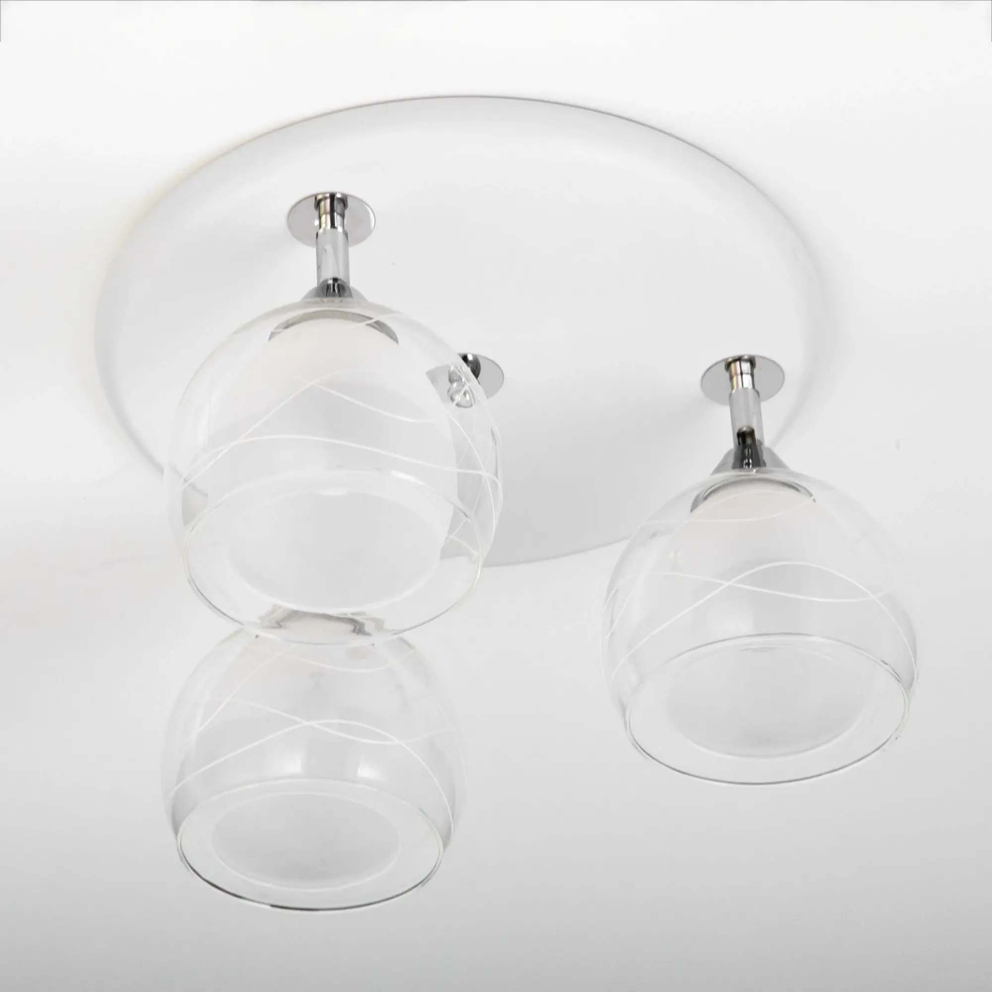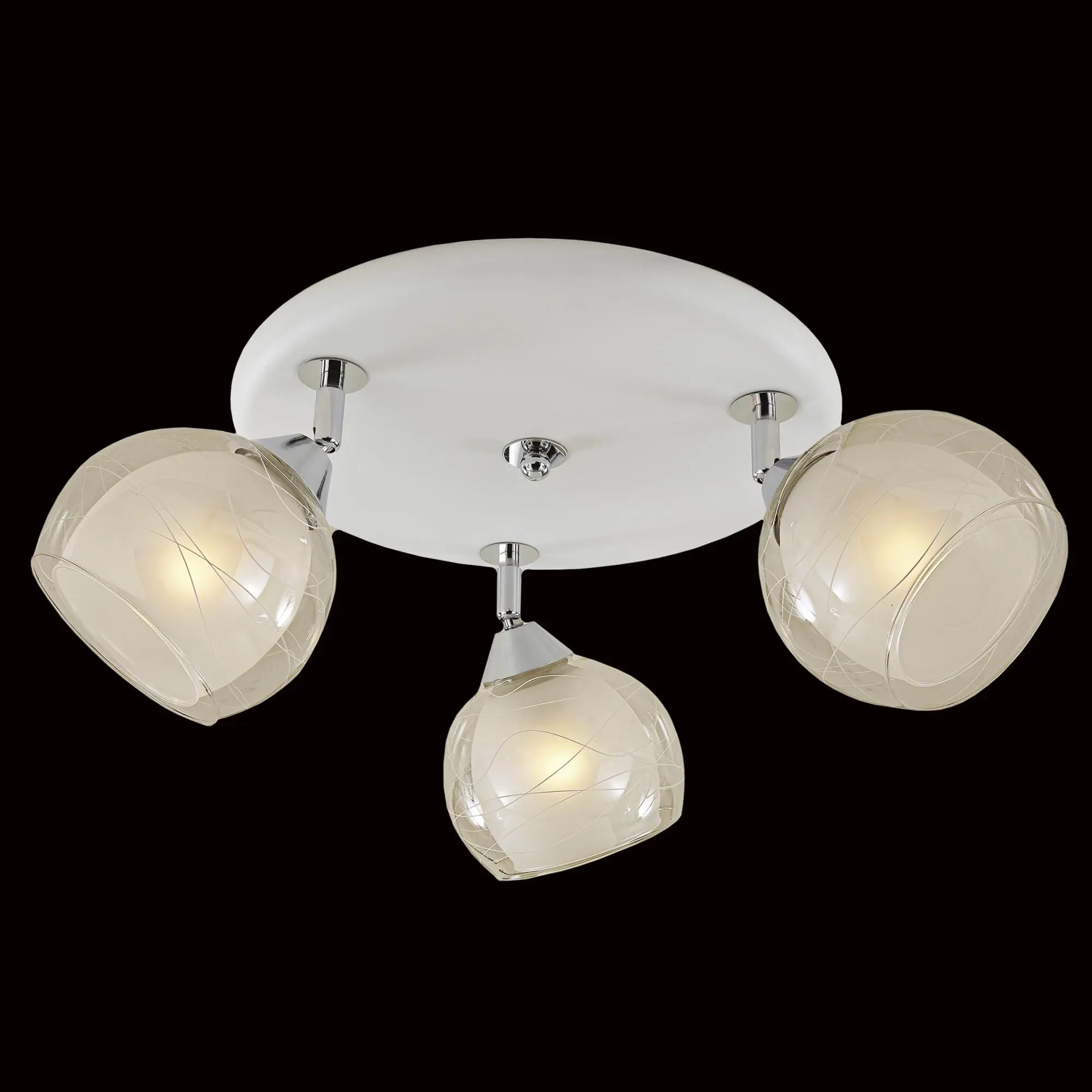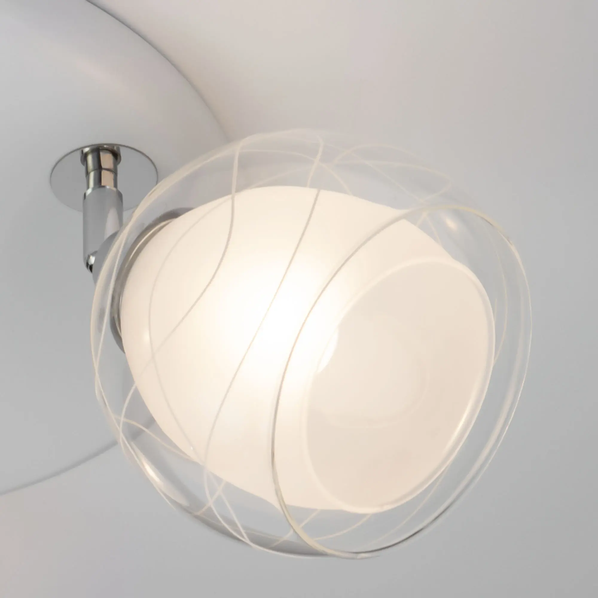 Оригинальные плафоны люстры, изготовленные из двух видов стекла, имеют форму усеченного шара. Внутренняя полуматовая часть стекла сочетается с прозрачной внешней, что обеспечивает мягкий рассеянный свет. Поворотный механизм позволяет легко изменить облик светильника и настроить максимально равномерное освещение.