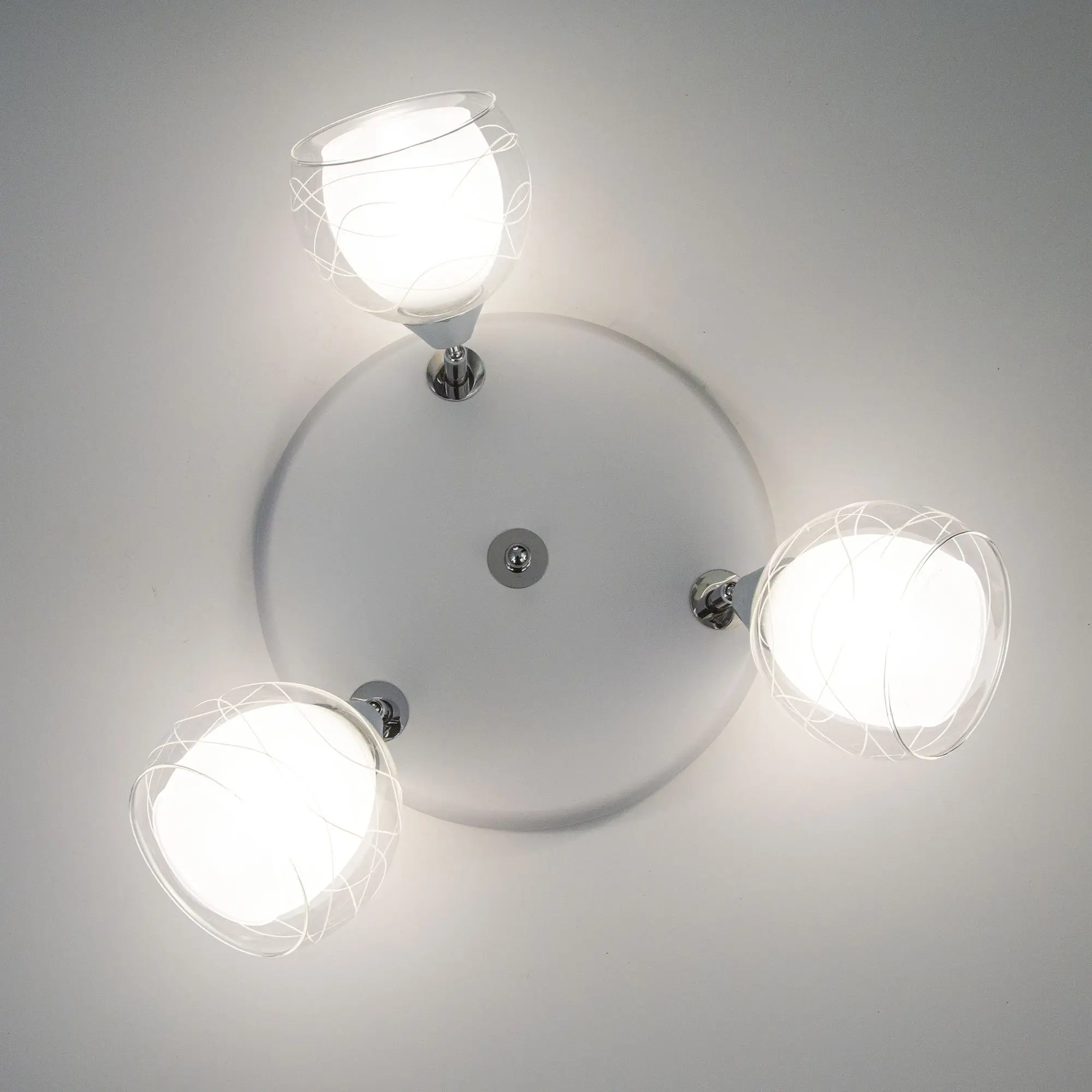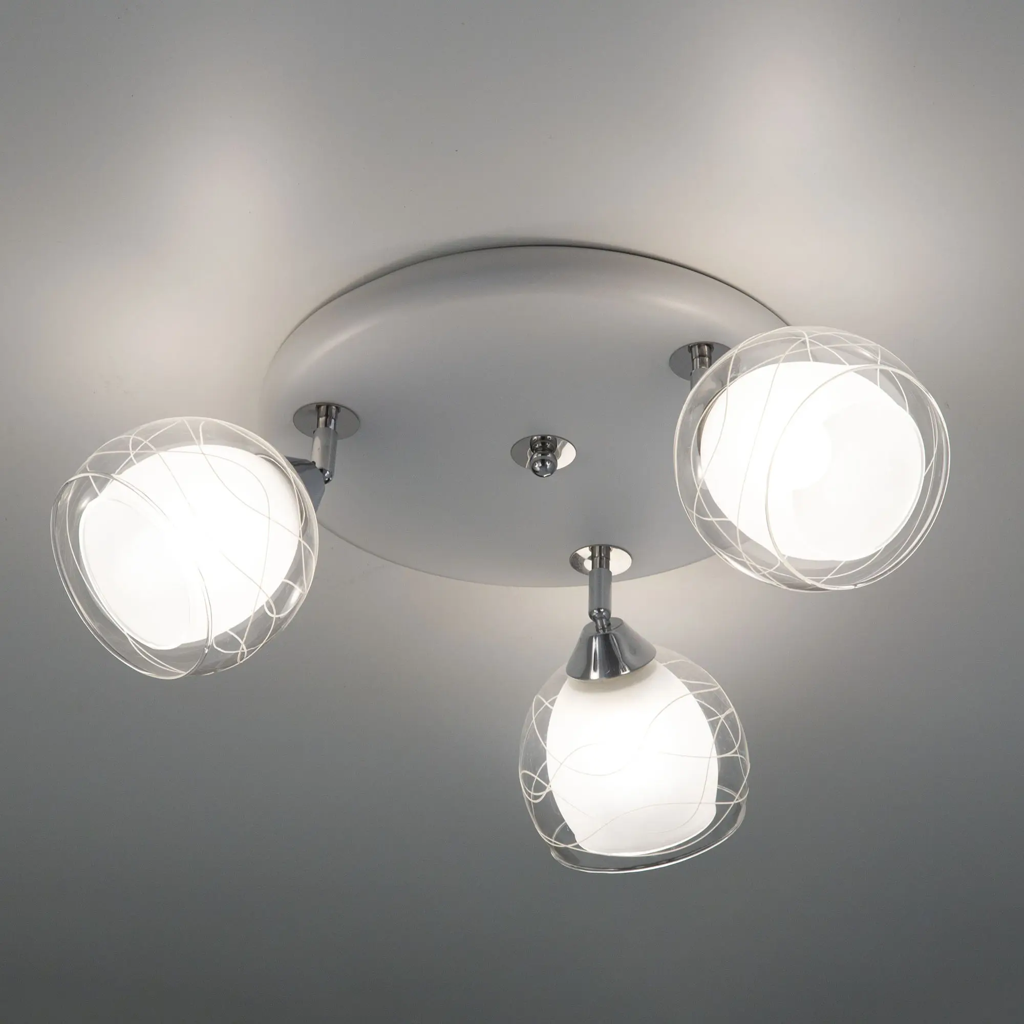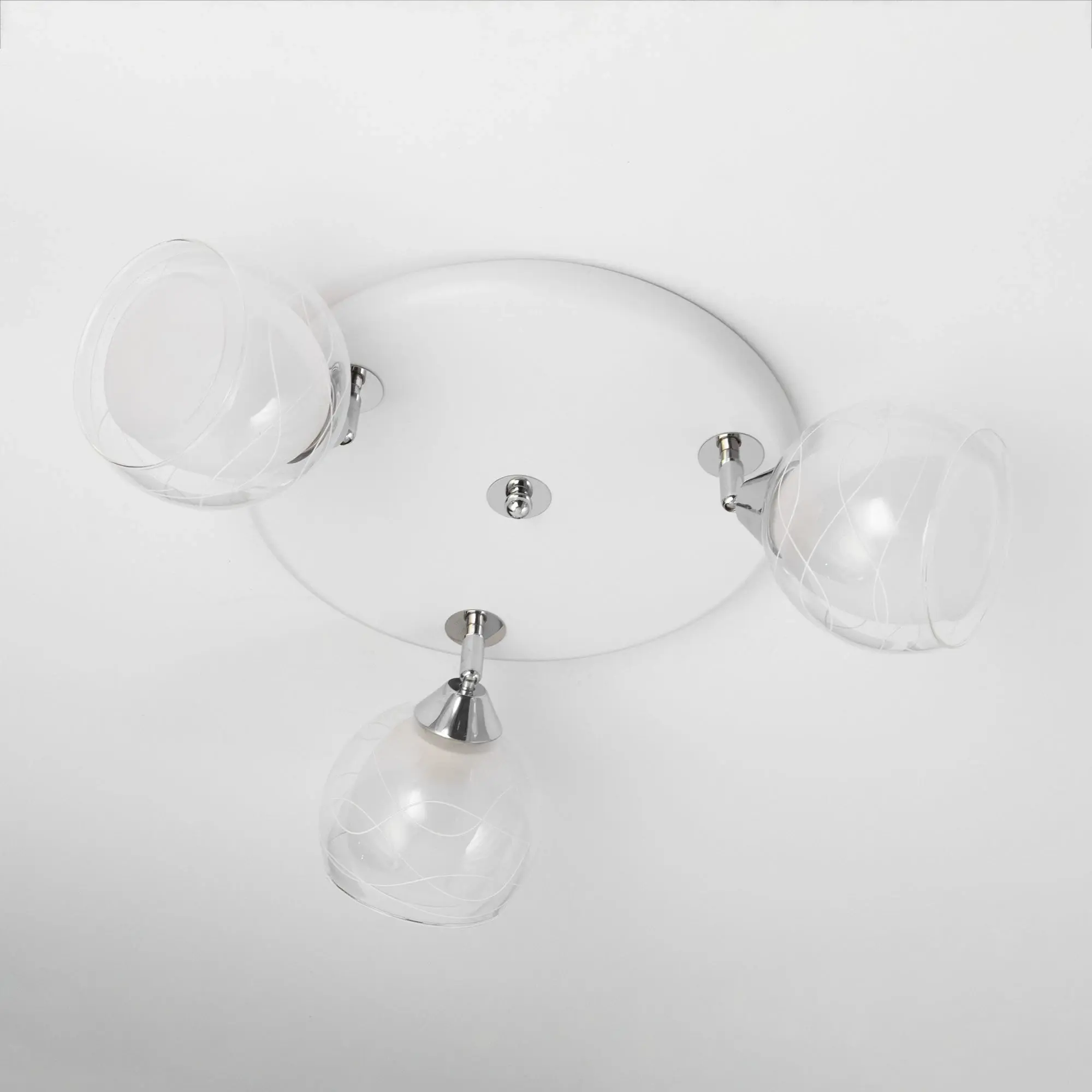 Оригинальные плафоны люстры, изготовленные из двух видов стекла, имеют форму усеченного шара. Внутренняя полуматовая часть стекла сочетается с прозрачной внешней, что обеспечивает мягкий рассеянный свет. Поворотный механизм позволяет легко изменить облик светильника и настроить максимально равномерное освещение.