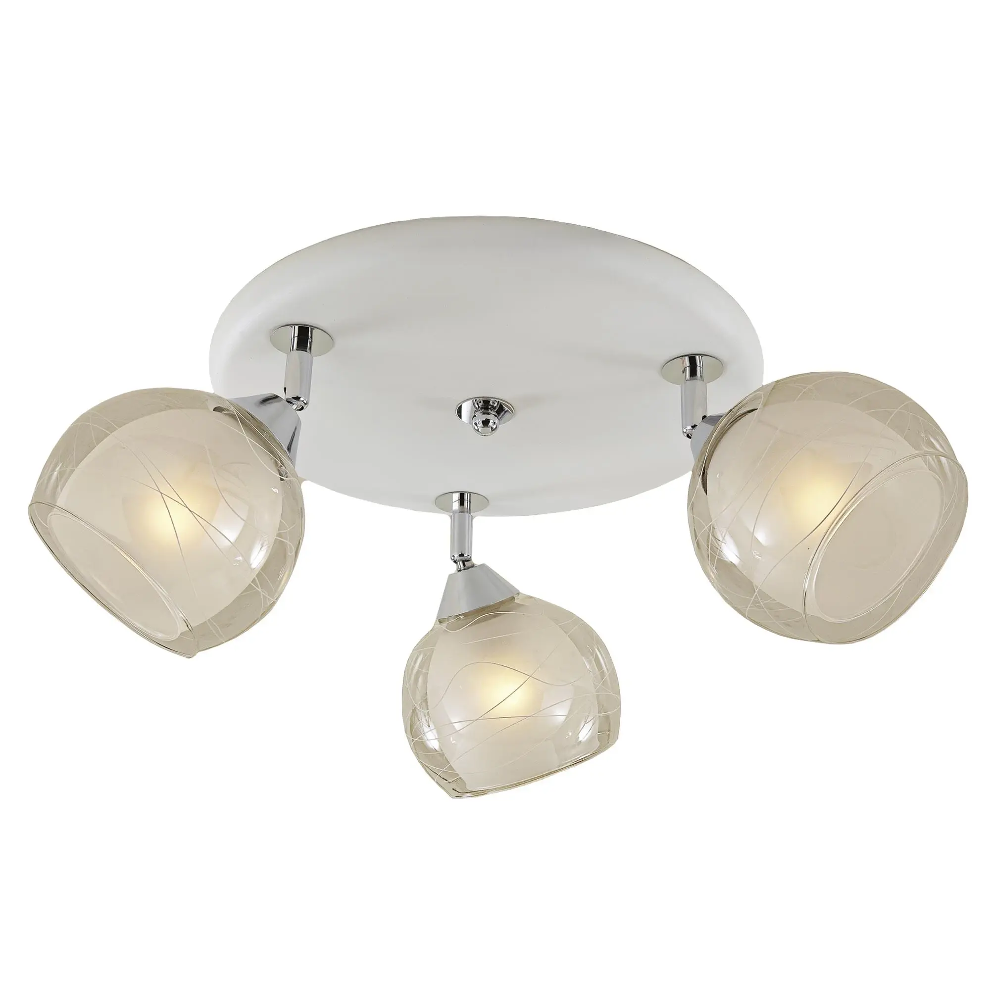 В изделии 3 лампы с цоколем Е27 максимальной мощностью для ламп накаливания 75Вт (в комплект не входят, приобретаются отдельно). Светильник совместим как с одноклавишным, так и с двухклавишным выключателем. Модель подходит для различных видов потолков, включая натяжные, тип крепления – планка. Диаметр 38см, высота 22,5см, осветит до 11м².
