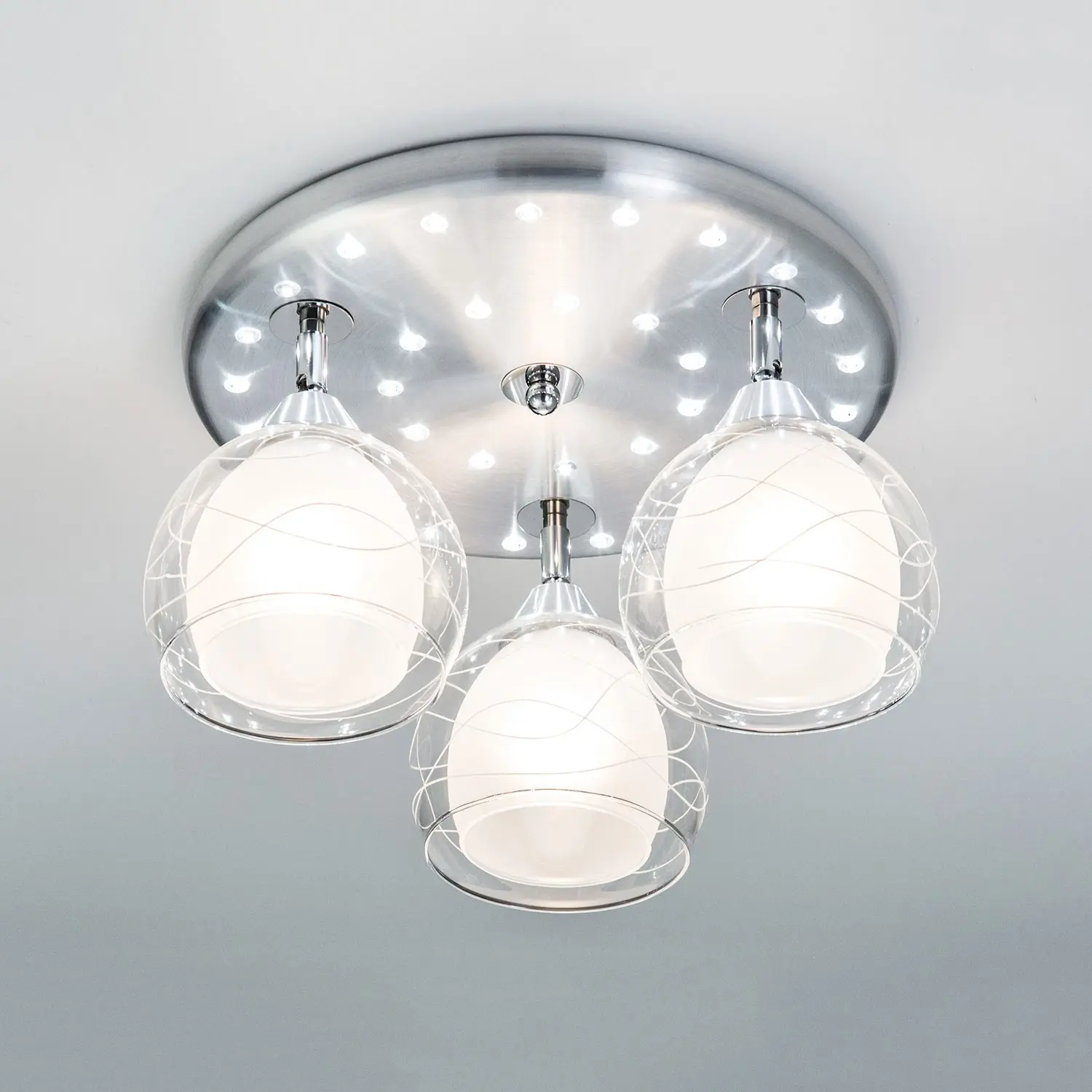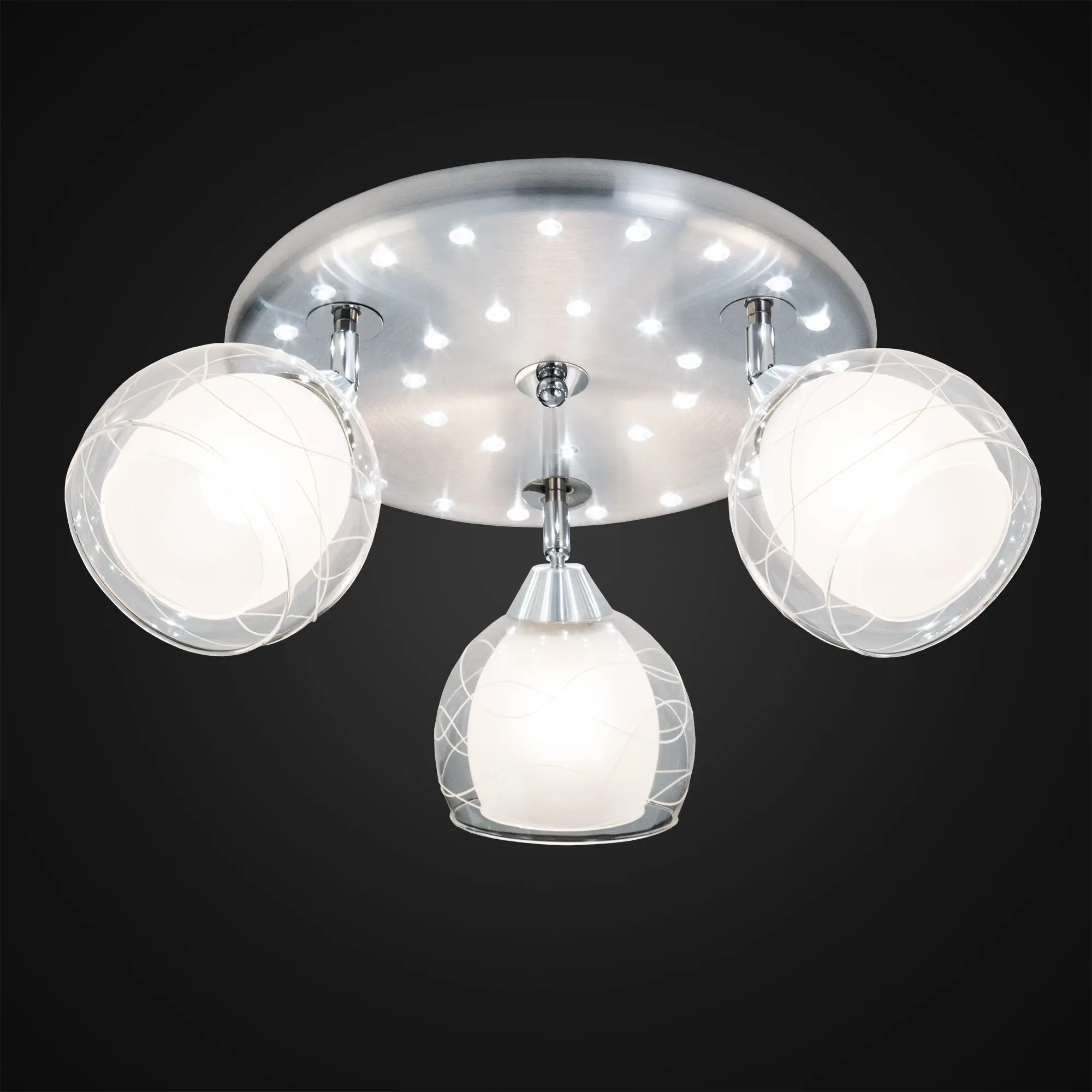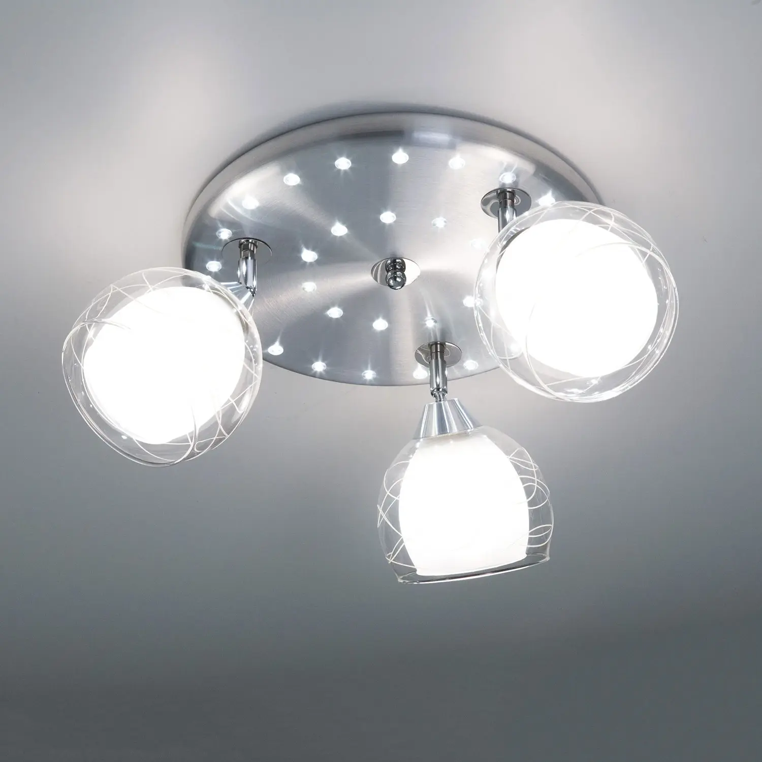 В изделии 3 лампы с цоколем Е27 максимальной мощностью для ламп накаливания 75Вт (в комплект не входят, приобретаются отдельно). Светильник совместим как с одноклавишным, так и с двухклавишным выключателем, (лампочки и светодиоды можно включать раздельно). Модель подходит для различных типов потолков, включая натяжные, тип крепления – планка. Диаметр 38см, высота 22,5см, осветит до 11м².