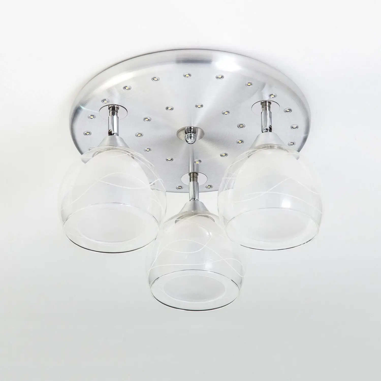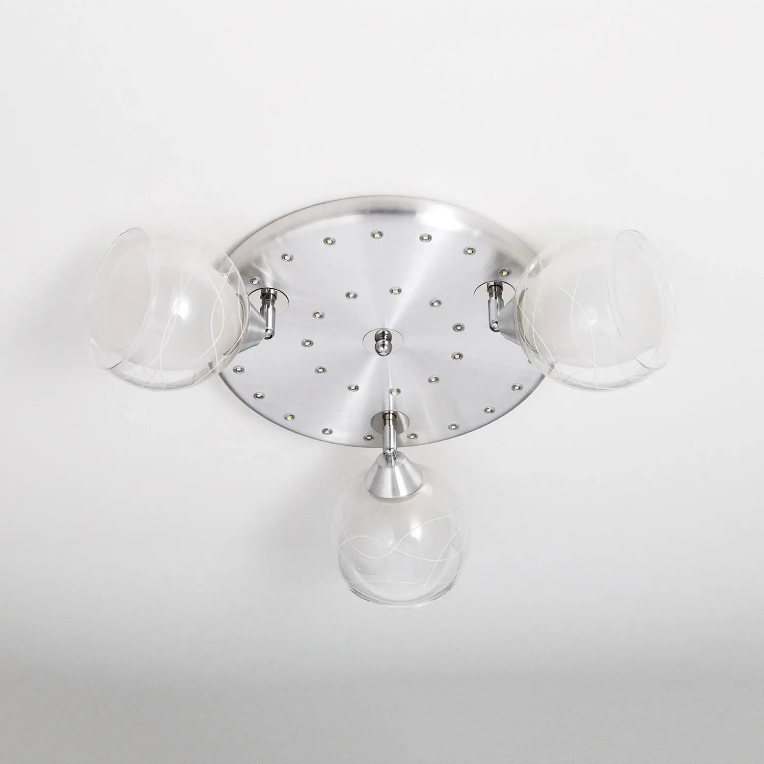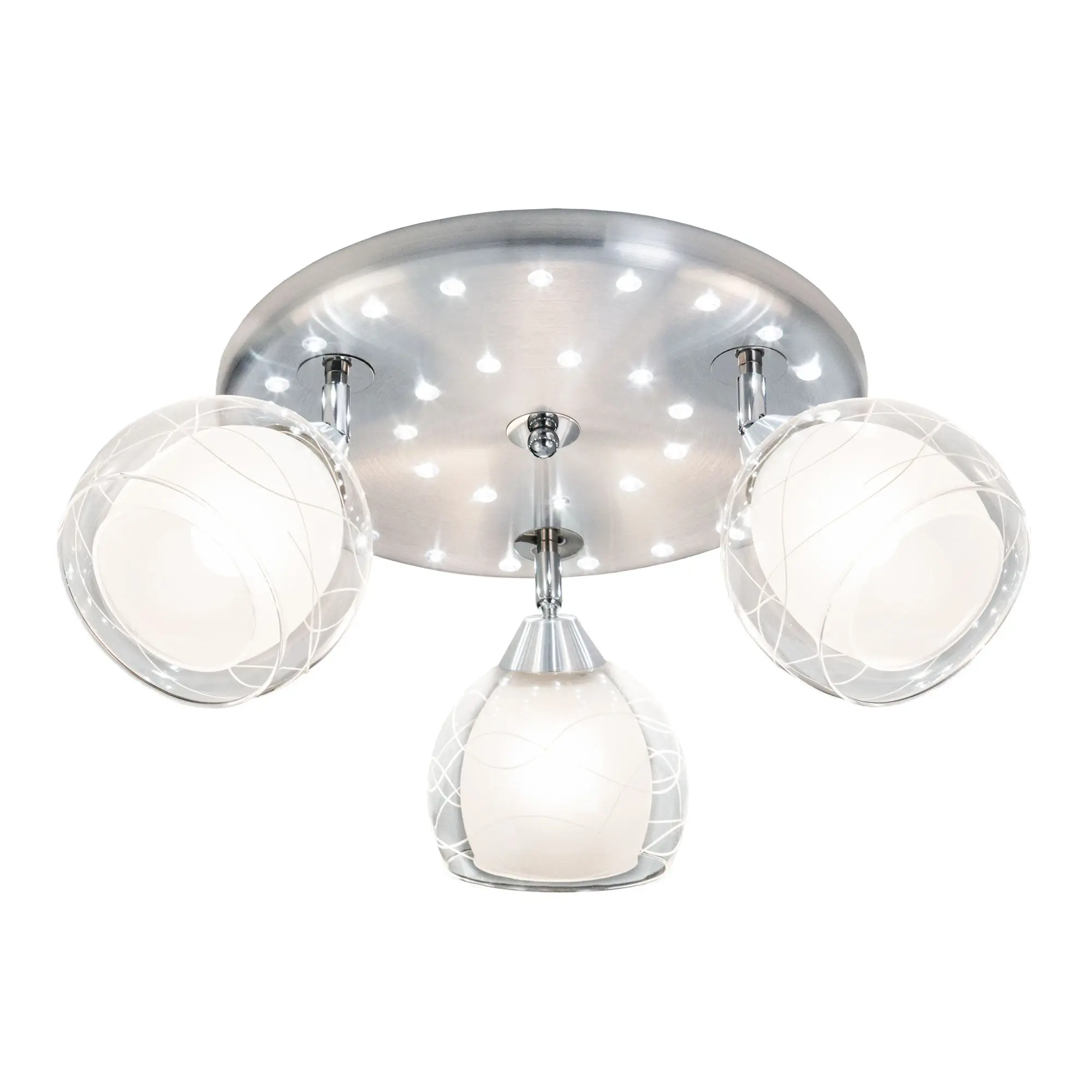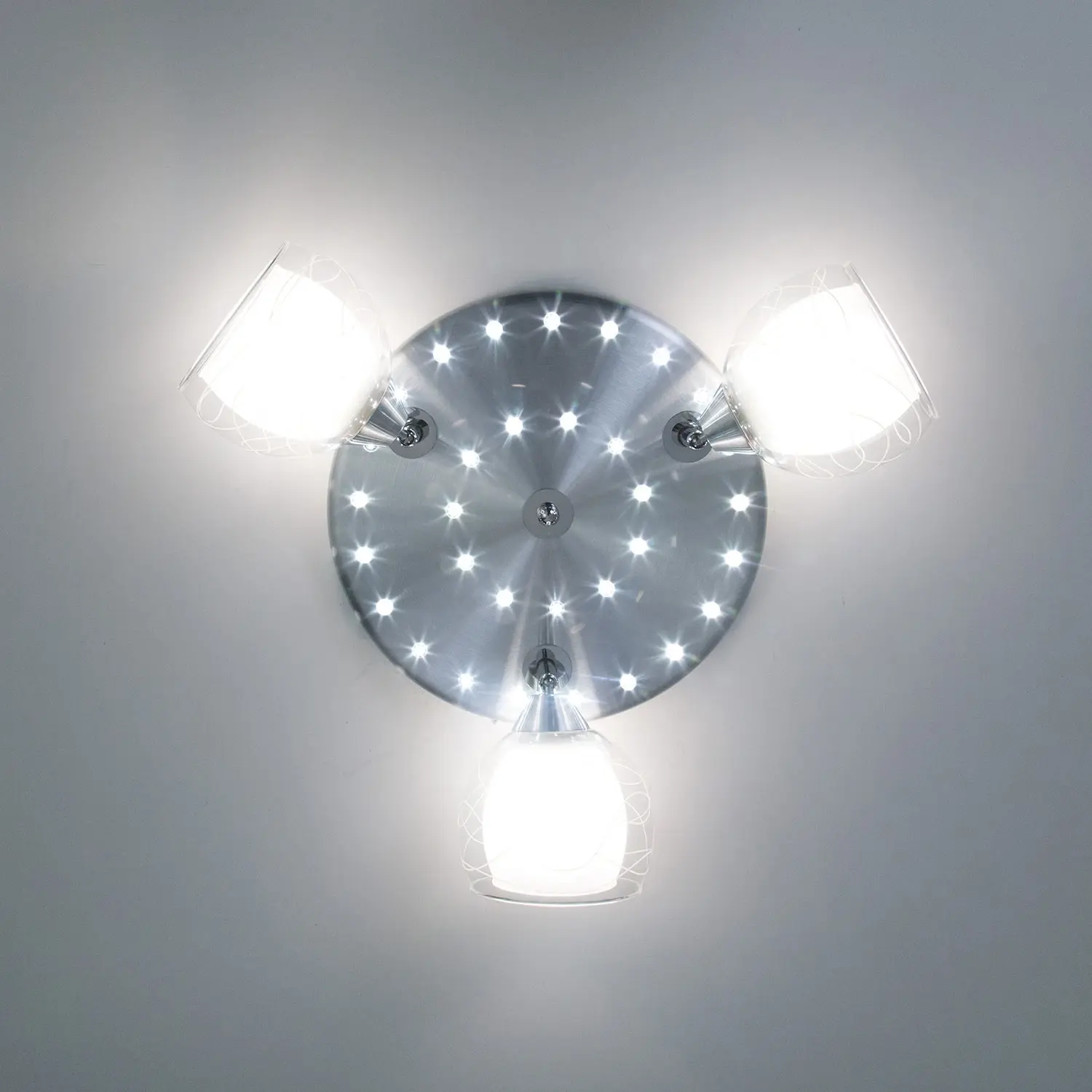 В изделии 3 лампы с цоколем Е27 максимальной мощностью для ламп накаливания 75Вт (в комплект не входят, приобретаются отдельно). Светильник совместим как с одноклавишным, так и с двухклавишным выключателем, (лампочки и светодиоды можно включать раздельно). Модель подходит для различных типов потолков, включая натяжные, тип крепления – планка. Диаметр 38см, высота 22,5см, осветит до 11м².