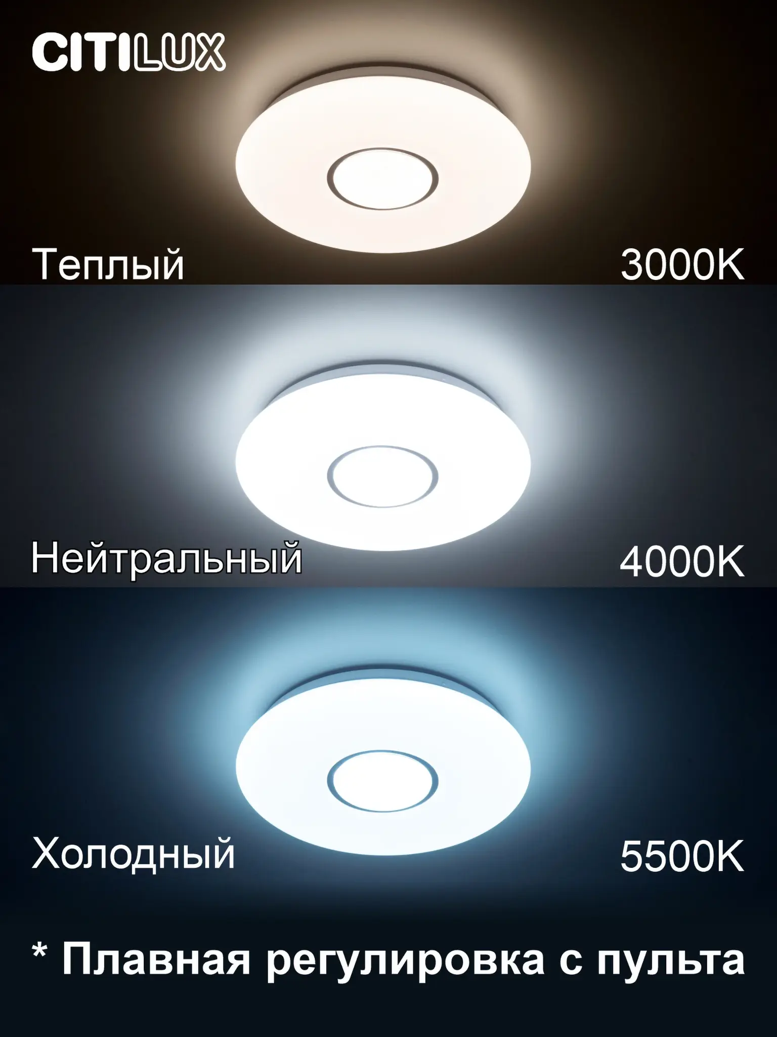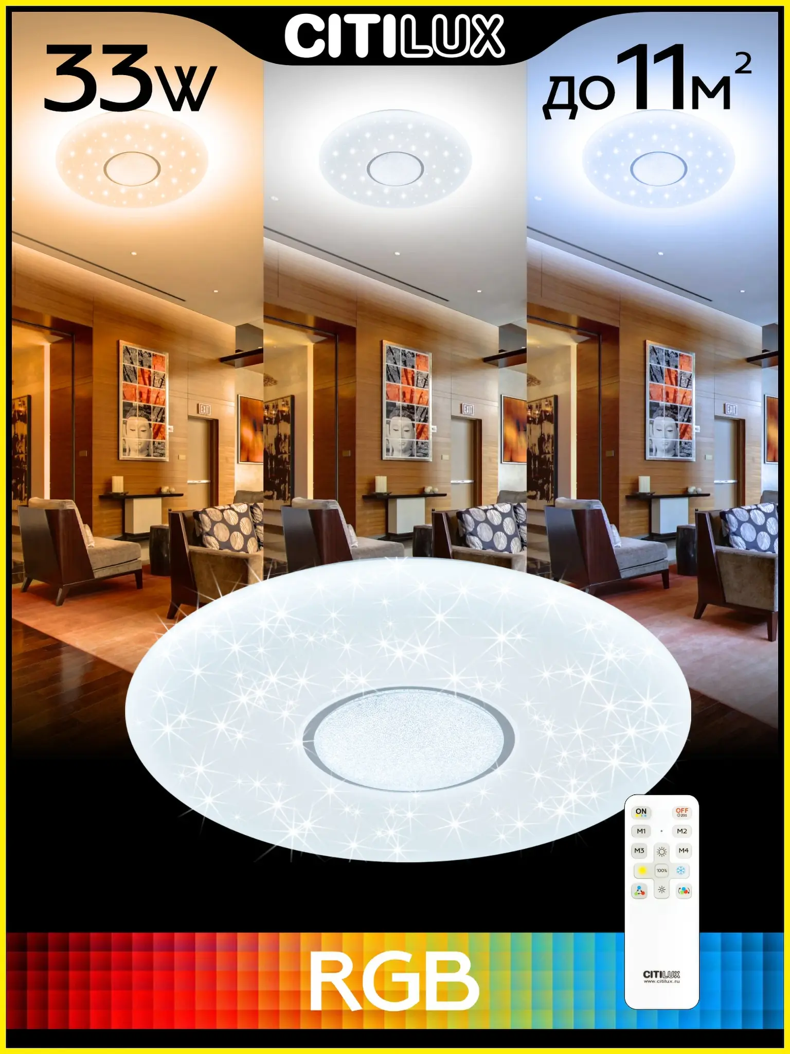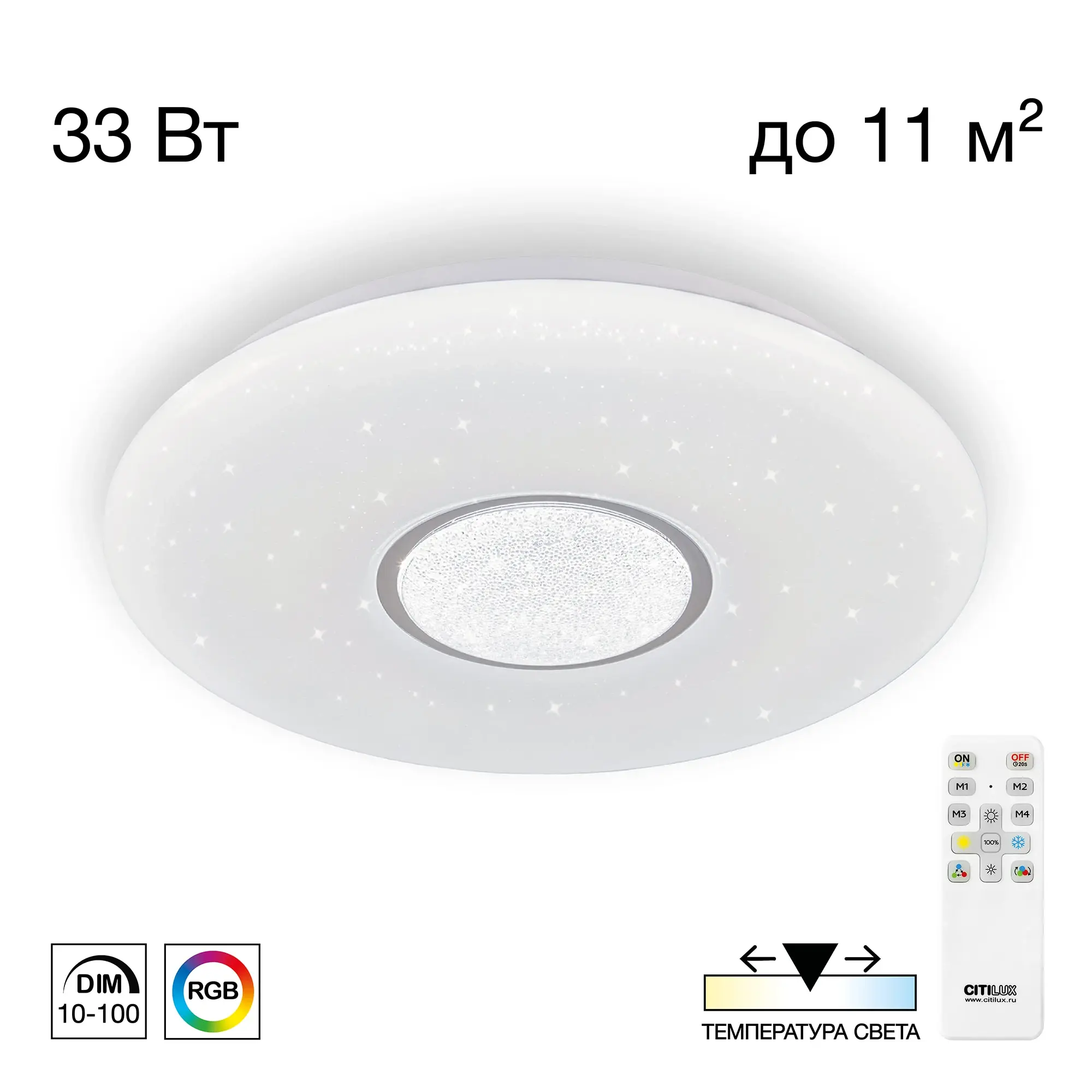 Светодиодная потолочная люстра Ситилюкс Санта CL723330G RGB является ярким представителем современных управляемых светильников. Основание модели металлическое. Плафон белый глянцевый с эффектом звездного неба и декоративным кольцом цвета хром. Светильник таблетка накладной, круглой формы, крепление подходит для всех типов потолков, в том числе натяжных. Модель управляется с помощью пульта дистанционного управления или с настенного выключателя. Пульт ДУ в комплекте, тип батареек ААА (батарейками не комплектуется). С помощью пульта доступно: плавная регулировка яркости от 10 до 100%; управление цветовой температурой в диапазоне от 3000К до 5500К, с возможностью настроить любые оттенки теплого, нейтрального и холодного света; выбор режимов "сочной" цветной RGB подсветка всего плафона. Свет без мерцаний и пульсаций. Есть четыре настраиваемых режима памяти, от М1 до М4, которыми также можно управлять с настенного выключателя. Мощность светильника 33Вт, световой поток 2700Лм, что эквивалентно 330Вт ламп накаливания. Площадь освещения около 11 кв. метров. Свет без мерцаний и пульсаций.