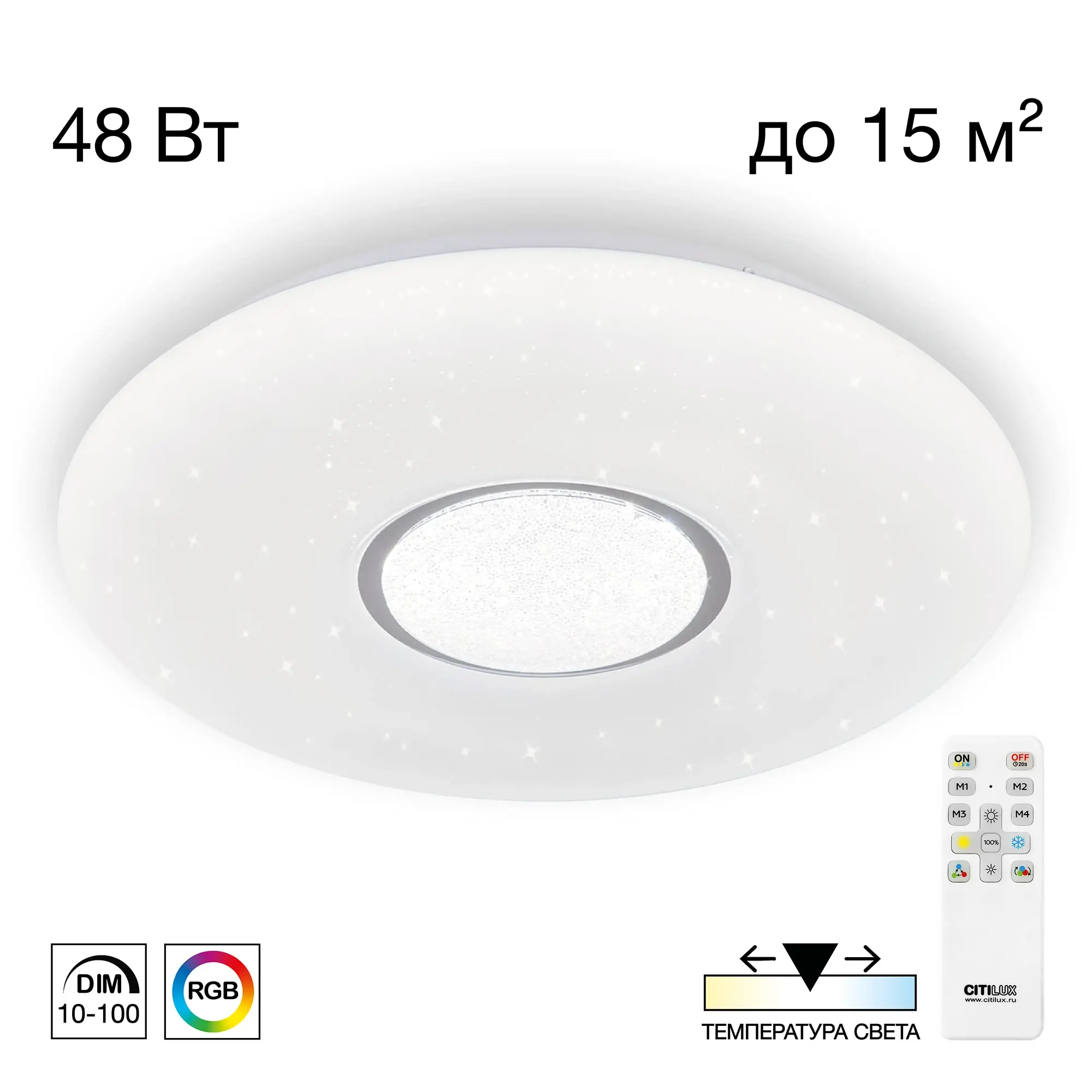 Светодиодная потолочная люстра Ситилюкс Санта CL723480G RGB является ярким представителем современных управляемых светильников. Основание модели металлическое. Плафон белый глянцевый с эффектом звездного неба и декоративным кольцом цвета хром. Светильник таблетка накладной, круглой формы, крепление подходит для всех типов потолков, в том числе натяжных. Модель управляется с помощью пульта дистанционного управления или с настенного выключателя. Пульт ДУ в комплекте, тип батареек ААА (батарейками не комплектуется). С помощью пульта доступно: плавная регулировка яркости от 10 до 100%; управление цветовой температурой в диапазоне от 3000К до 5500К, с возможностью настроить любые оттенки теплого, нейтрального и холодного света; выбор режимов "сочной" цветной RGB подсветка всего плафона. Свет без мерцаний и пульсаций. Есть четыре настраиваемых режима памяти, от М1 до М4, которыми также можно управлять с настенного выключателя. Мощность светильника 48Вт, световой поток 4100Лм, что эквивалентно 480Вт ламп накаливания. Площадь освещения около 16 кв. метров.