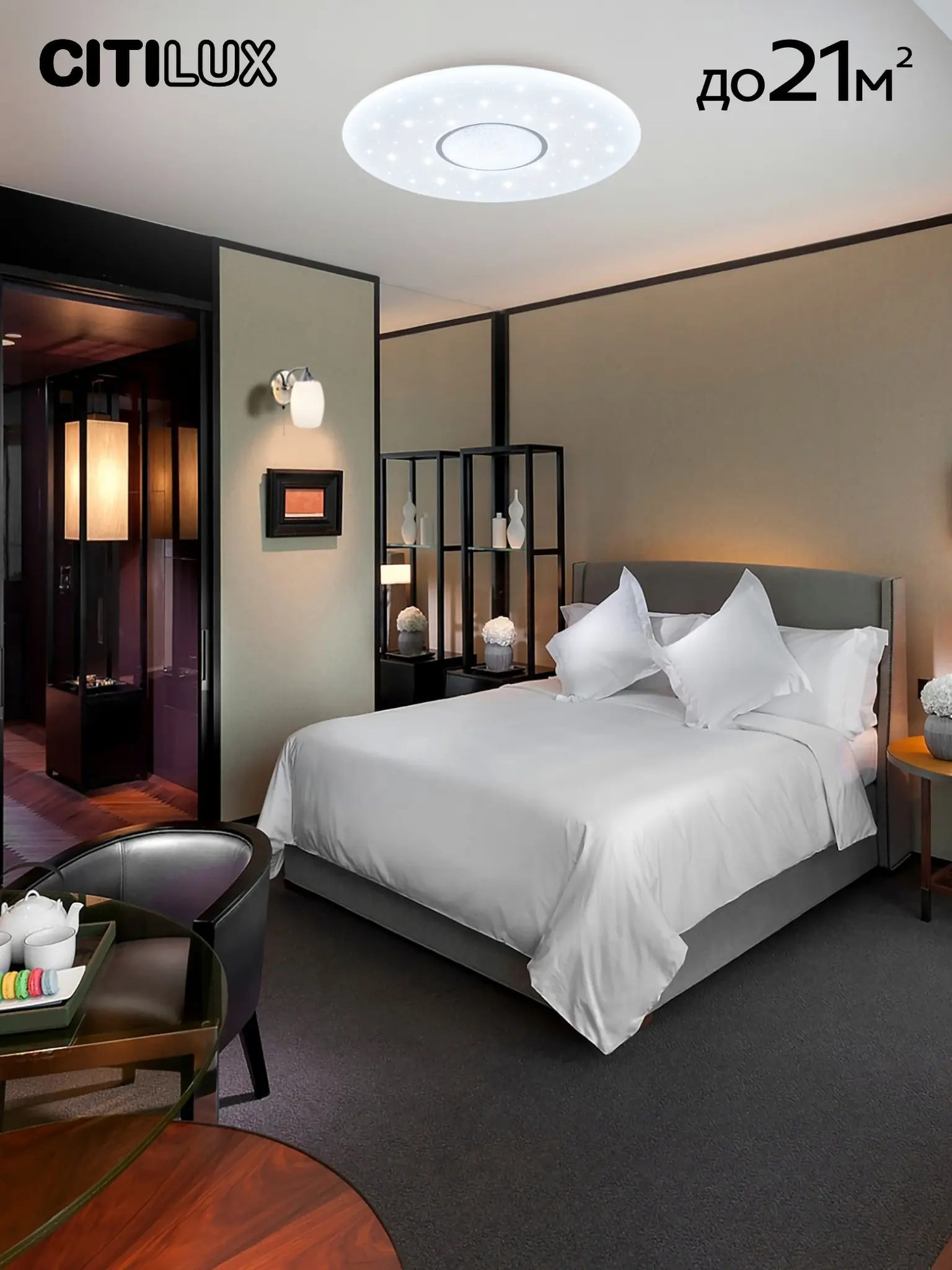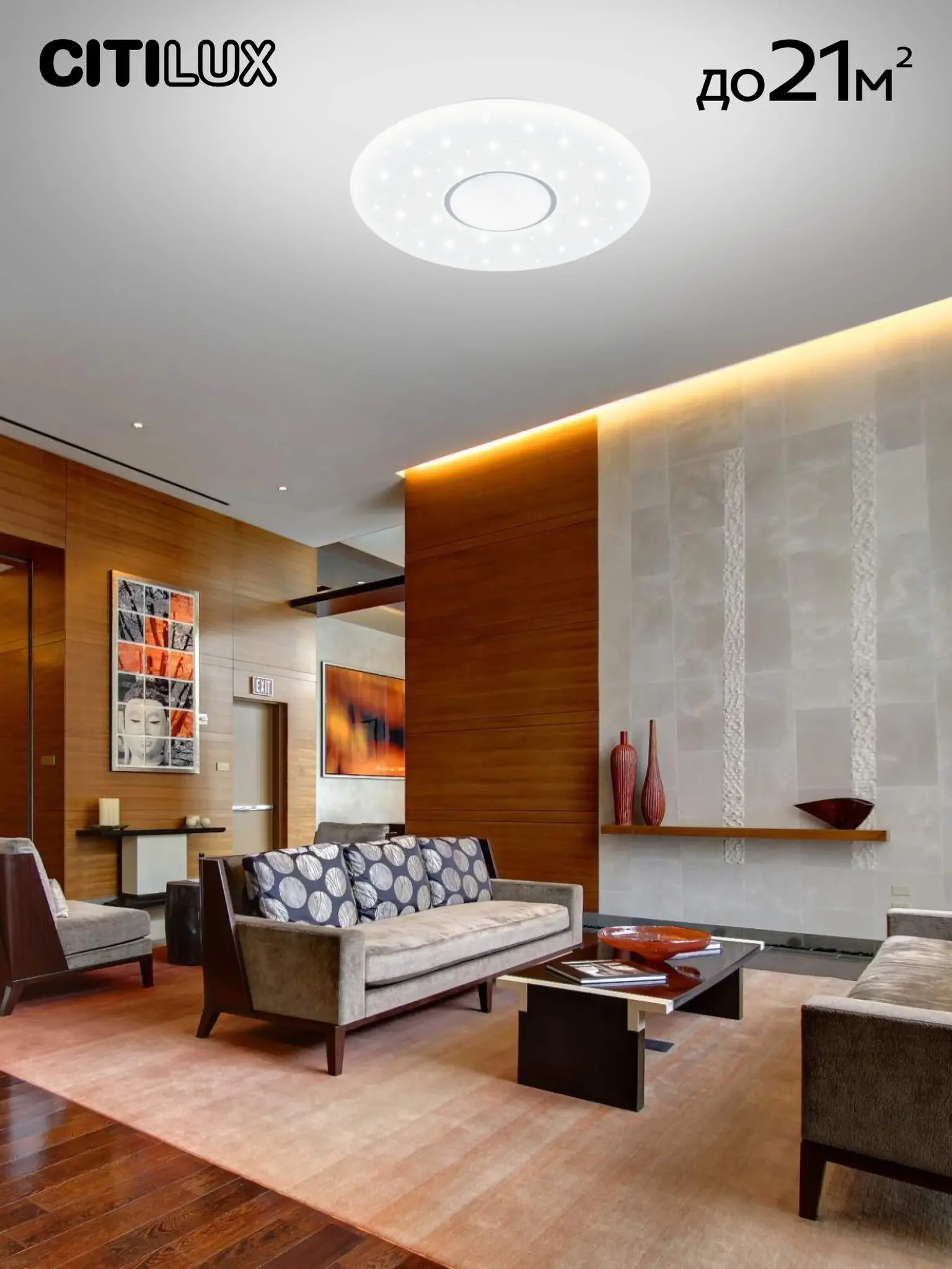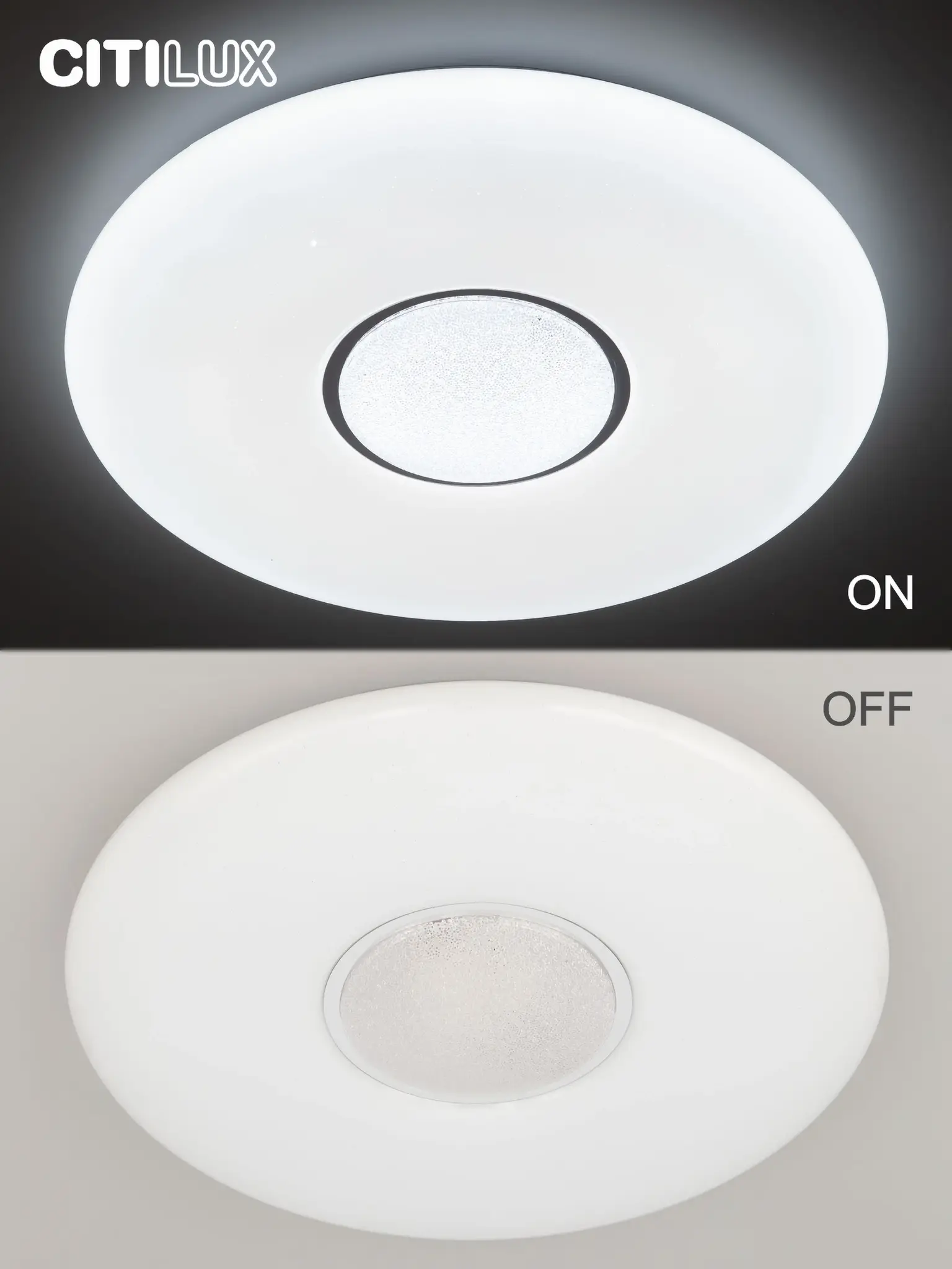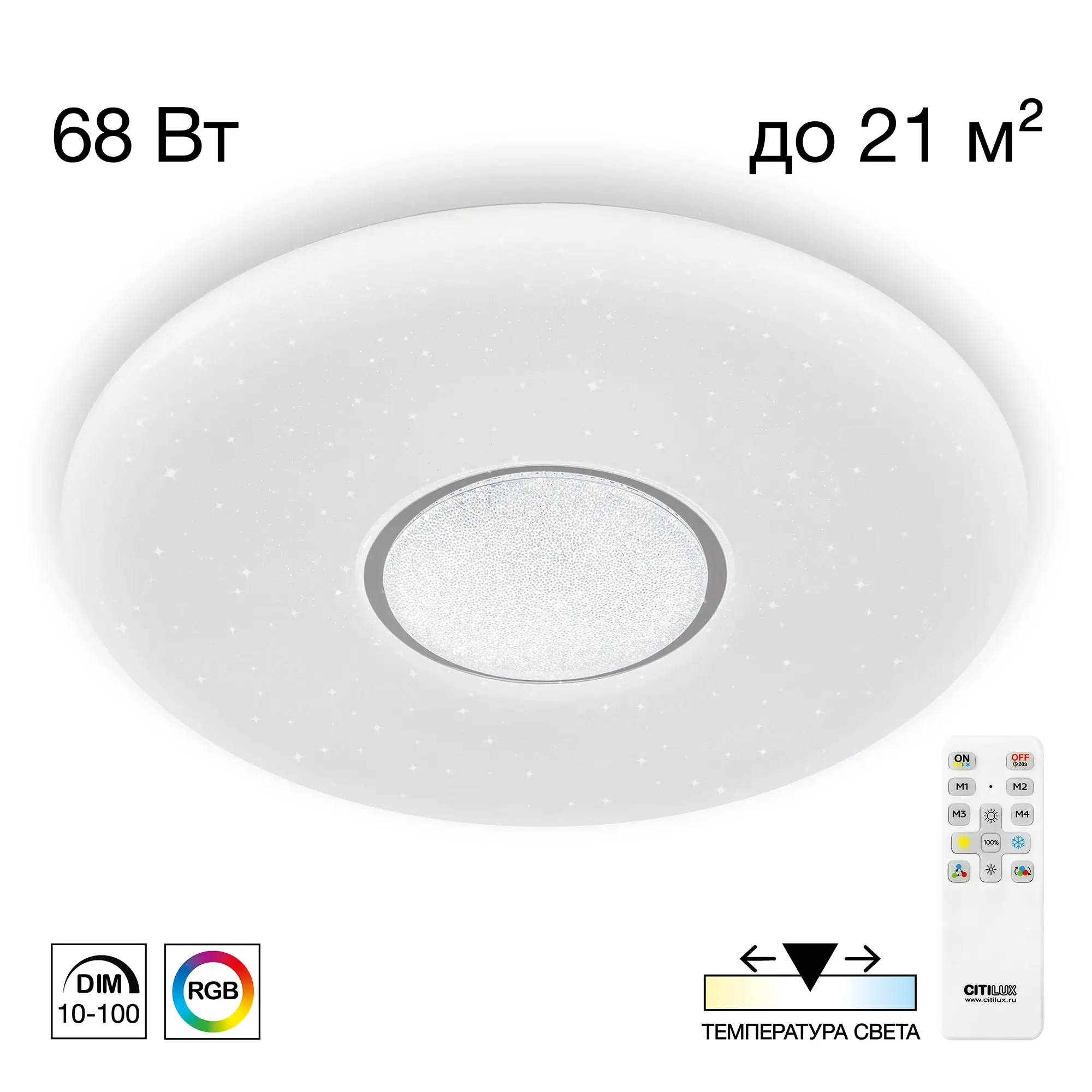 Светодиодная потолочная люстра Ситилюкс Санта CL723680G RGB является ярким представителем современных управляемых светильников. Основание модели металлическое. Плафон белый глянцевый, из оптического полимера, с эффектом звездного неба и декоративным кольцом цвета хром. Светильник таблетка накладной, круглой формы, крепление подходит для всех типов потолков, в том числе натяжных. Модель управляется с помощью пульта дистанционного управления или с настенного выключателя. Пульт ДУ в комплекте, тип батареек ААА (батарейками не комплектуется). С помощью пульта доступно: плавная регулировка яркости от 10 до 100%; управление цветовой температурой в диапазоне от 3000К до 5500К, с возможностью настроить любые оттенки теплого, нейтрального и холодного света; выбор режимов "сочной" цветной RGB подсветки всего плафона. Есть четыре настраиваемых режима памяти, М1, М2, М3, М4, которыми также можно управлять с настенного выключателя. Мощность светильника 68Вт, световой поток 5800Лм, что эквивалентно 680Вт ламп накаливания. Площадь освещения около 21 кв. метров. Свет без мерцаний и пульсаций.