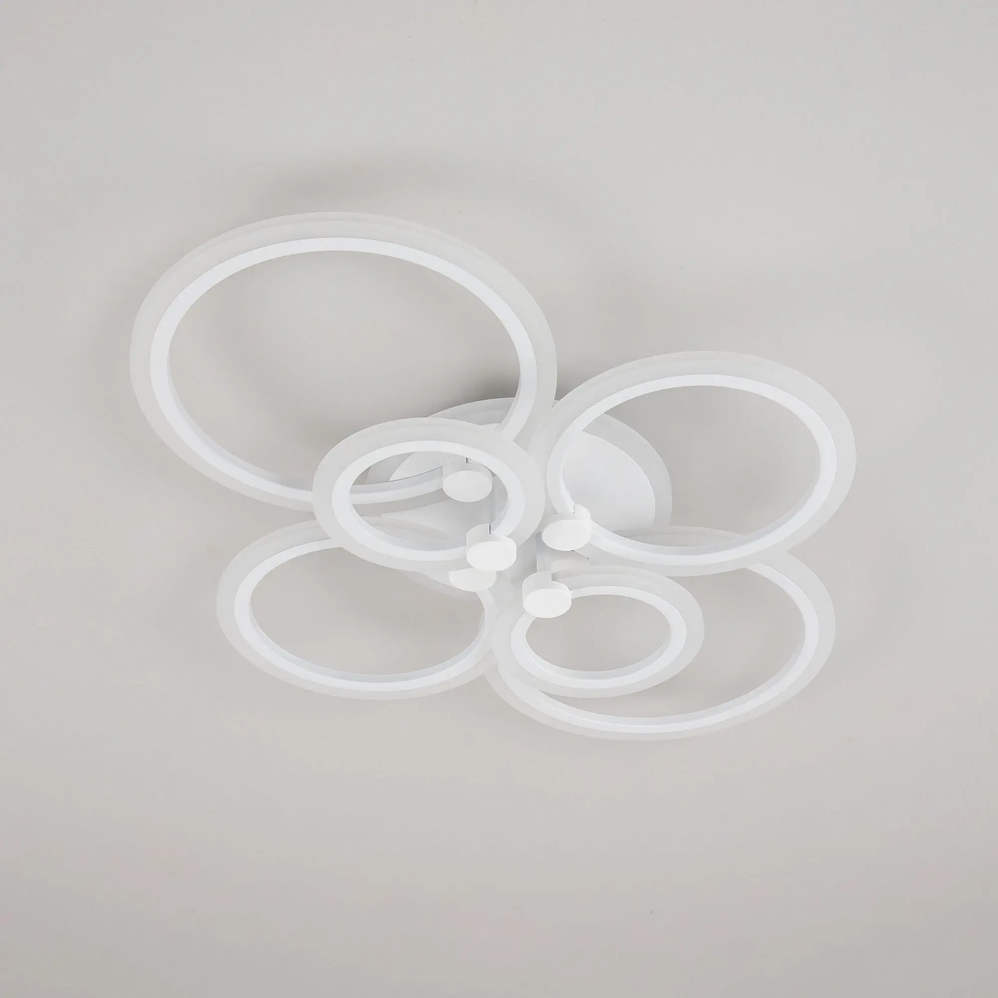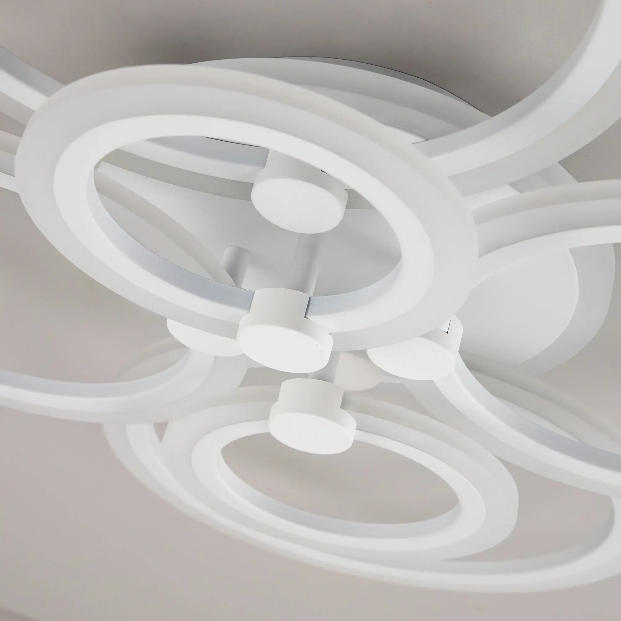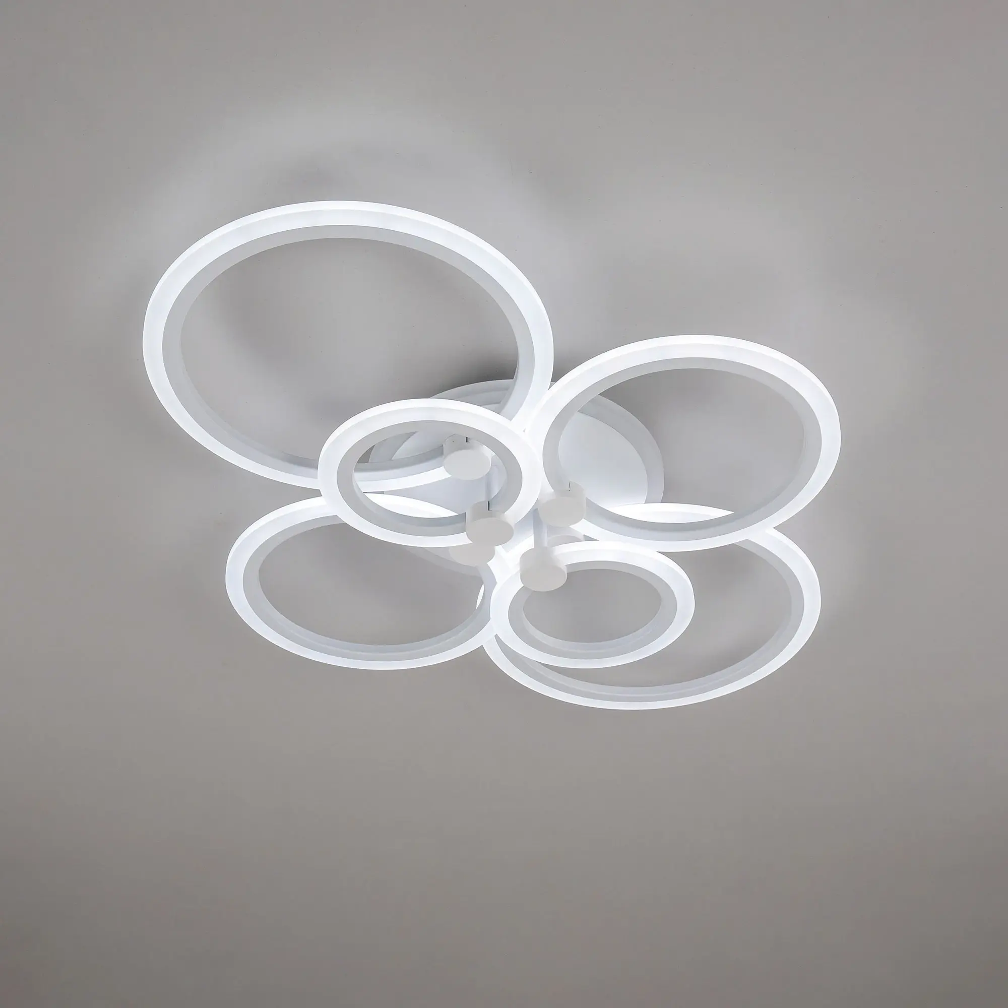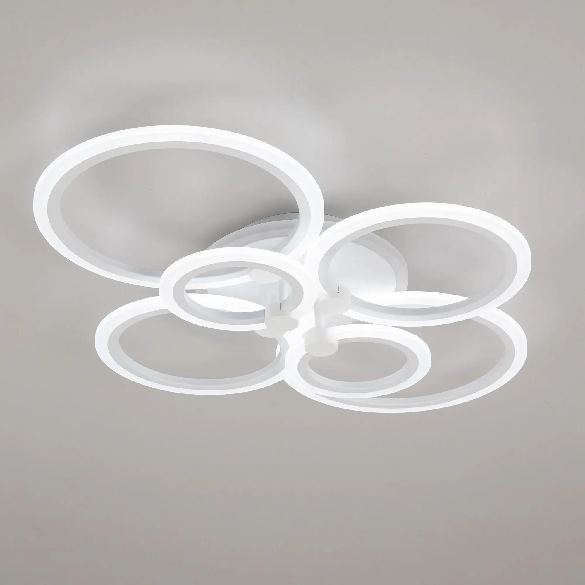 Люстра светодиодная Citilux Сента CL237B160E управляемая. Корпус металлический, цвет белый матовый. Основание круглое, шесть светодиодных модулей-плафонов в формы колец. Светильником можно управлять с помощью радиопульта дистанционного управления и настенным выключателем. Мощность изделия 90Вт, световой поток 7200Лм, осветит около 25м². Пульт ДУ в комплекте, тип батареек ААА (батарейками не комплектуется).