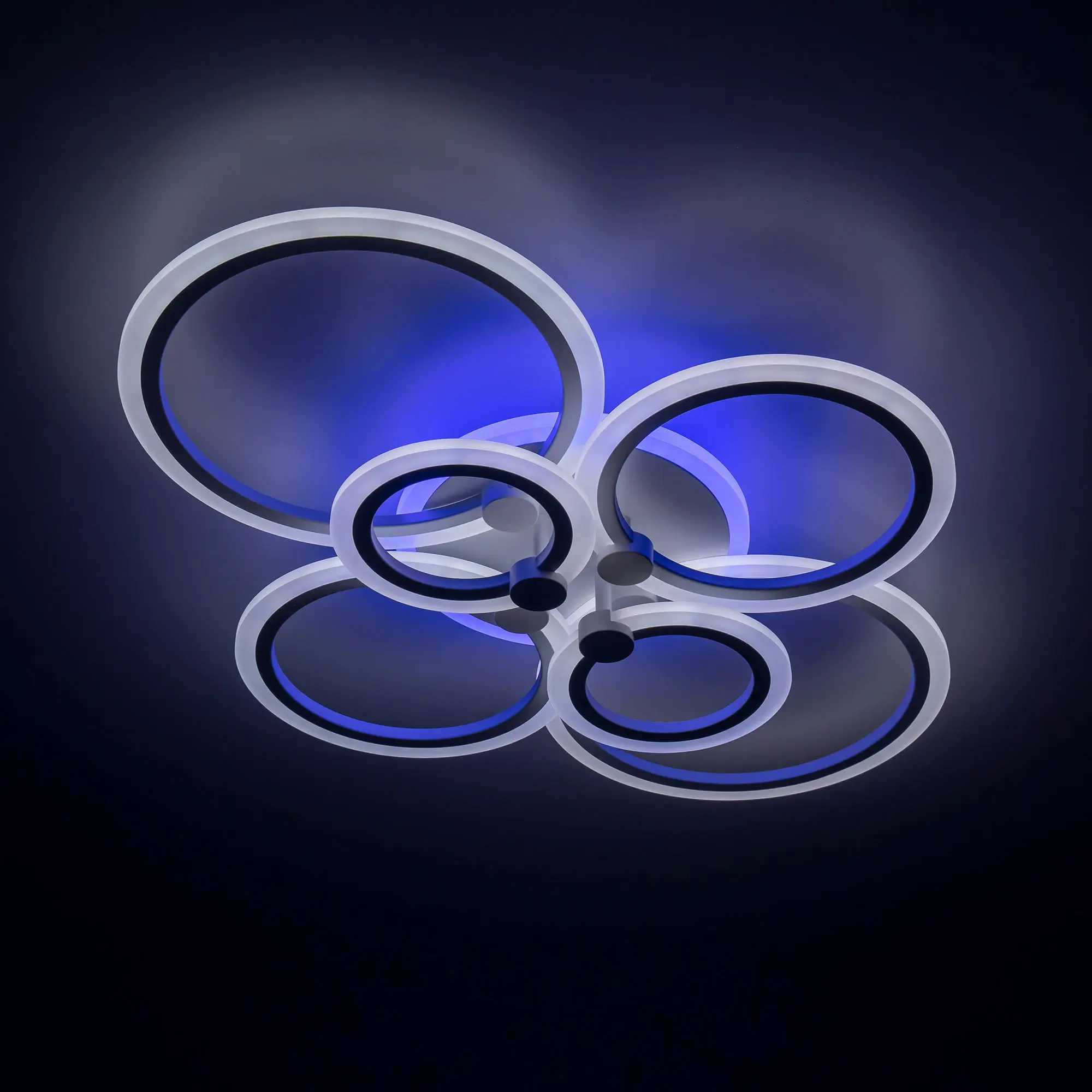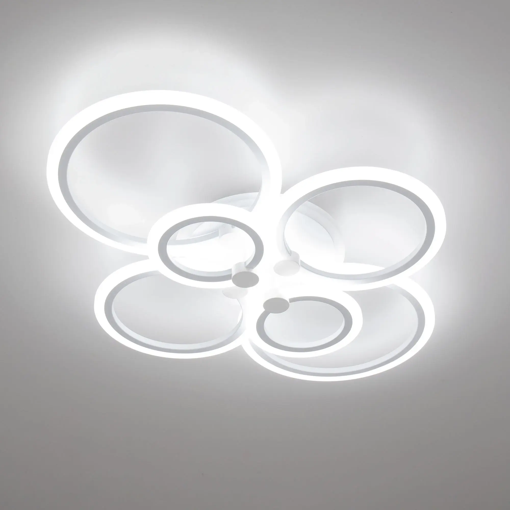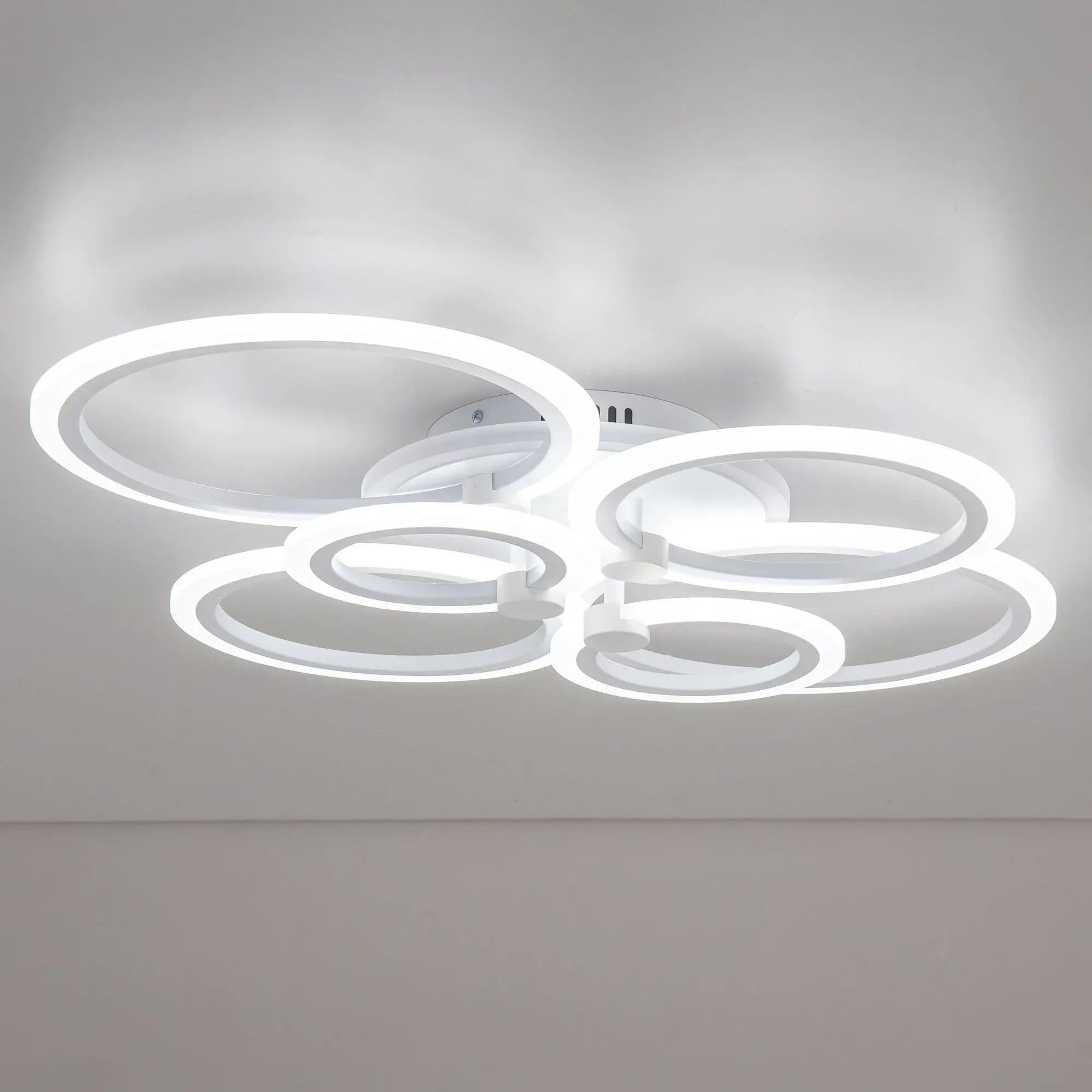 Люстра светодиодная Citilux Сента CL237B160E управляемая. Корпус металлический, цвет белый матовый. Основание круглое, шесть светодиодных модулей-плафонов в формы колец. Светильником можно управлять с помощью радиопульта дистанционного управления и настенным выключателем. Мощность изделия 90Вт, световой поток 7200Лм, осветит около 25м². Пульт ДУ в комплекте, тип батареек ААА (батарейками не комплектуется).