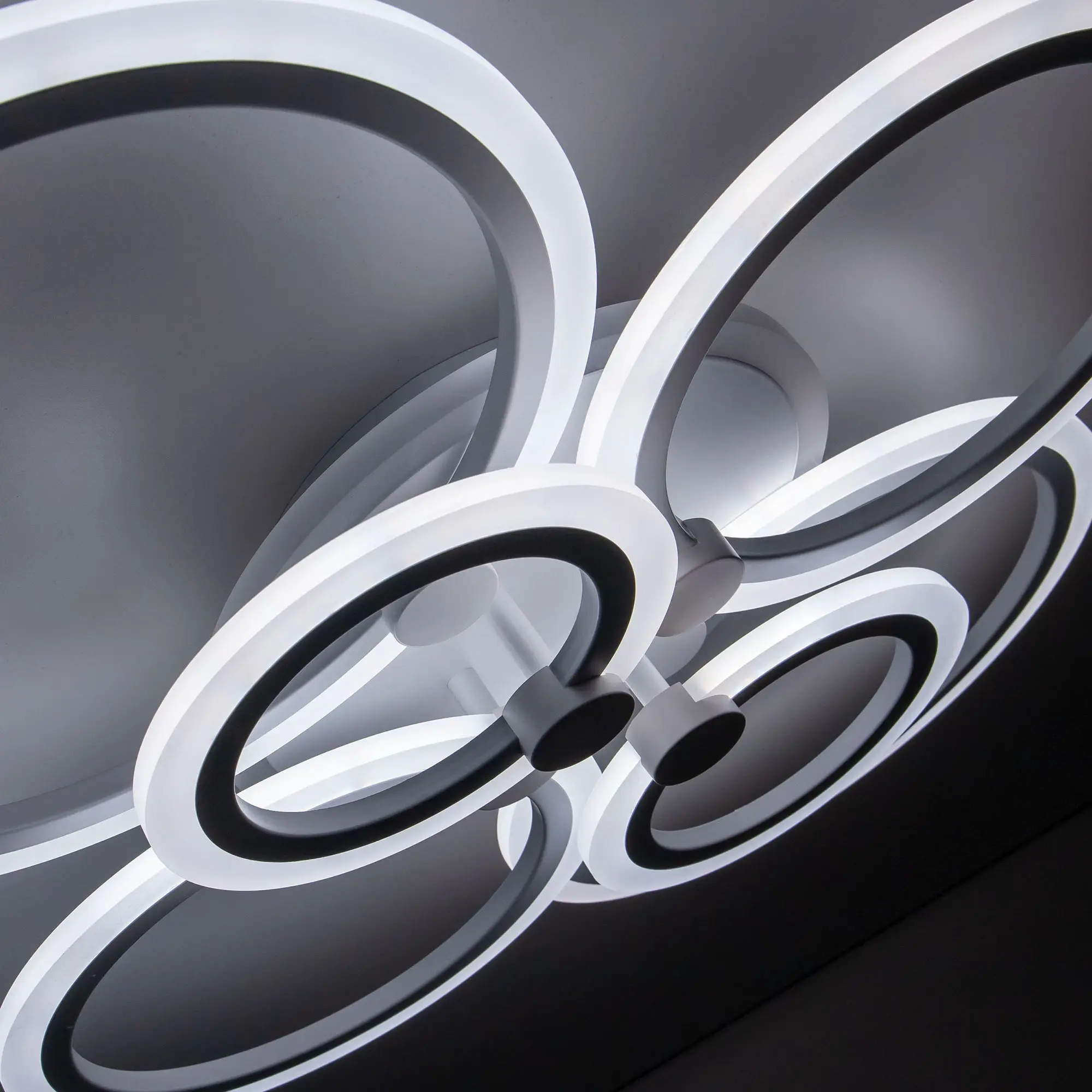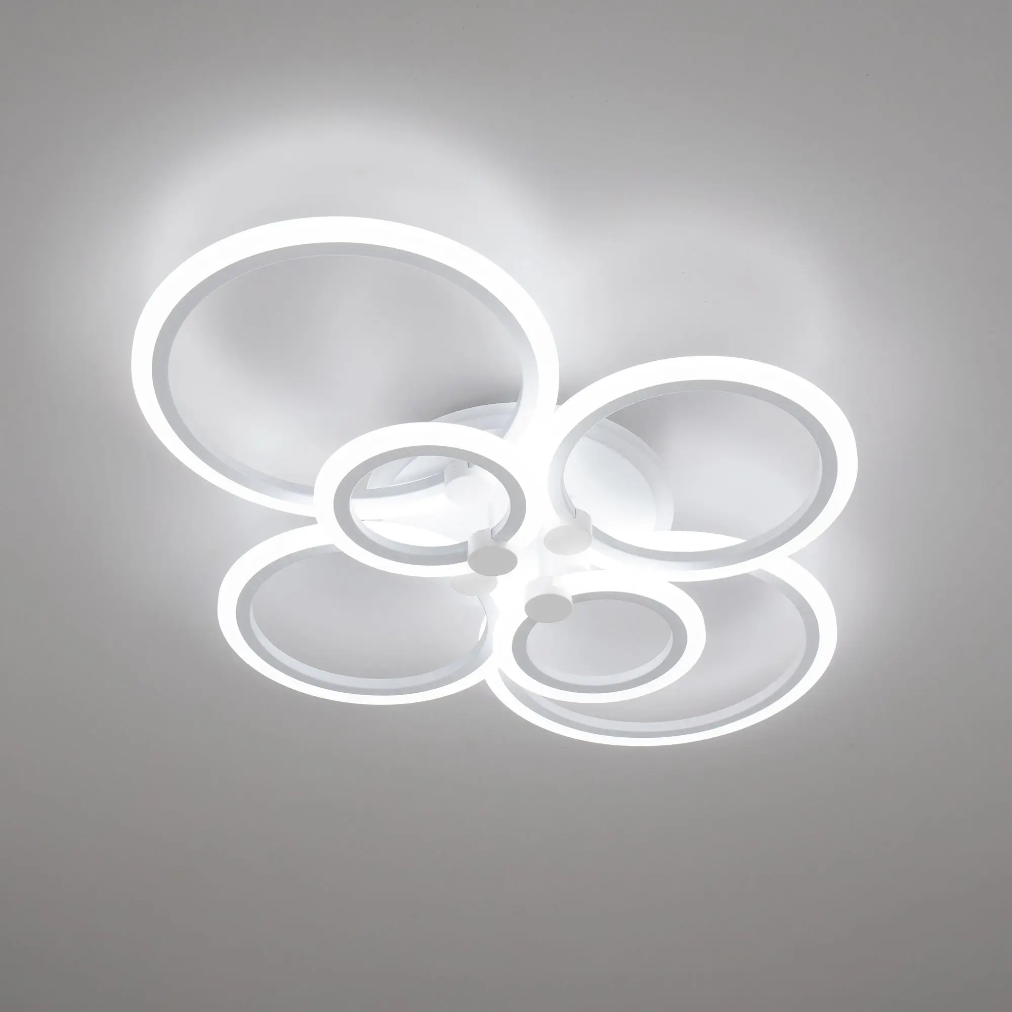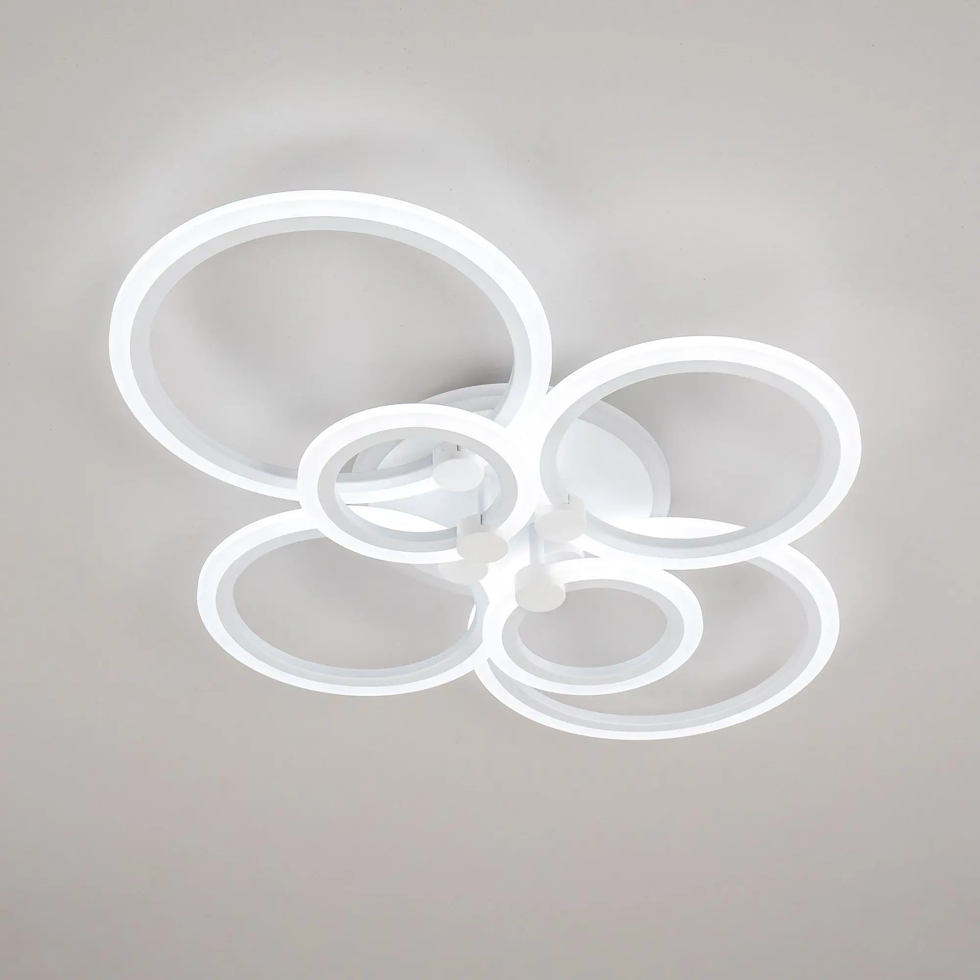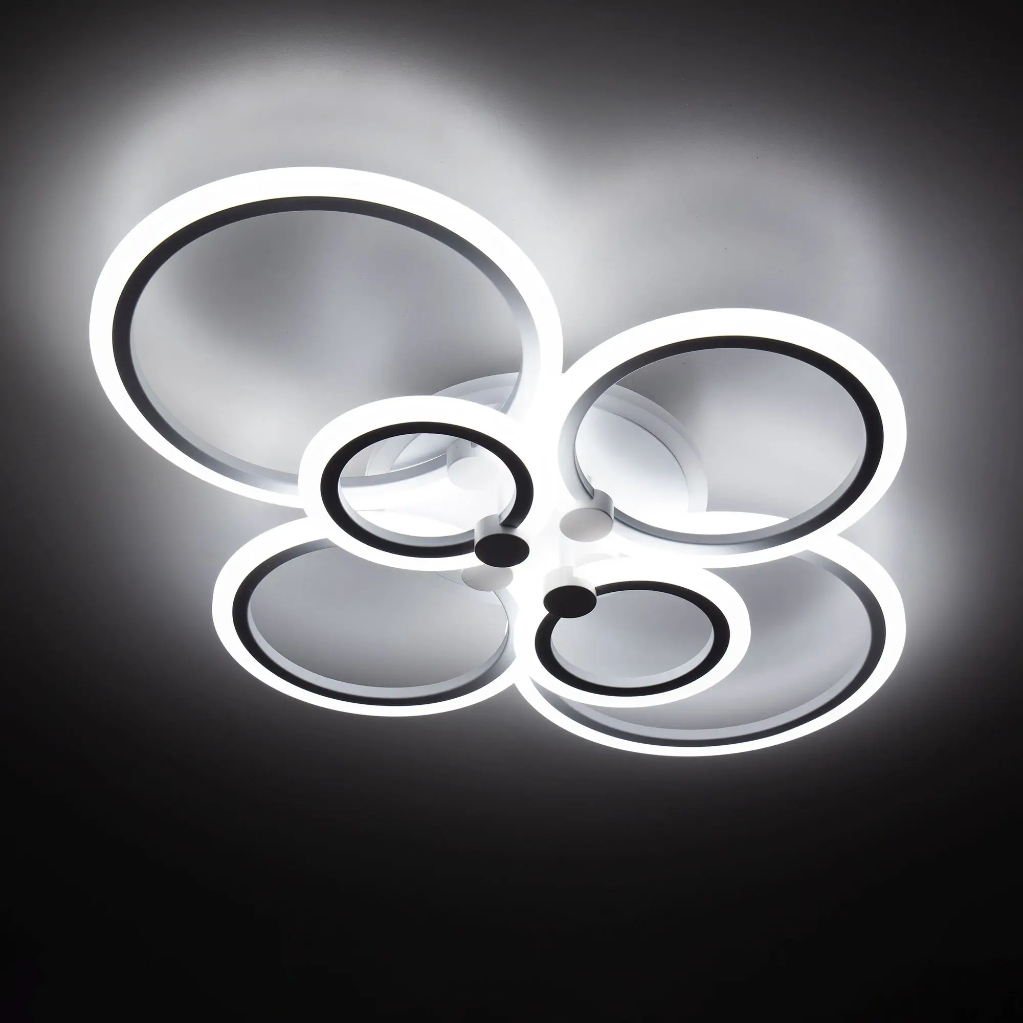 Люстра светодиодная Citilux Сента CL237B160E управляемая. Корпус металлический, цвет белый матовый. Основание круглое, шесть светодиодных модулей-плафонов в формы колец. Светильником можно управлять с помощью радиопульта дистанционного управления и настенным выключателем. Мощность изделия 90Вт, световой поток 7200Лм, осветит около 25м². Пульт ДУ в комплекте, тип батареек ААА (батарейками не комплектуется).