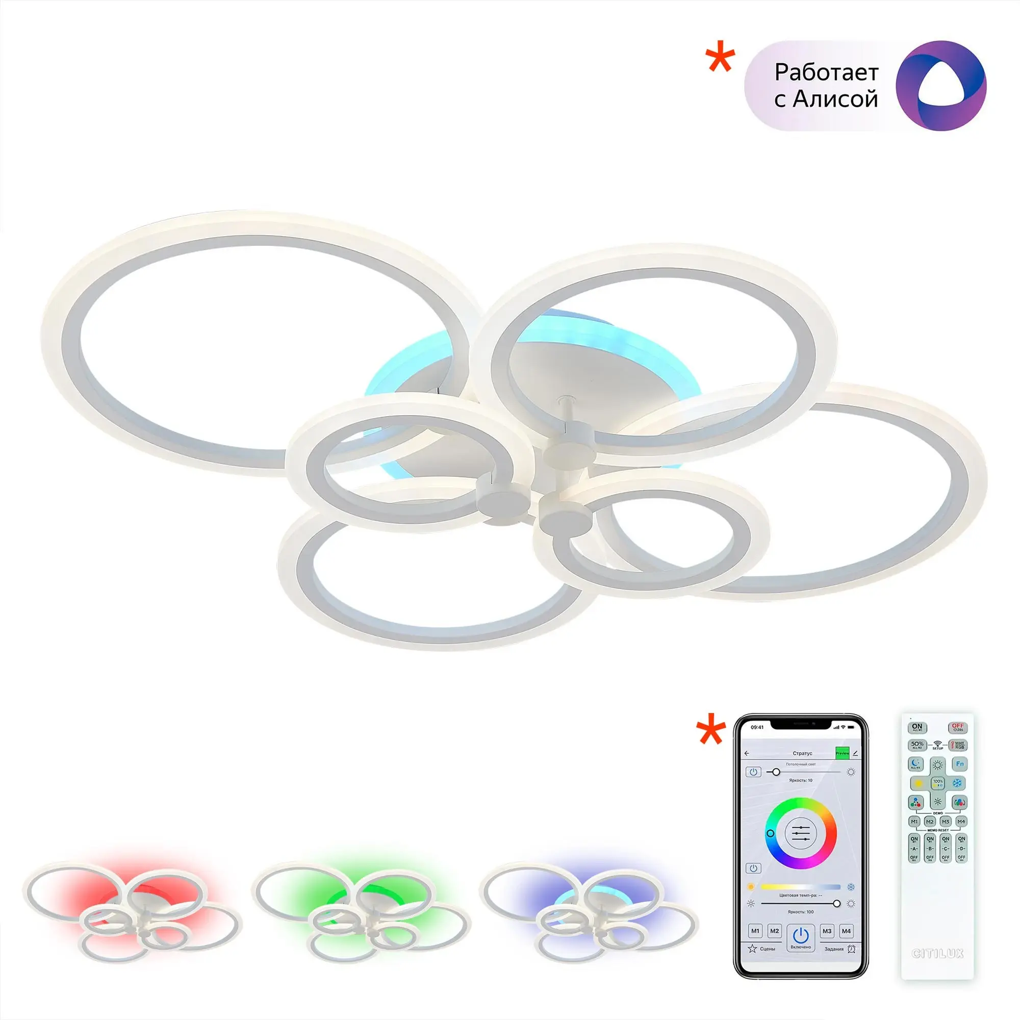 * Опционально: при установке дополнительного смарт-модуля Citilux CLR1M (не входит в комплект, приобретается отдельно) светильник становится УМНЫМ. Используя сеть Wi-Fi, при наличии интернет-соединения можно полноценно управлять всеми режимами работы светильника из приложения Citilux Smart со смартфона или планшета, а также с помощью голосовых помощников Алиса от Яндекс и Маруся от mail.ru