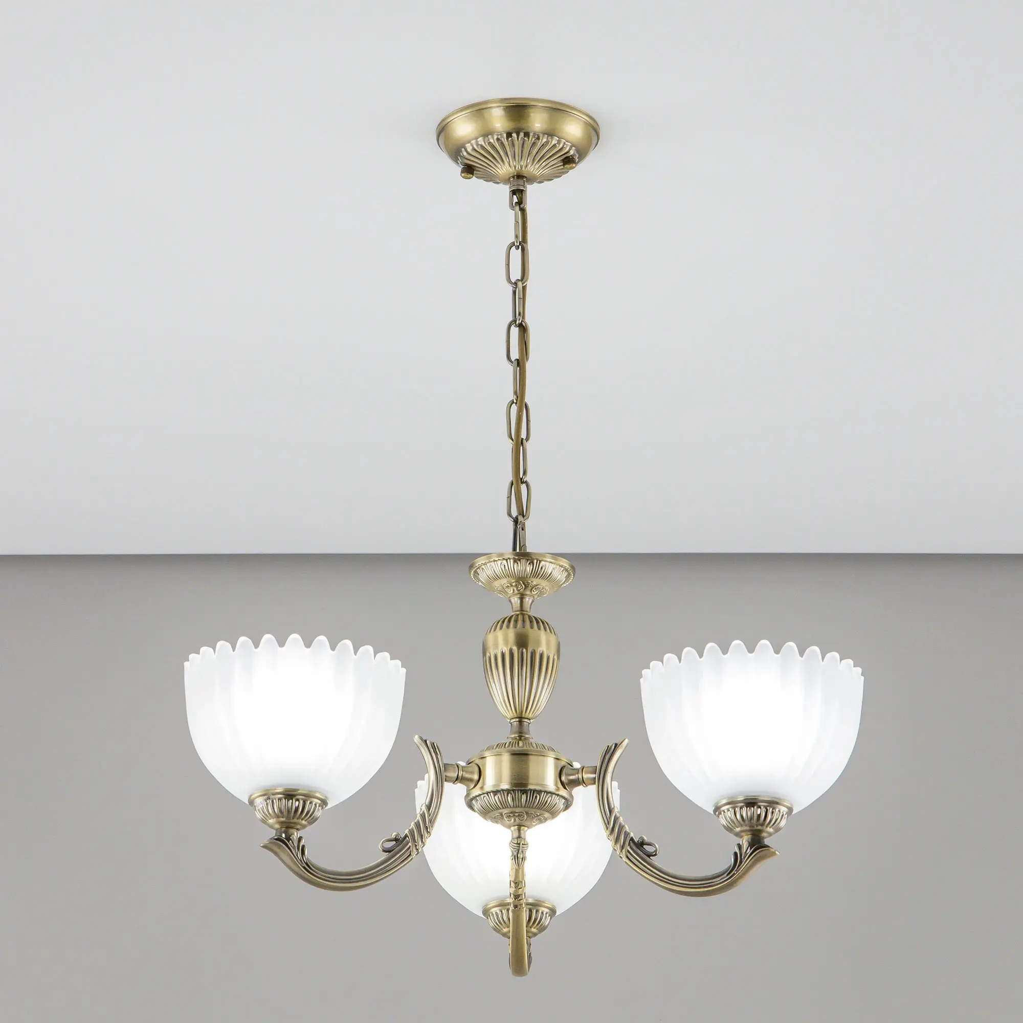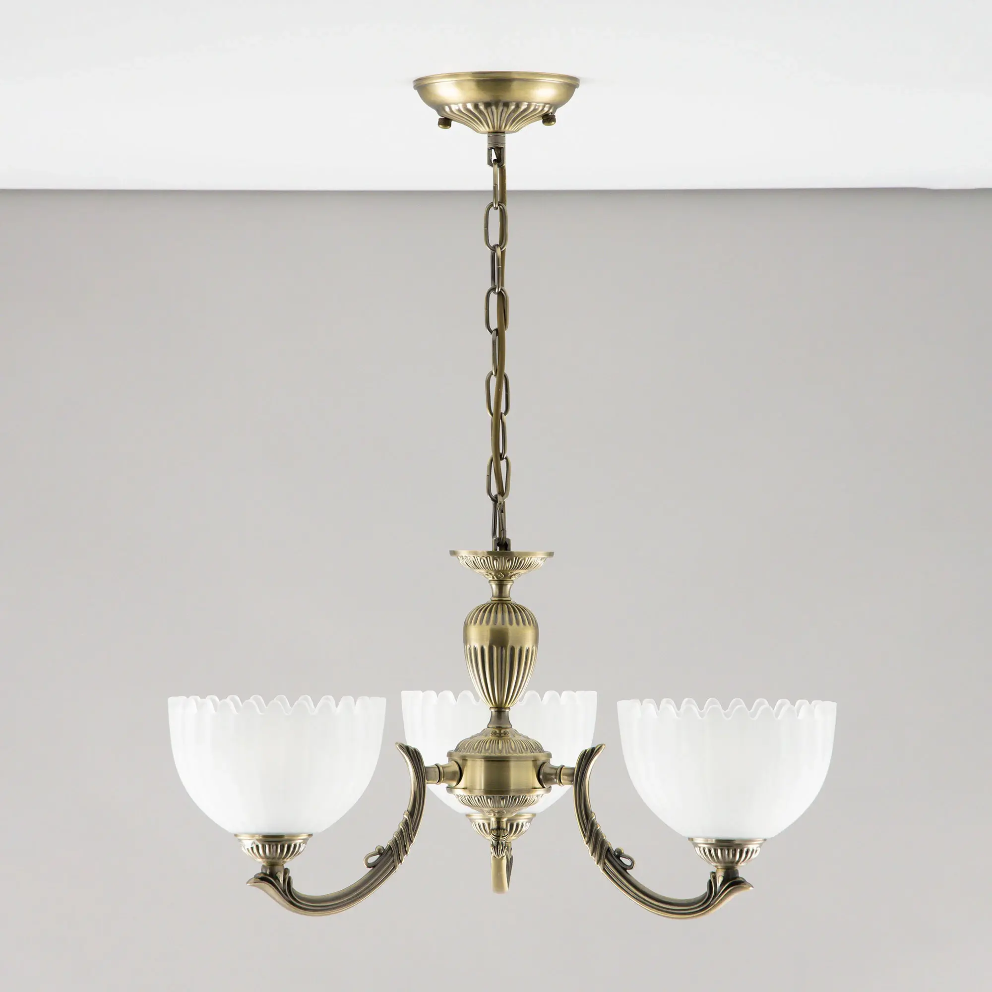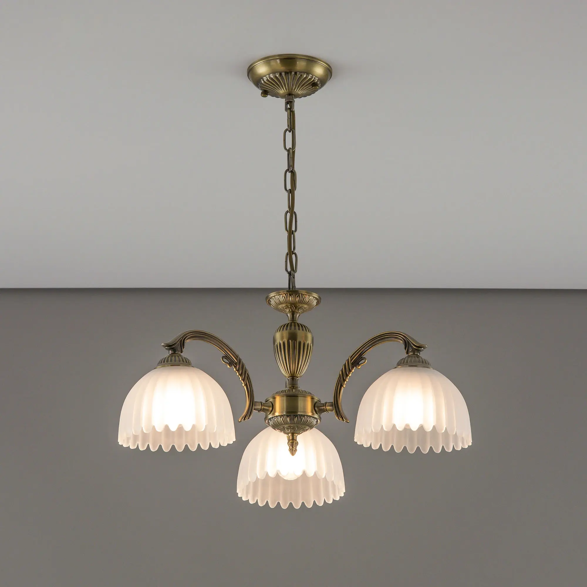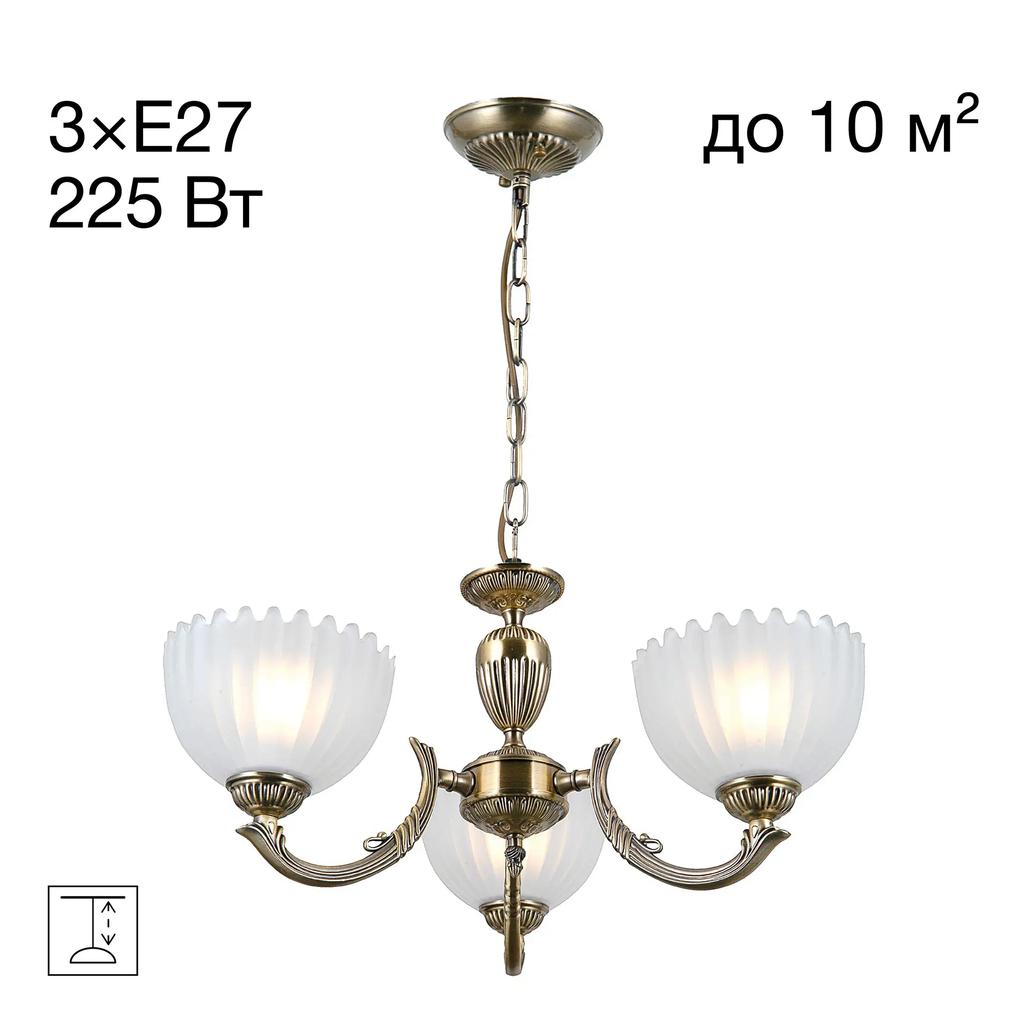 Люстра Citilux Севилья CL414133 выполнена в классическом стиле. Корпус светильника металлический, с литыми рожками, цвет бронза. Плафоны стеклянные, полуматовые, рифленые. Конструкция позволяет собрать модель как подвесную трехрожковую люстру, с плафонами направленными вверх, дающую мягкий отраженный свет или более яркий вариант с плафонами вниз. Если в помещении низкие потолки, изделие можно собрать вообще без элементов цепи, как потолочную люстру с рожками вниз. Тип крепления к потолку – планка. Более того, можно скоммутировать светильник для работы, как с одноклавишным, так и с двухклавишным выключателем. В модели используются 3 лампы с цоколем Е27 максимальной мощностью для ламп накаливания 75Вт. Светодиодные лампы можно использовать более яркие.
