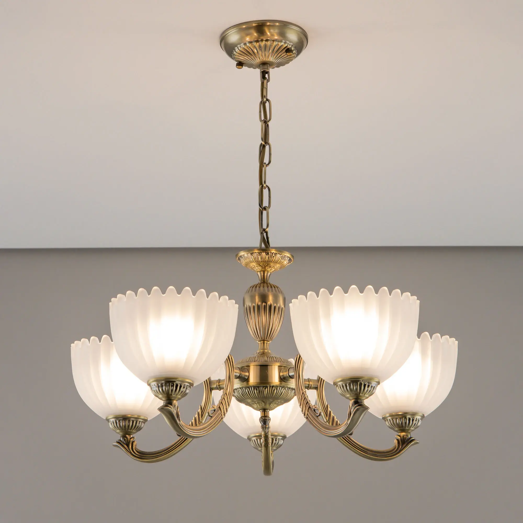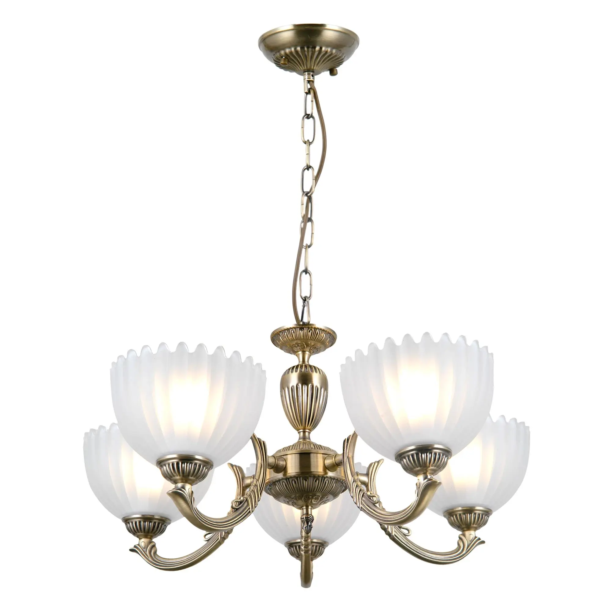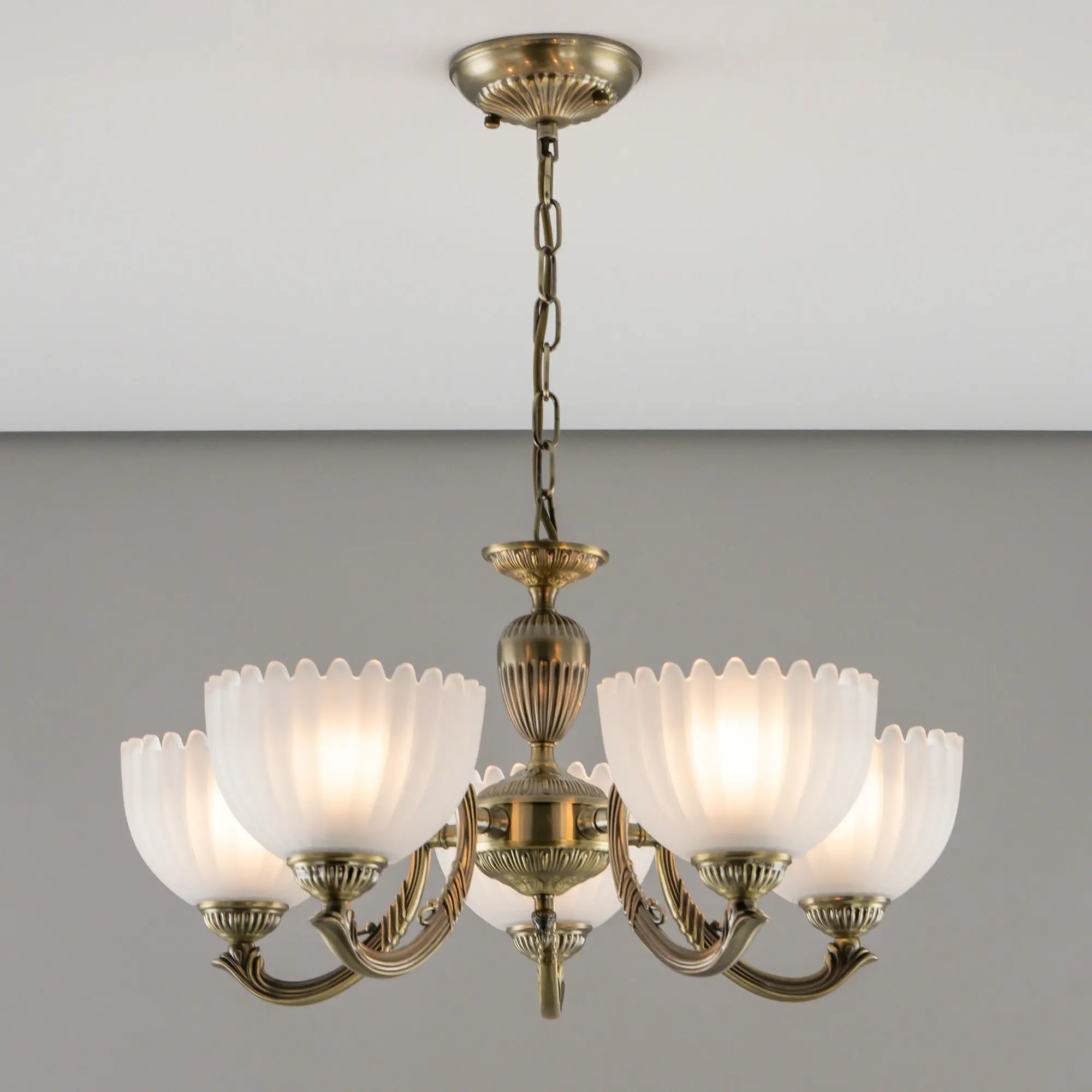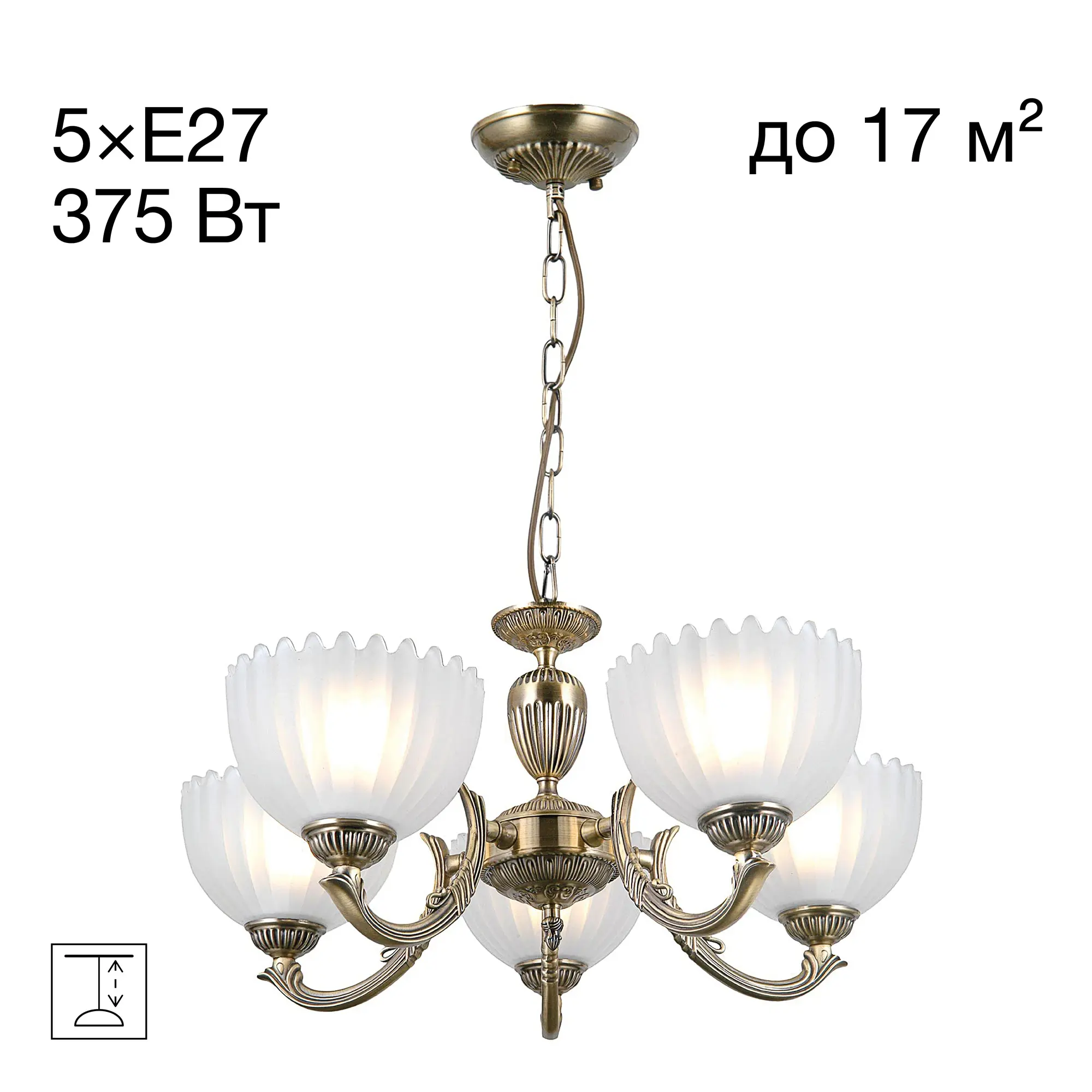 Люстра Citilux Севилья CL414153 выполнена в классическом стиле. Корпус светильника металлический, с литыми рожками, цвет бронза. Плафоны стеклянные, полуматовые, рифленые. Конструкция позволяет собрать модель как подвесную пятирожковую люстру, с плафонами направленными вверх, дающую мягкий отраженный свет или более яркий вариант с плафонами вниз. Если в помещении низкие потолки, изделие можно собрать вообще без элементов цепи, как потолочную люстру с рожками вниз. Тип крепления к потолку – планка. Более того, можно скоммутировать светильник для работы, как с одноклавишным, так и с двухклавишным выключателем. В модели используются 5 ламп с цоколем Е27 максимальной мощностью для ламп накаливания 75Вт. Светодиодные лампы можно использовать более яркие.