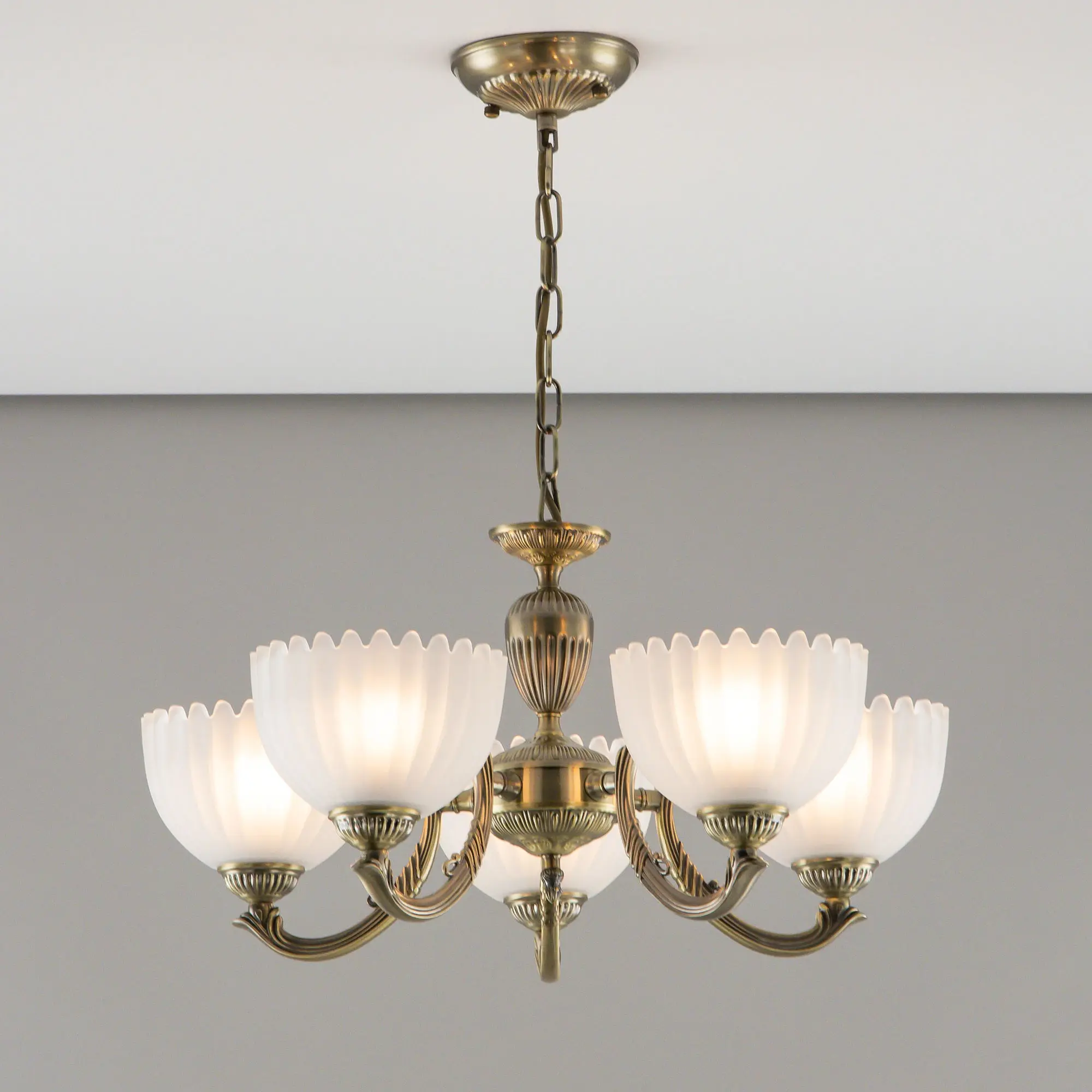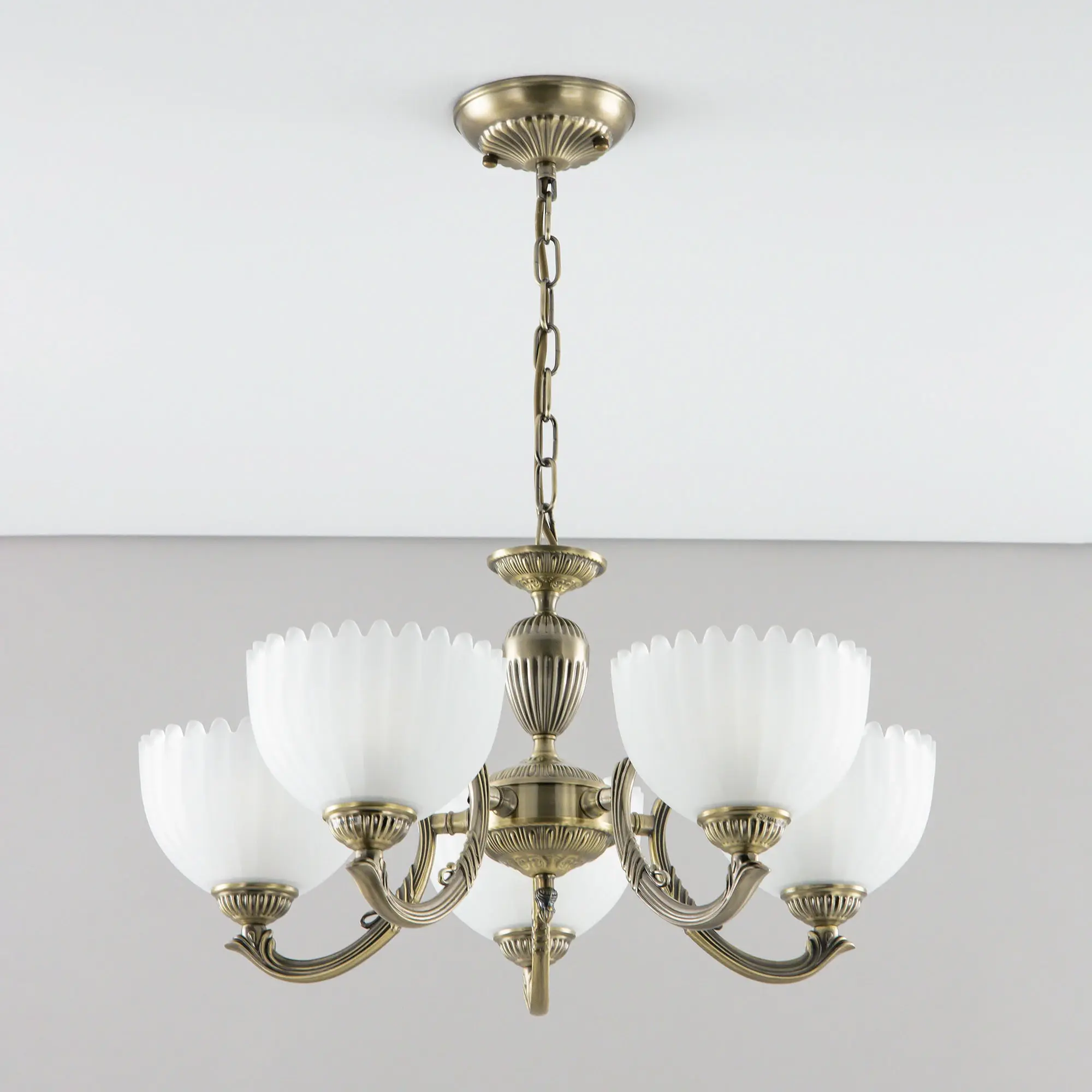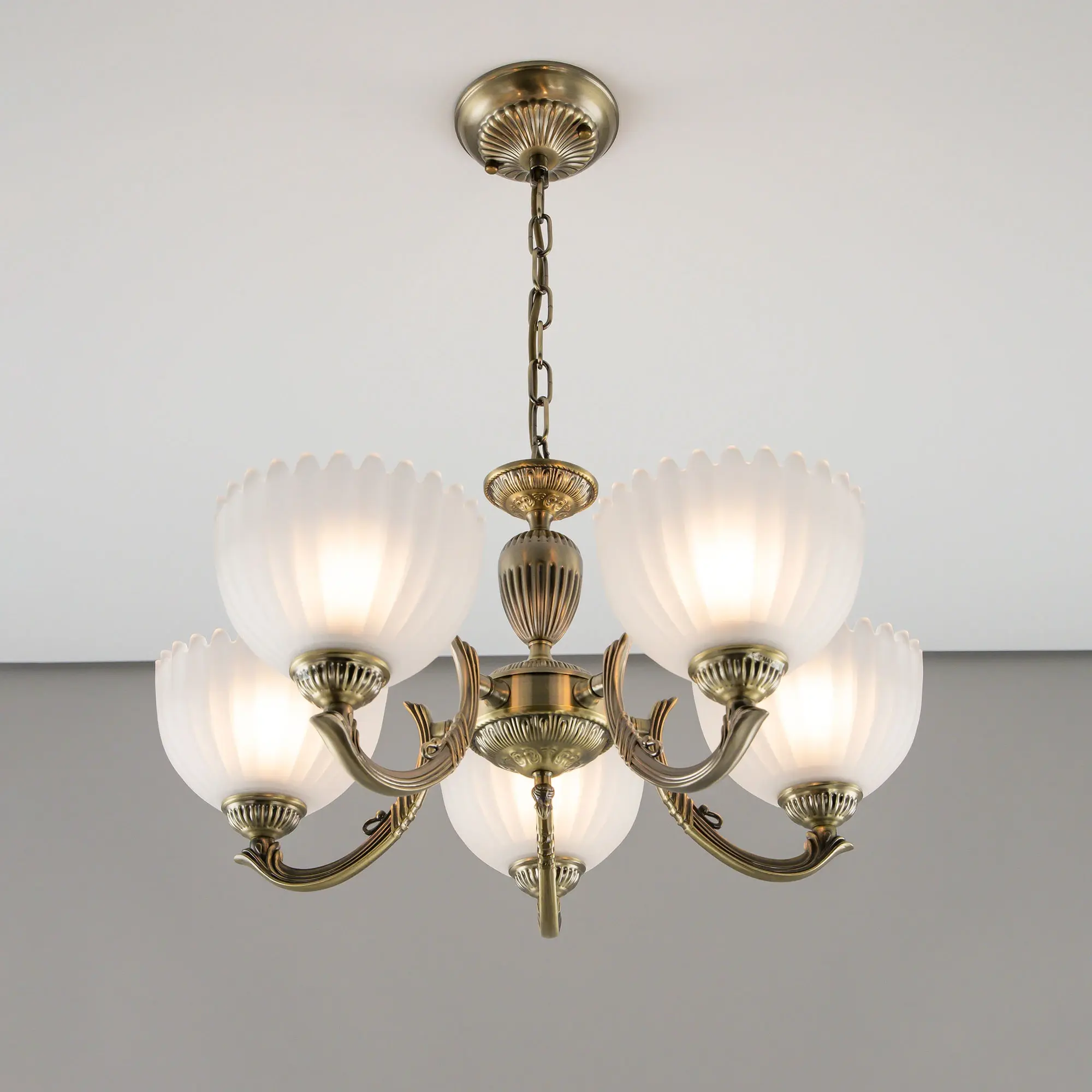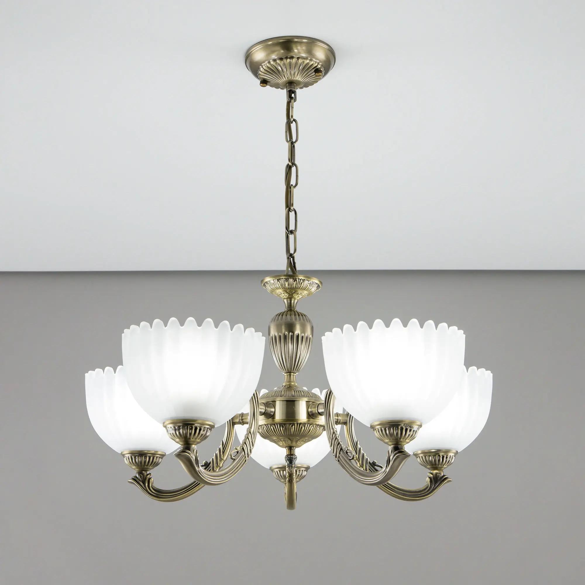 Люстра Citilux Севилья CL414153 выполнена в классическом стиле. Корпус светильника металлический, с литыми рожками, цвет бронза. Плафоны стеклянные, полуматовые, рифленые. Конструкция позволяет собрать модель как подвесную пятирожковую люстру, с плафонами направленными вверх, дающую мягкий отраженный свет или более яркий вариант с плафонами вниз. Если в помещении низкие потолки, изделие можно собрать вообще без элементов цепи, как потолочную люстру с рожками вниз. Тип крепления к потолку – планка. Более того, можно скоммутировать светильник для работы, как с одноклавишным, так и с двухклавишным выключателем. В модели используются 5 ламп с цоколем Е27 максимальной мощностью для ламп накаливания 75Вт. Светодиодные лампы можно использовать более яркие.