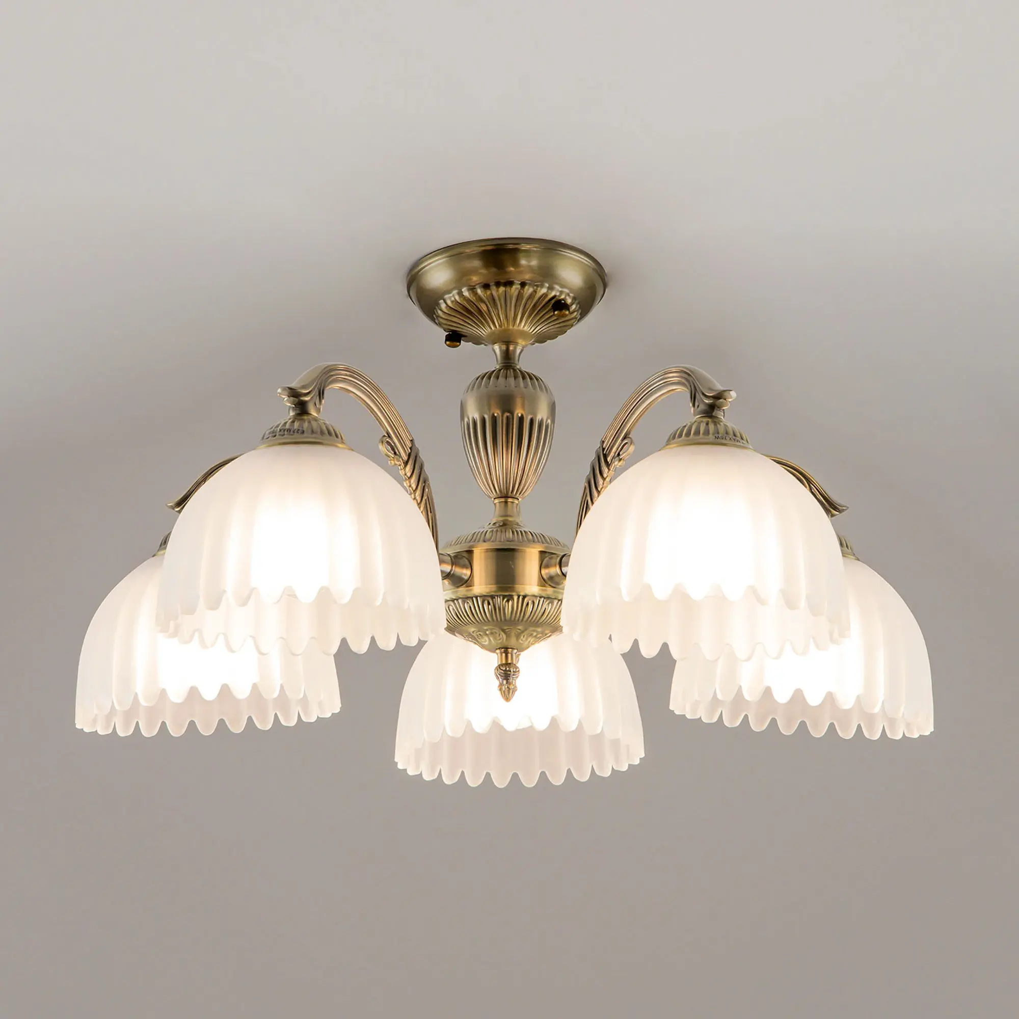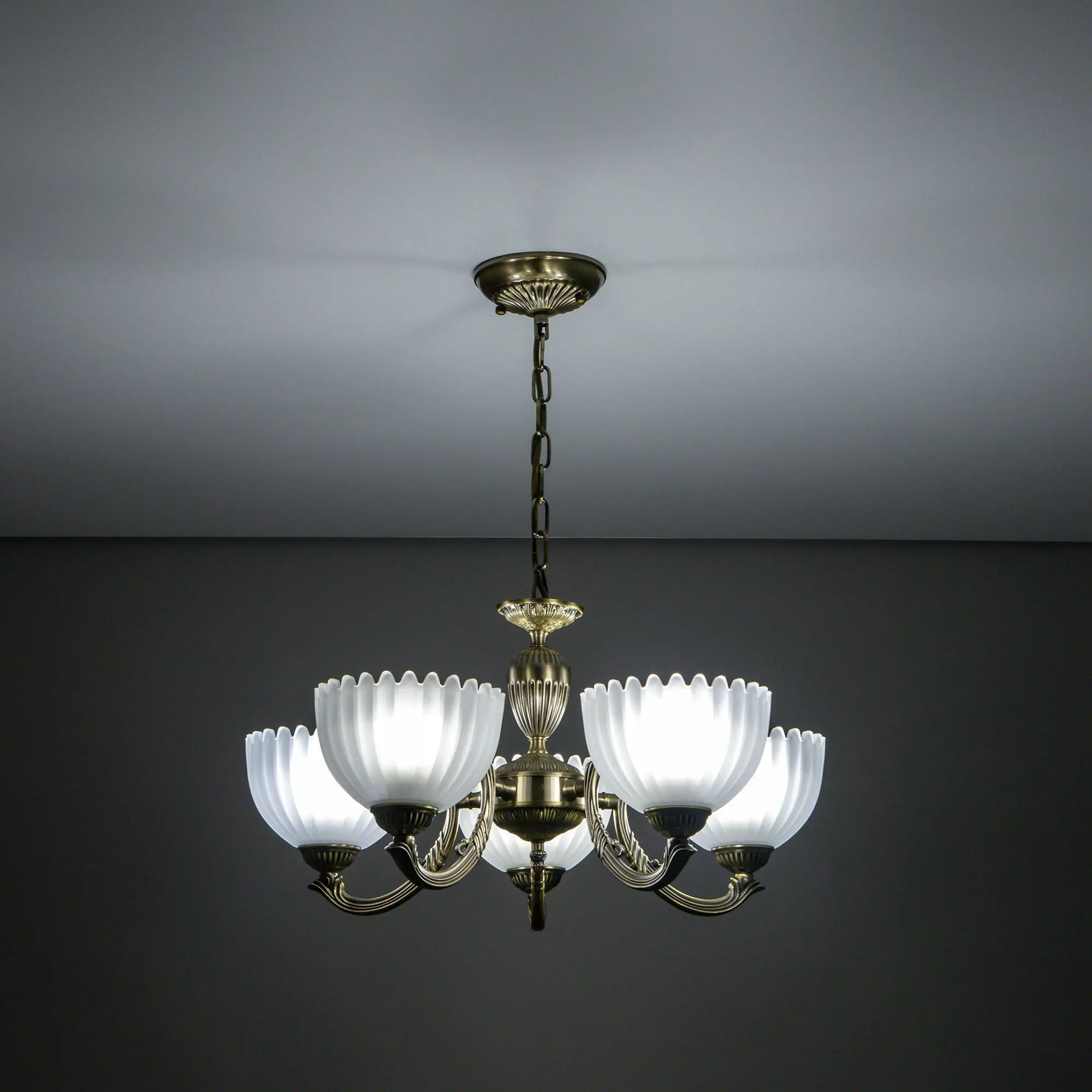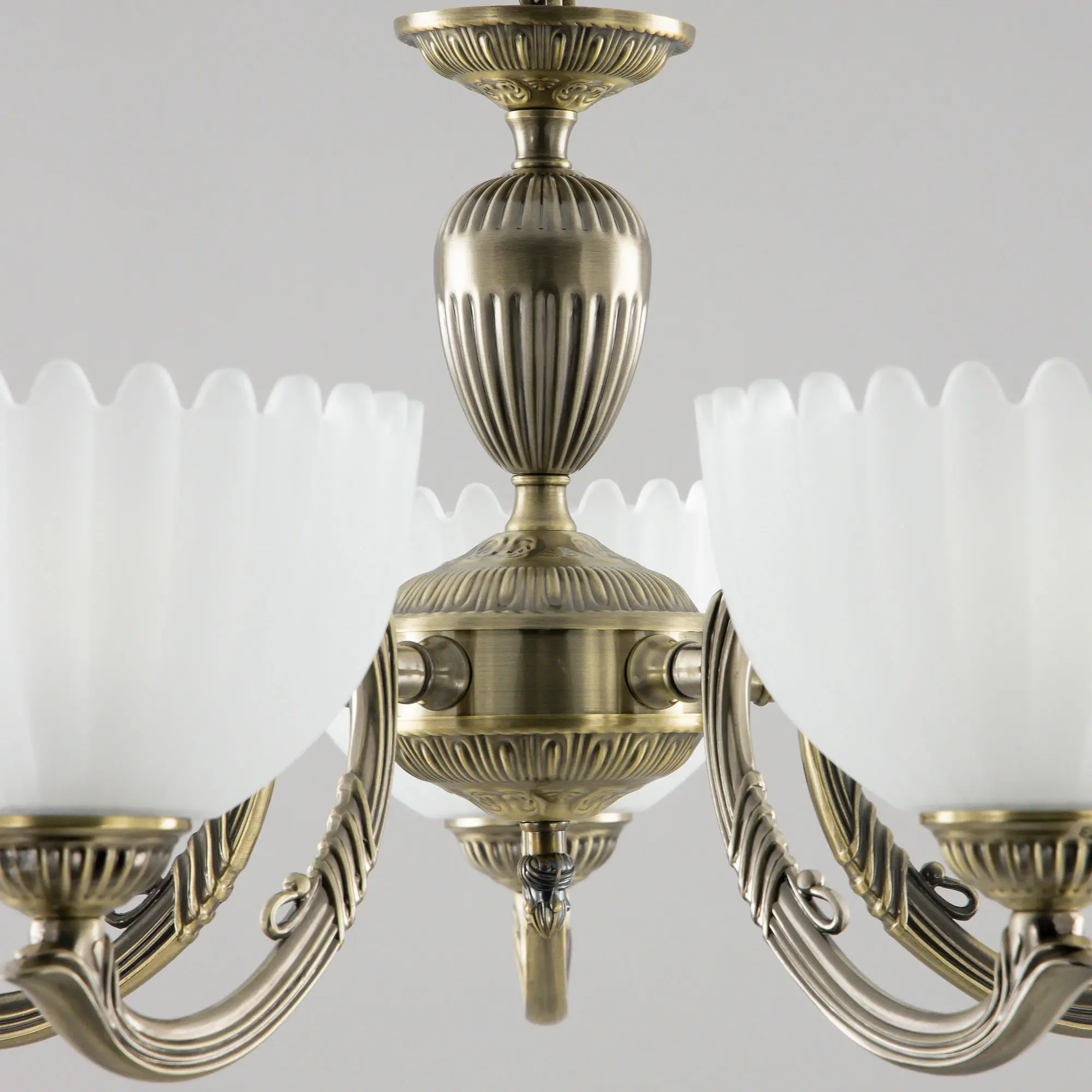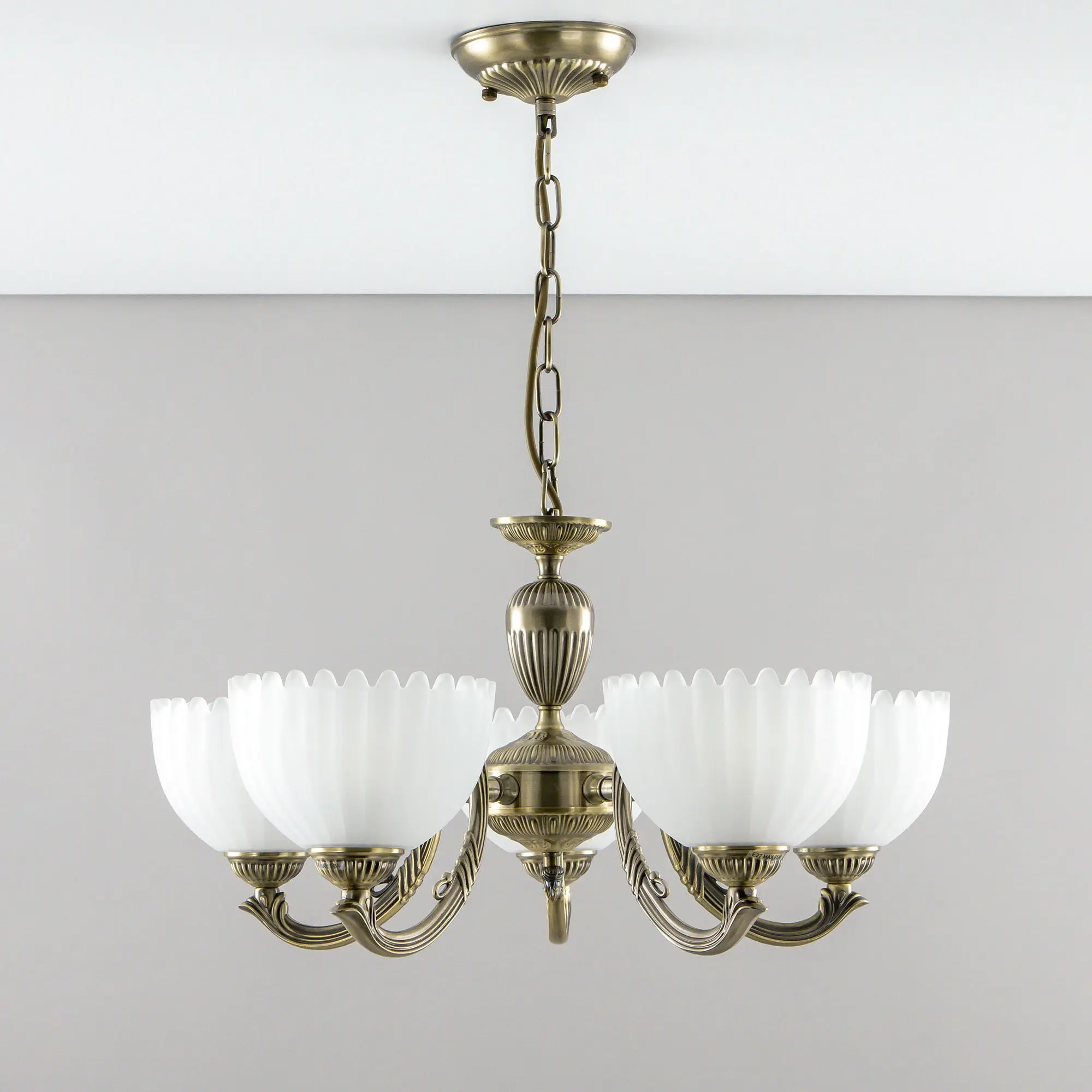 Люстра Citilux Севилья CL414153 выполнена в классическом стиле. Корпус светильника металлический, с литыми рожками, цвет бронза. Плафоны стеклянные, полуматовые, рифленые. Конструкция позволяет собрать модель как подвесную пятирожковую люстру, с плафонами направленными вверх, дающую мягкий отраженный свет или более яркий вариант с плафонами вниз. Если в помещении низкие потолки, изделие можно собрать вообще без элементов цепи, как потолочную люстру с рожками вниз. Тип крепления к потолку – планка. Более того, можно скоммутировать светильник для работы, как с одноклавишным, так и с двухклавишным выключателем. В модели используются 5 ламп с цоколем Е27 максимальной мощностью для ламп накаливания 75Вт. Светодиодные лампы можно использовать более яркие.