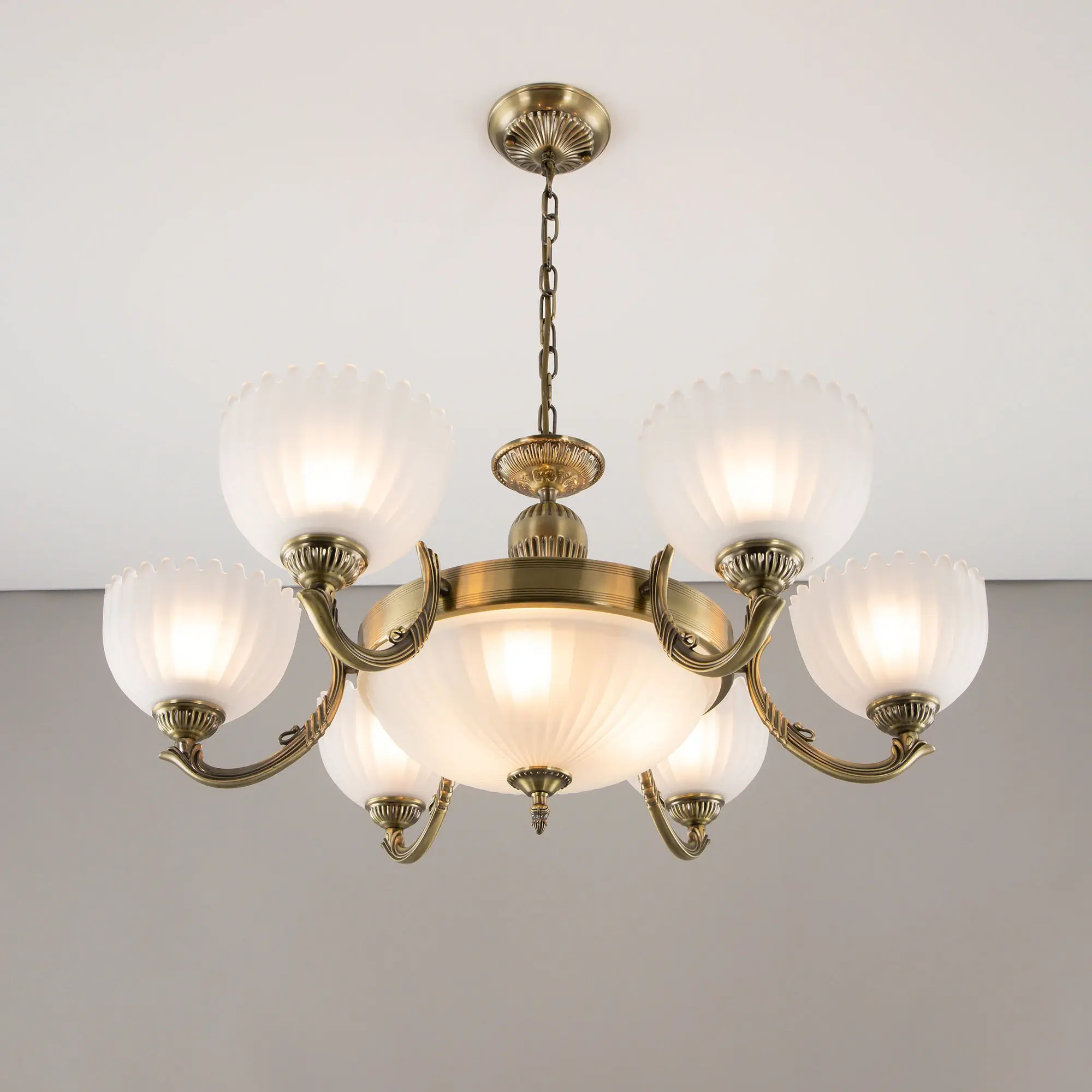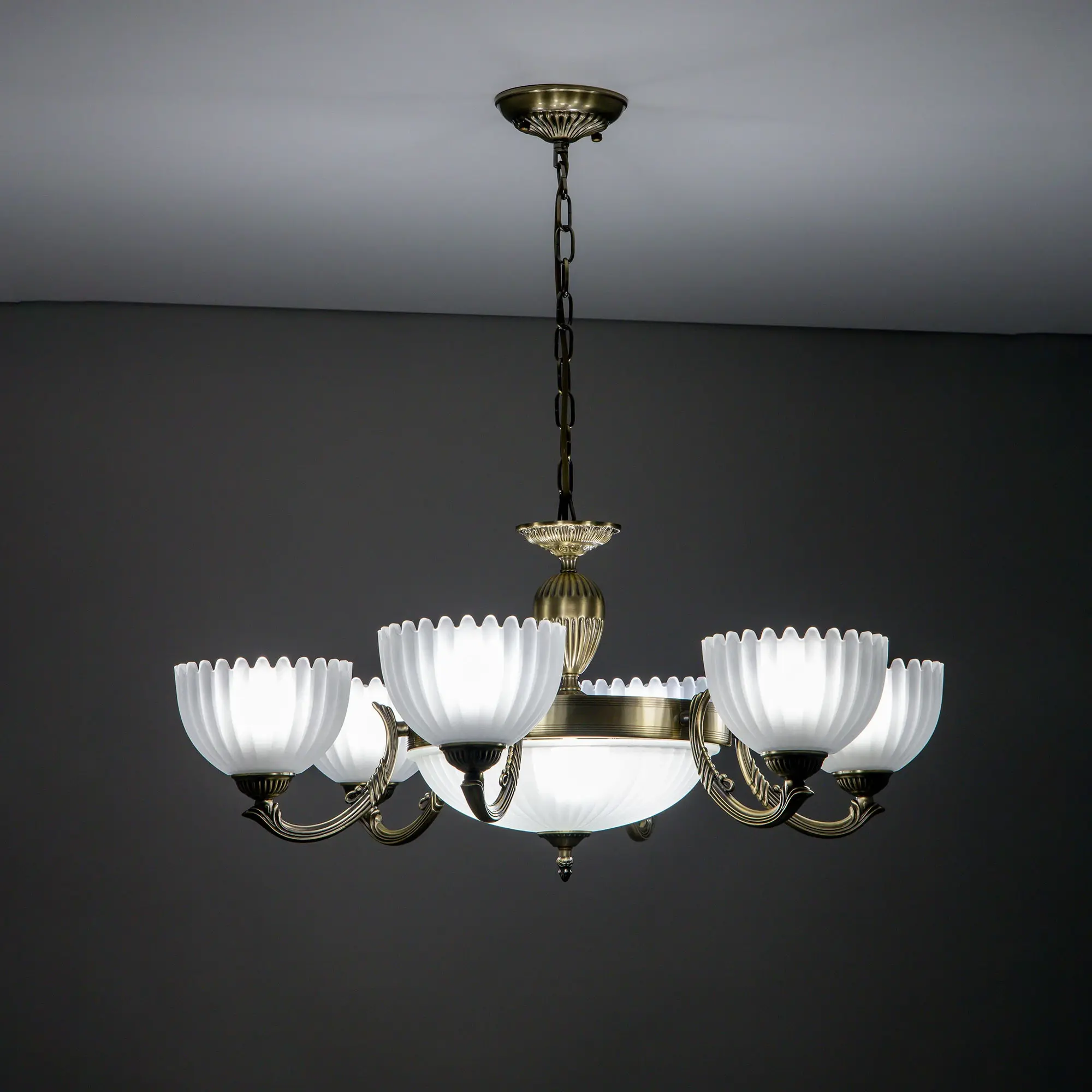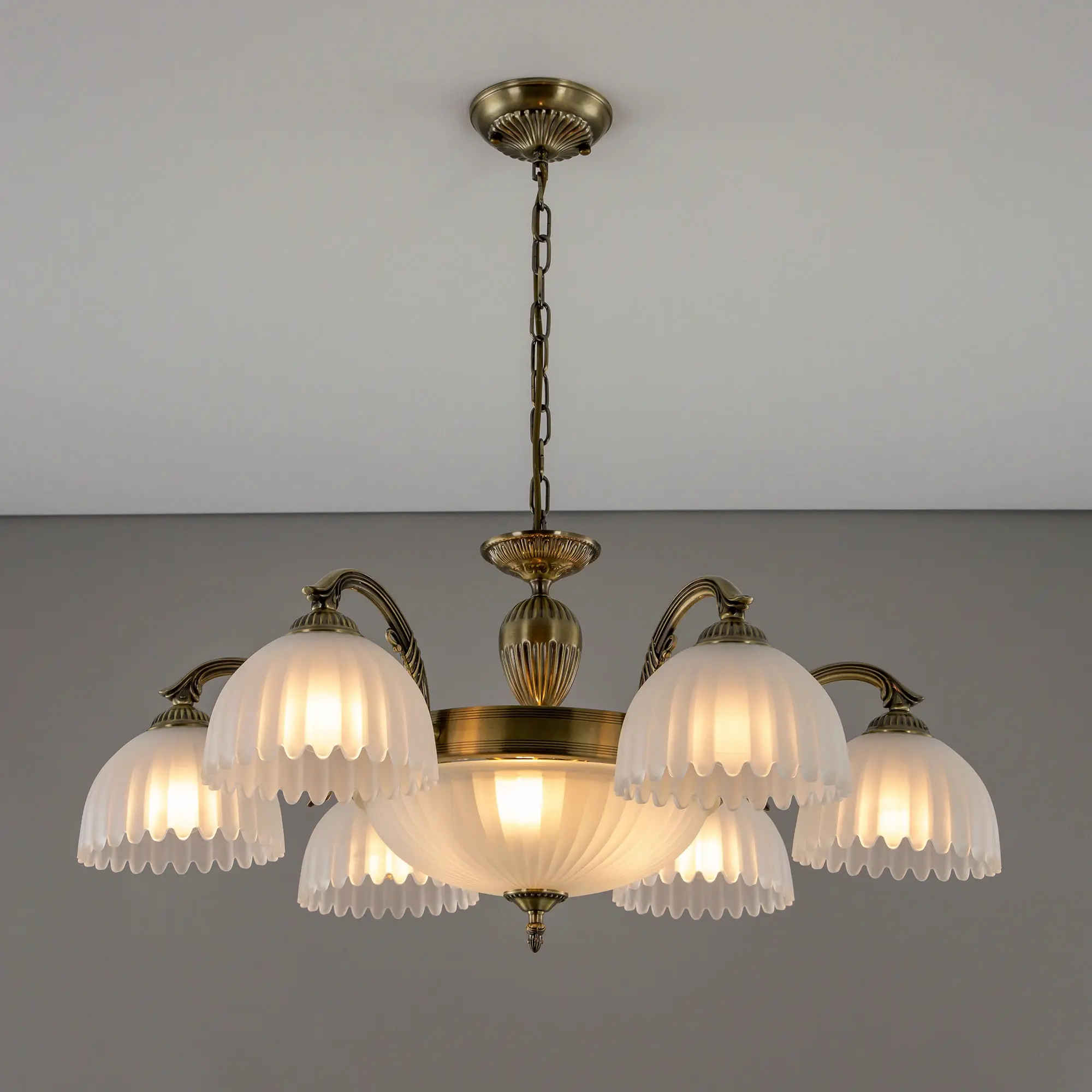Крупная люстра Citilux Севилья CL414193 с центральным плафоном выполнена в классическом стиле. Корпус светильника металлический, с литыми рожками, цвет бронза. Плафоны стеклянные, полуматовые, рифленые. Конструкция позволяет собрать модель как подвесную люстру, с плафонами направленными вверх, дающую мягкий отраженный свет или более яркий вариант с плафонами вниз. Если в помещении низкие потолки, изделие можно собрать вообще без элементов цепи, как потолочную люстру с рожками вниз. Тип крепления к потолку – планка. Более того, можно скоммутировать светильник для работы, как с одноклавишным, так и с двухклавишным выключателем. В модели используются 6 ламп с цоколем Е27 и мощностью 75Вт в боковых плафонах и 3 лампы с цоколем Е14 и мощностью 60Вт в центральном плафоне. Светодиодные лампы можно использовать более яркие.