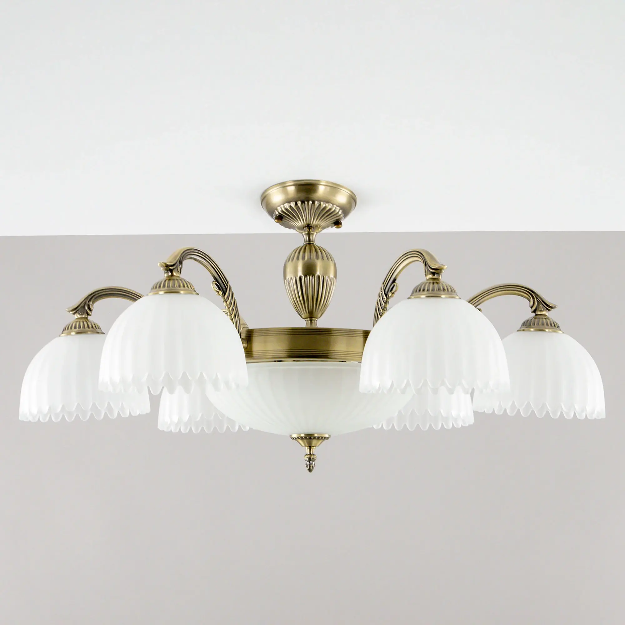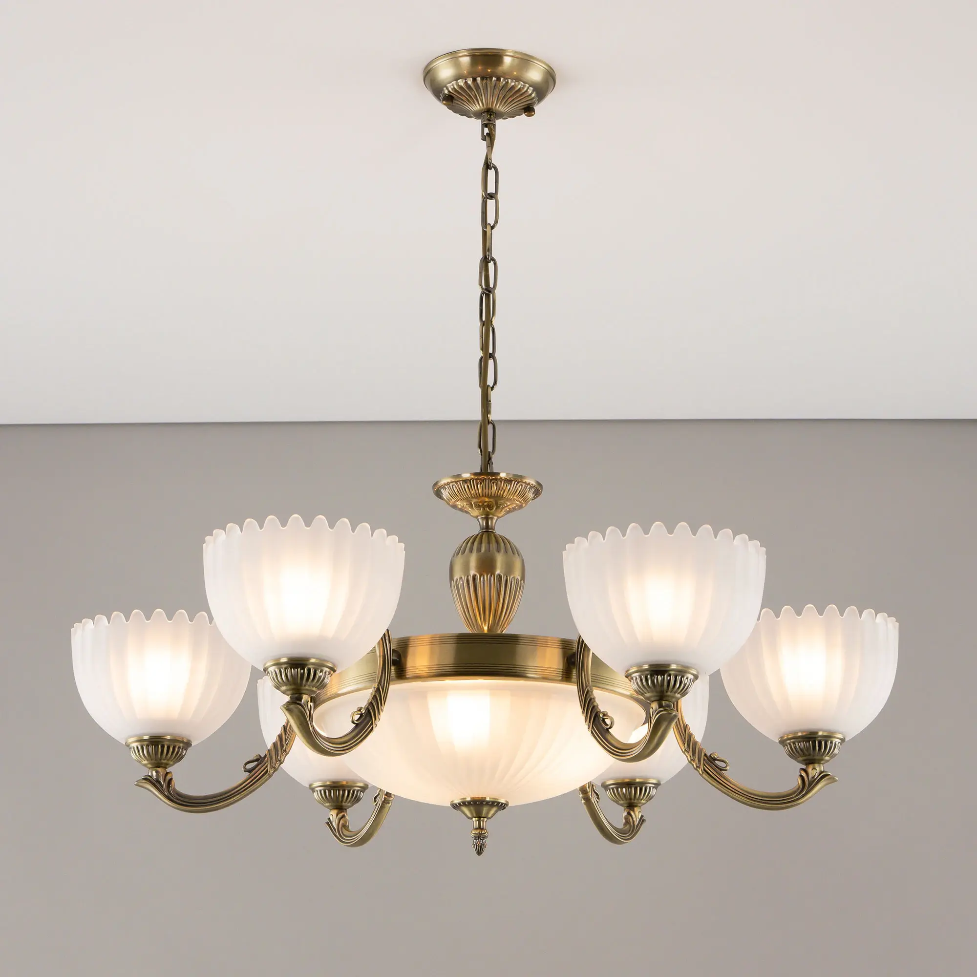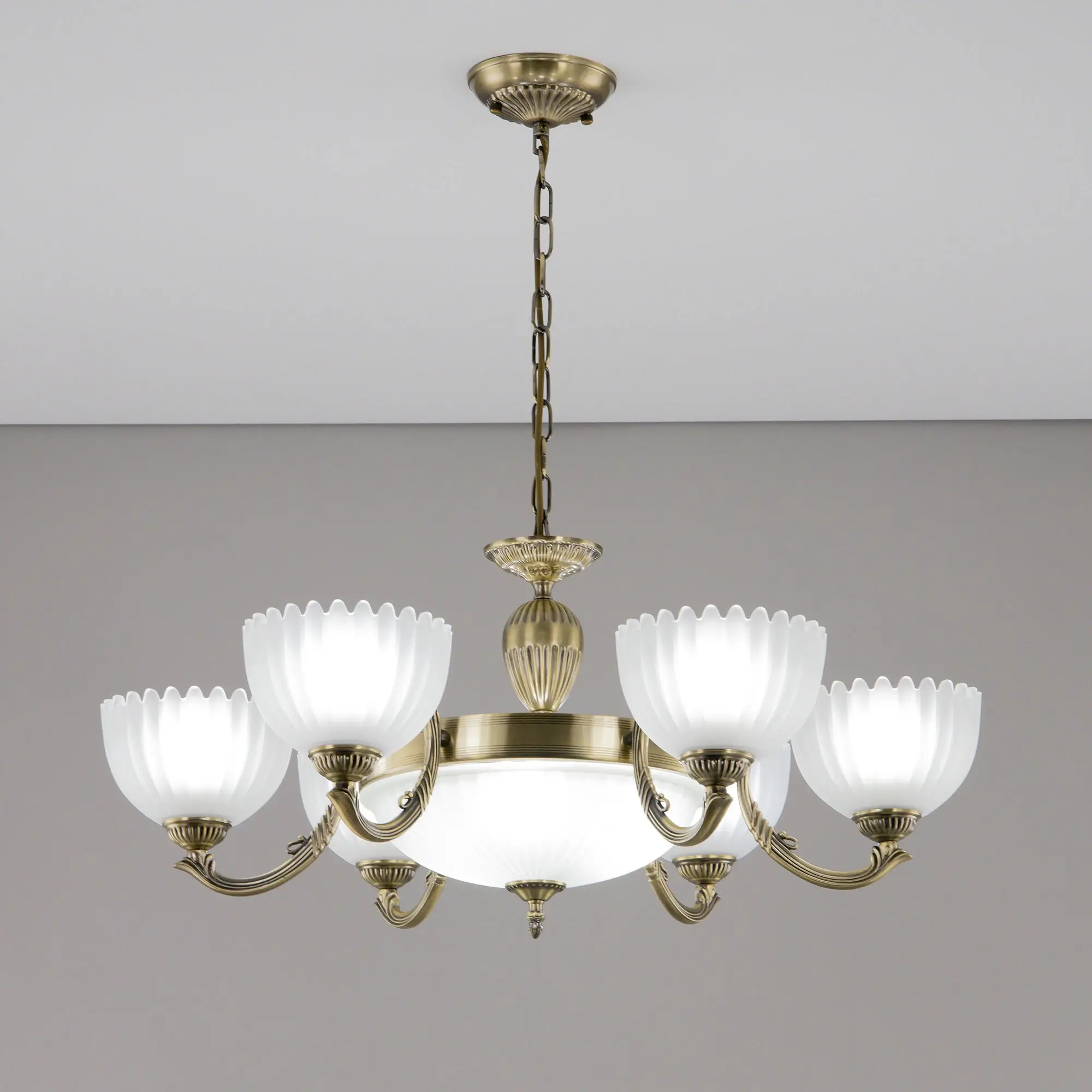 Крупная люстра Citilux Севилья CL414193 с центральным плафоном выполнена в классическом стиле. Корпус светильника металлический, с литыми рожками, цвет бронза. Плафоны стеклянные, полуматовые, рифленые. Конструкция позволяет собрать модель как подвесную люстру, с плафонами направленными вверх, дающую мягкий отраженный свет или более яркий вариант с плафонами вниз. Если в помещении низкие потолки, изделие можно собрать вообще без элементов цепи, как потолочную люстру с рожками вниз. Тип крепления к потолку – планка. Более того, можно скоммутировать светильник для работы, как с одноклавишным, так и с двухклавишным выключателем. В модели используются 6 ламп с цоколем Е27 и мощностью 75Вт в боковых плафонах и 3 лампы с цоколем Е14 и мощностью 60Вт в центральном плафоне. Светодиодные лампы можно использовать более яркие.