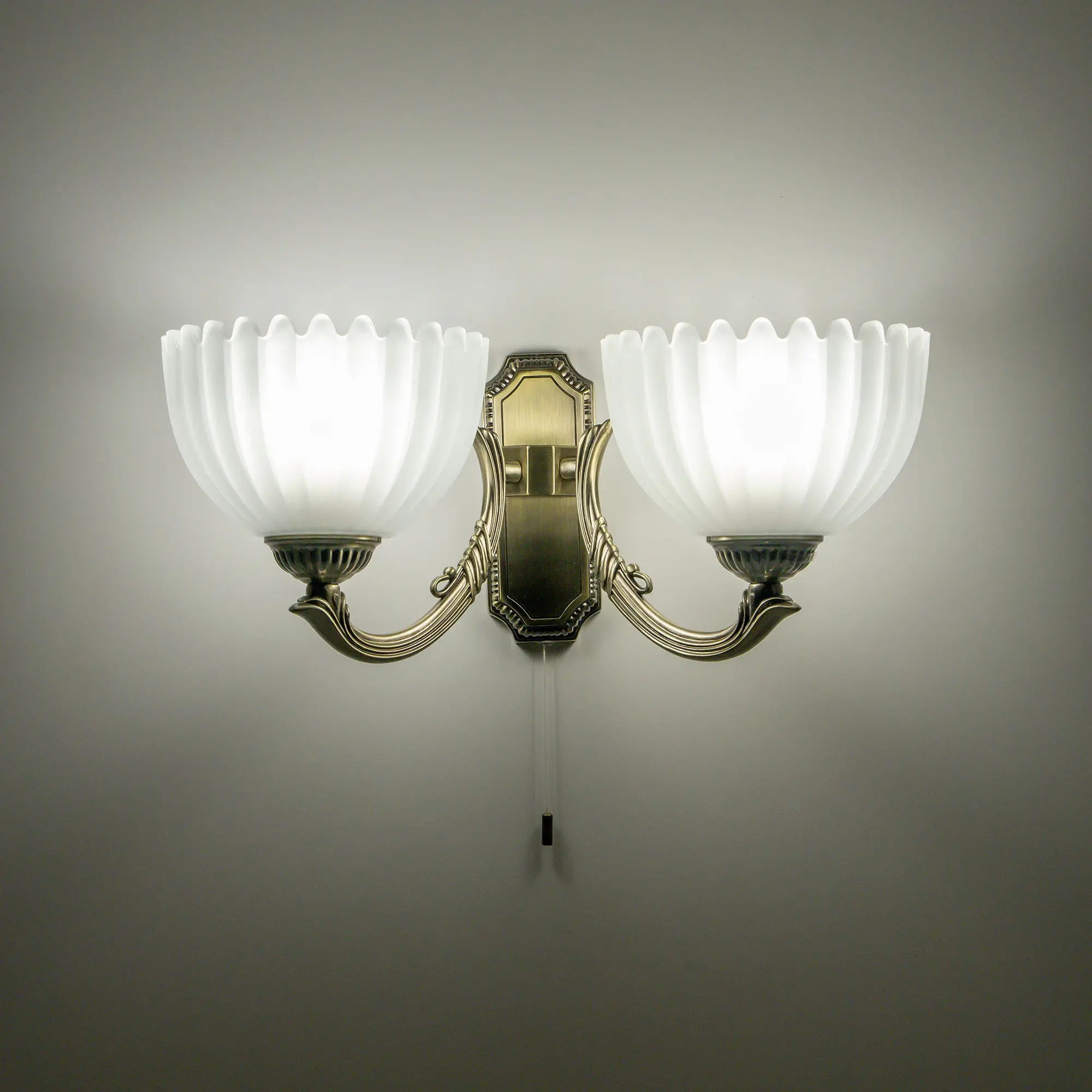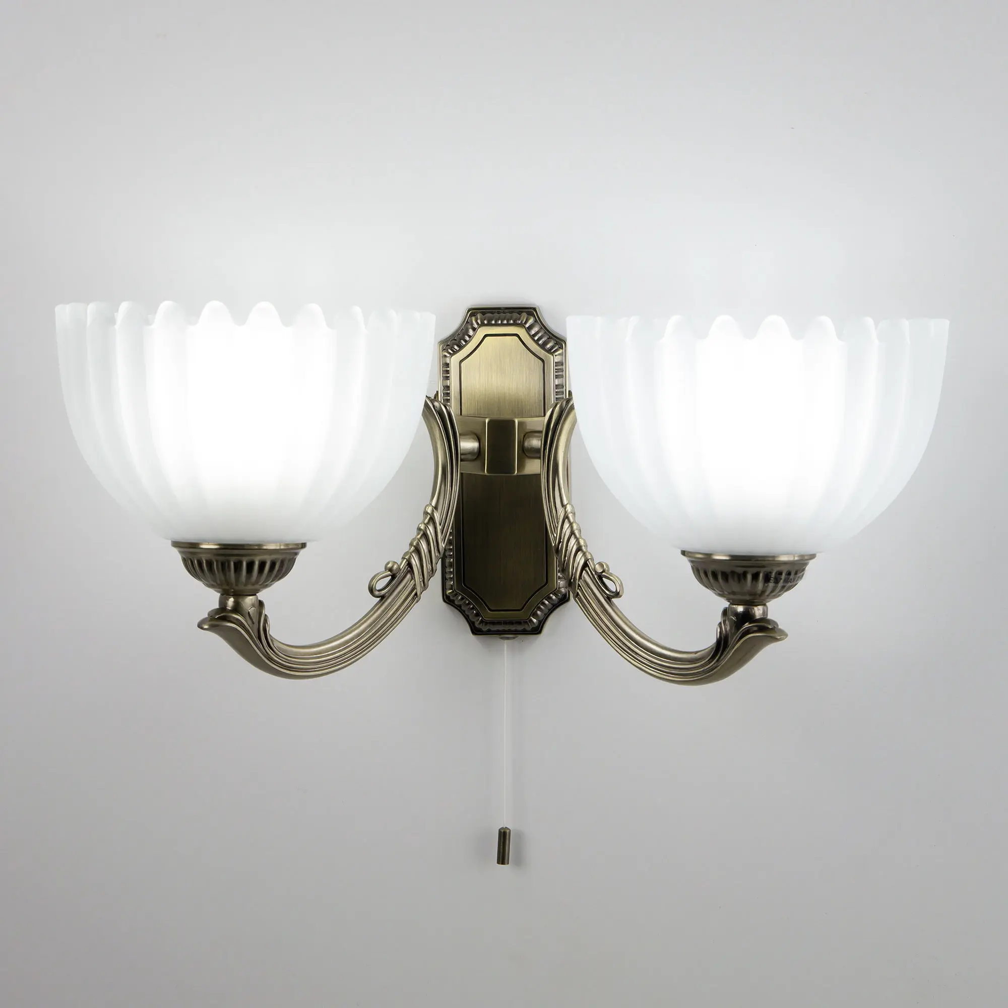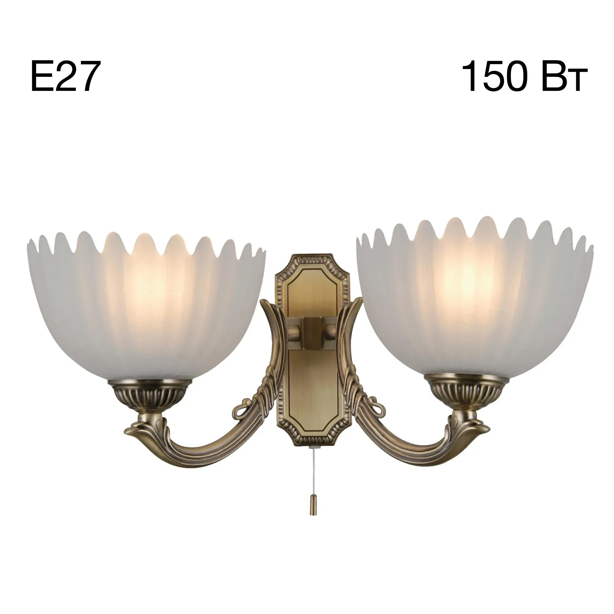 Двухрожковое бра Citilux Севилья CL414323 выполнено в классическом стиле. Корпус светильника металлический, с литыми рожками, цвет бронза. Плафоны стеклянные, полуматовые, рифленые. Конструкция позволяет собрать модель с плафонами вверх, дающую мягкий отраженный свет или более яркий вариант с плафонами вниз. В изделии используются 2 лампы с цоколем Е27 и максимальной мощностью для ламп накаливания 75Вт. Светодиодные лампы можно использовать более яркие. На корпусе находится удобный выключатель.