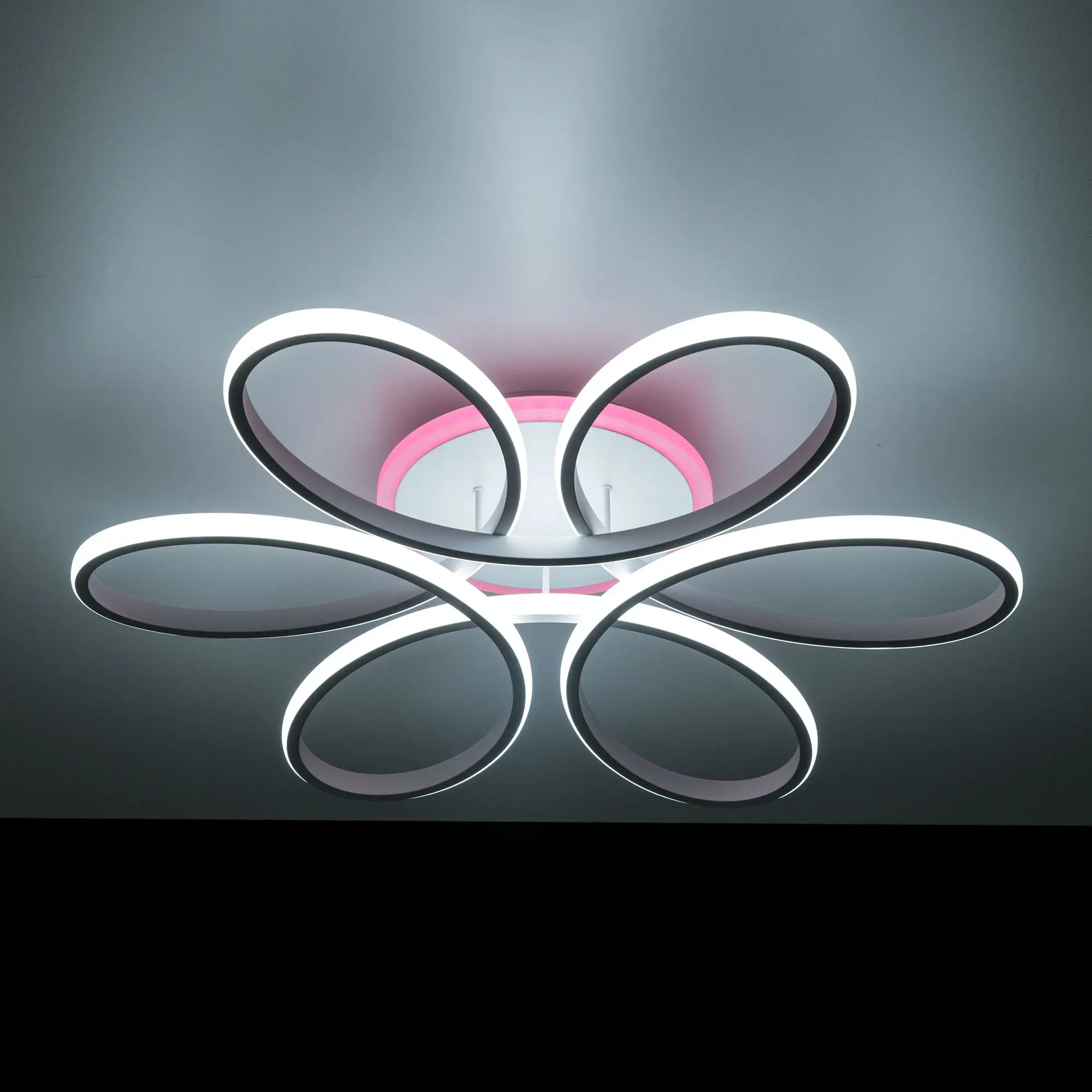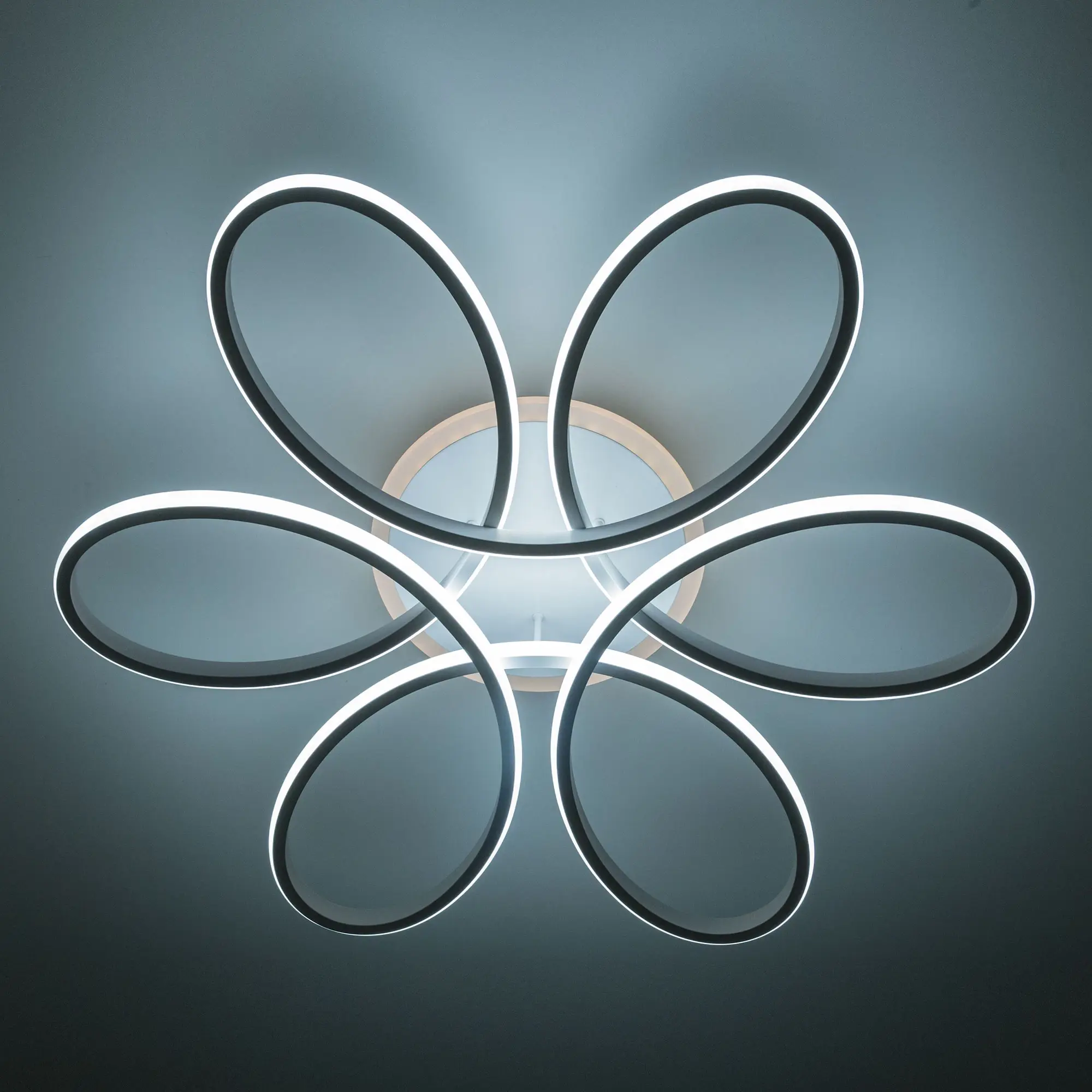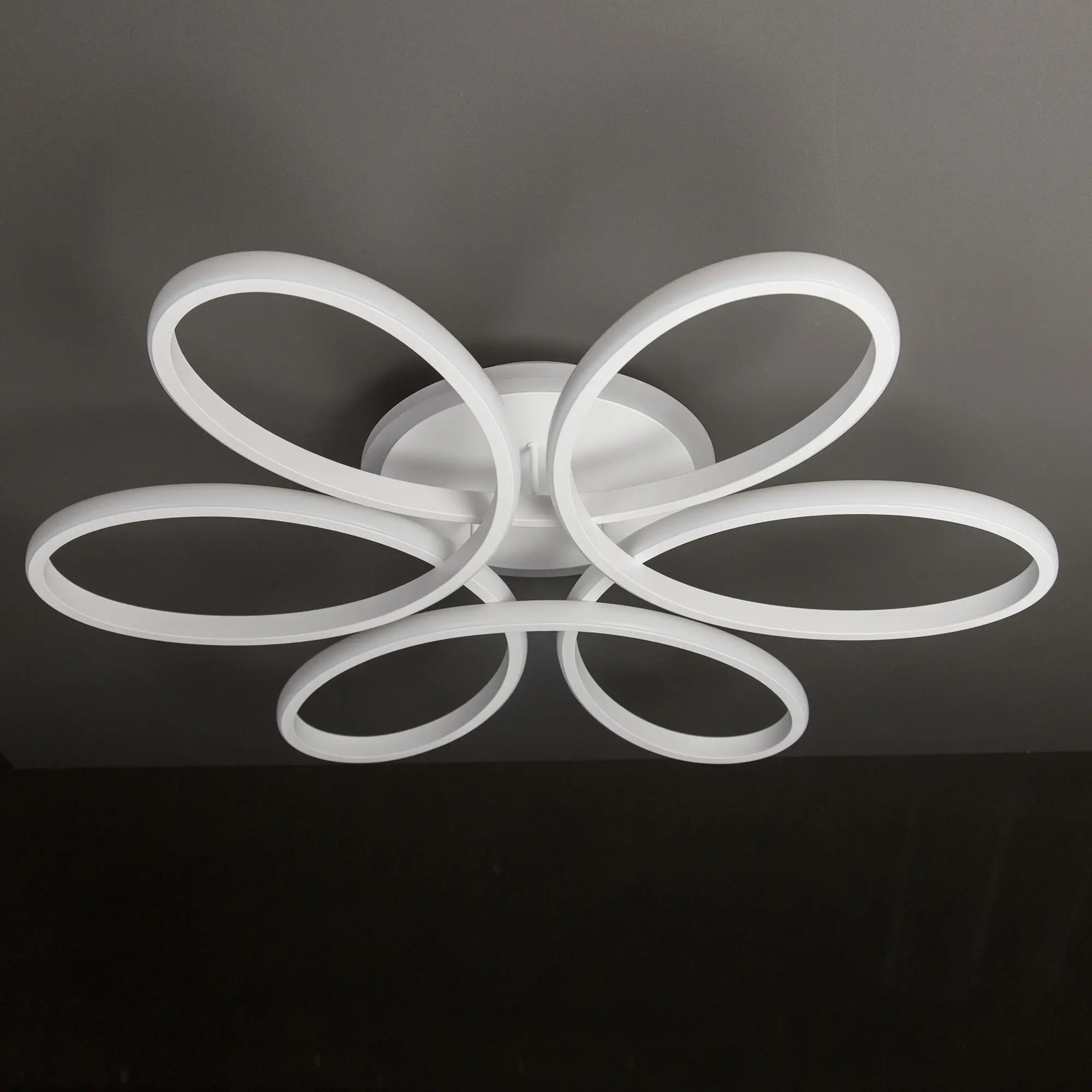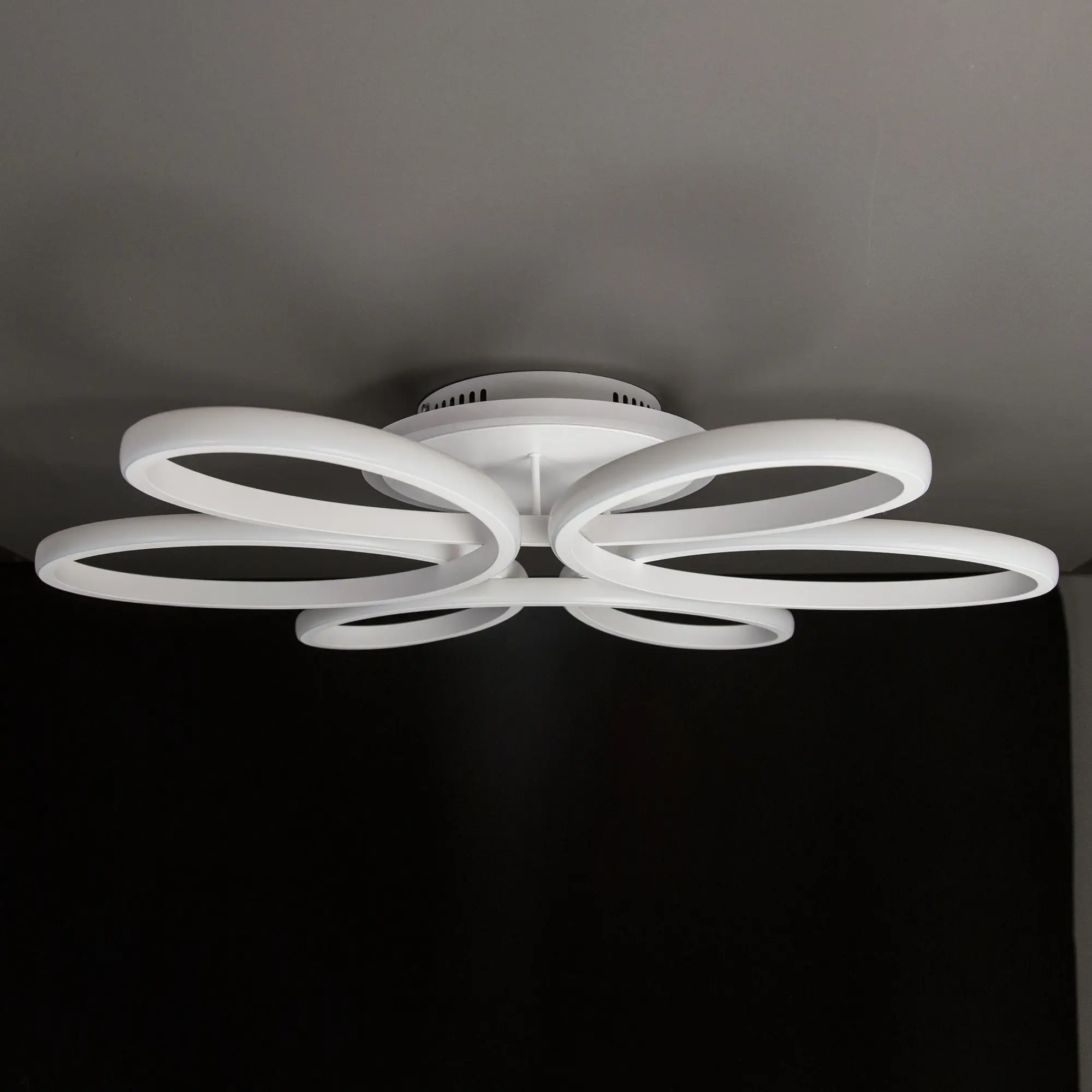 Светильник белый матовый, с круглым основанием. Светодиодный модуль формирующий внешний вид люстры изогнутой формы. Модель подходит для всех типов потолков, в том числе натяжных.