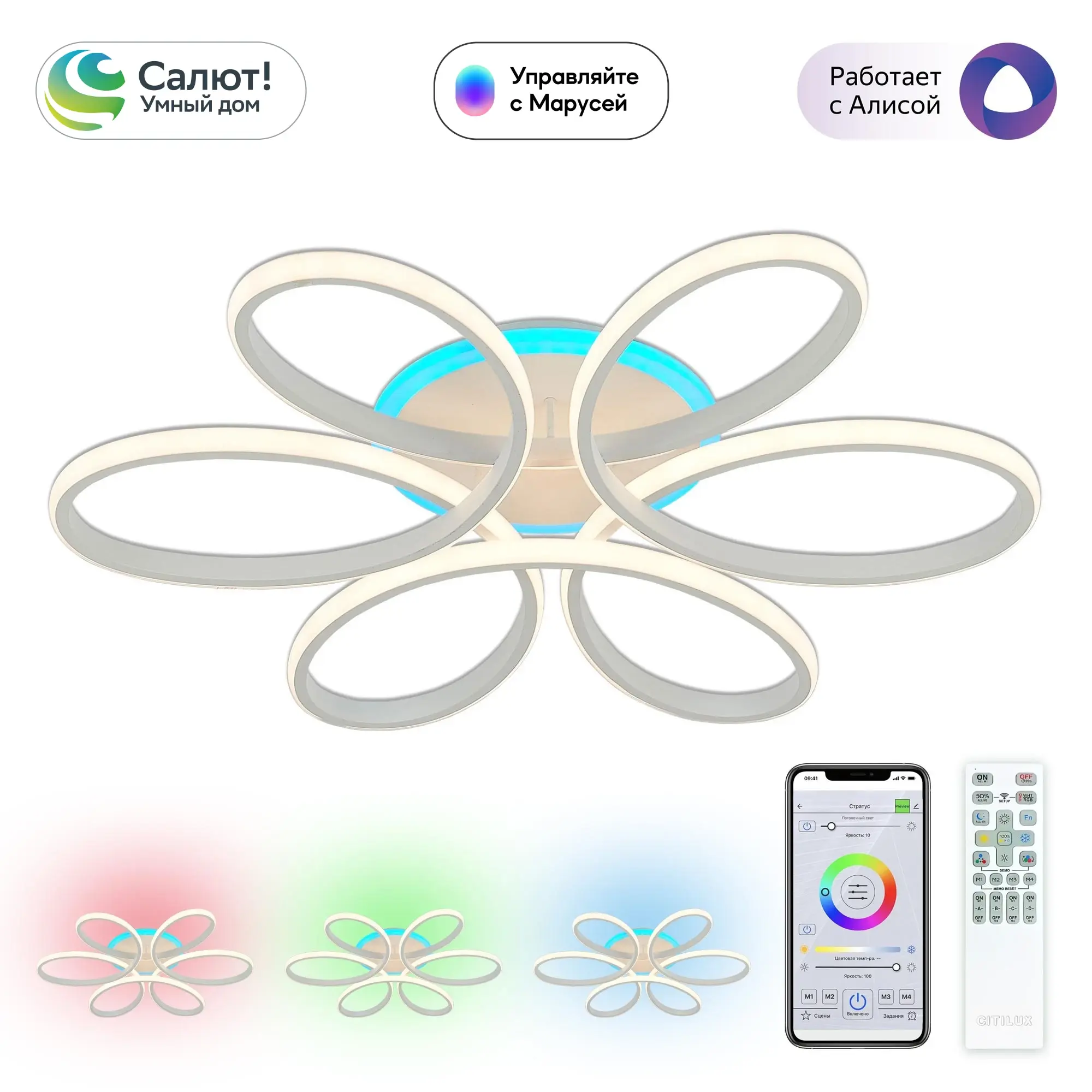 Люстрой можно управлять: из приложения на смартфоне по Wi-Fi при наличии интернета, с помощью голосовых помощников Алиса и Маруся, есть возможность запуска настроенных сценариев с помощью Сири, а также пультом дистанционного управления и с настенного выключателя.