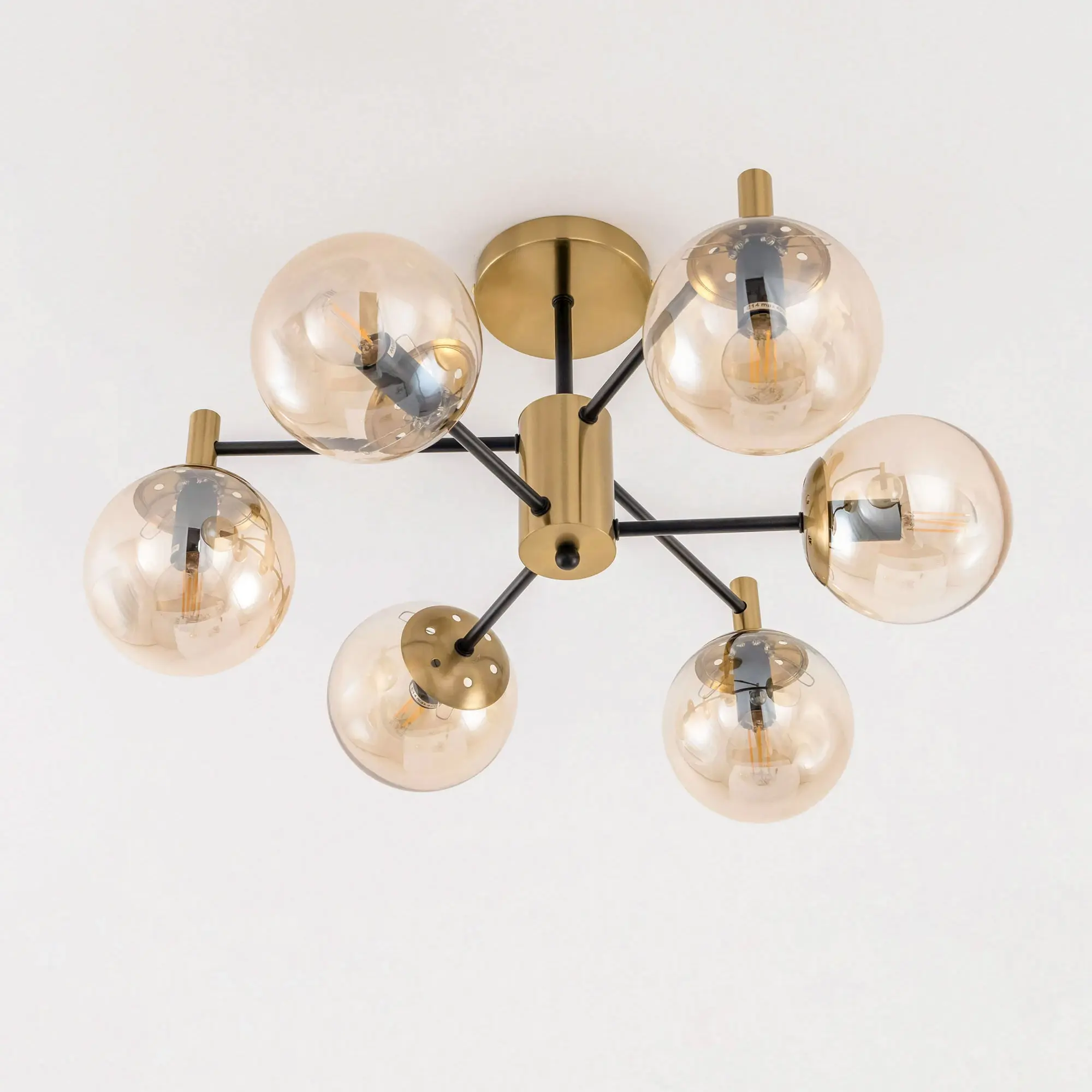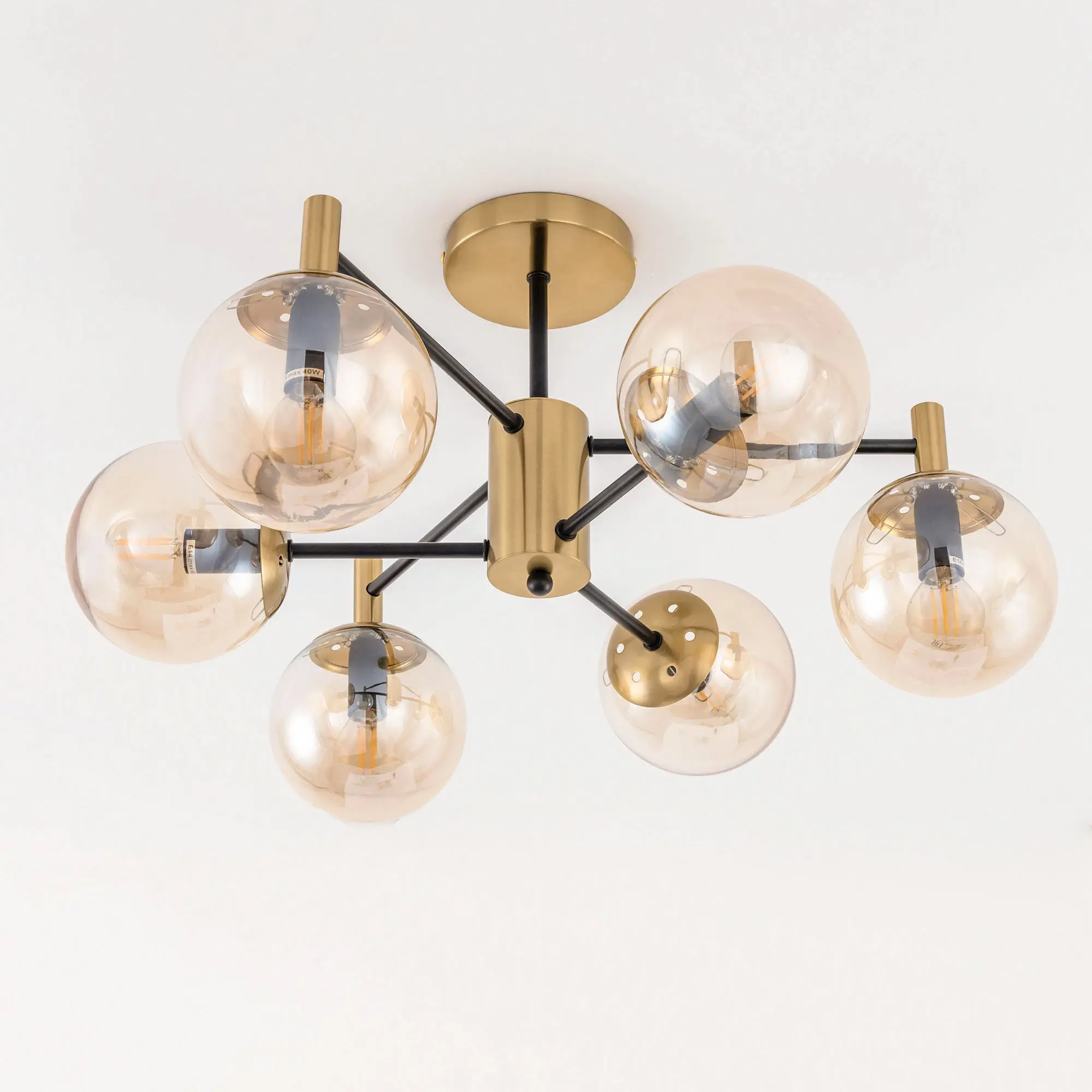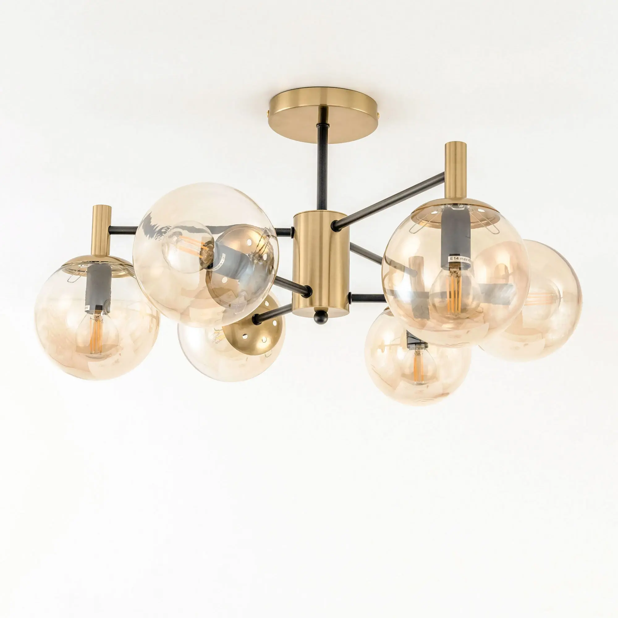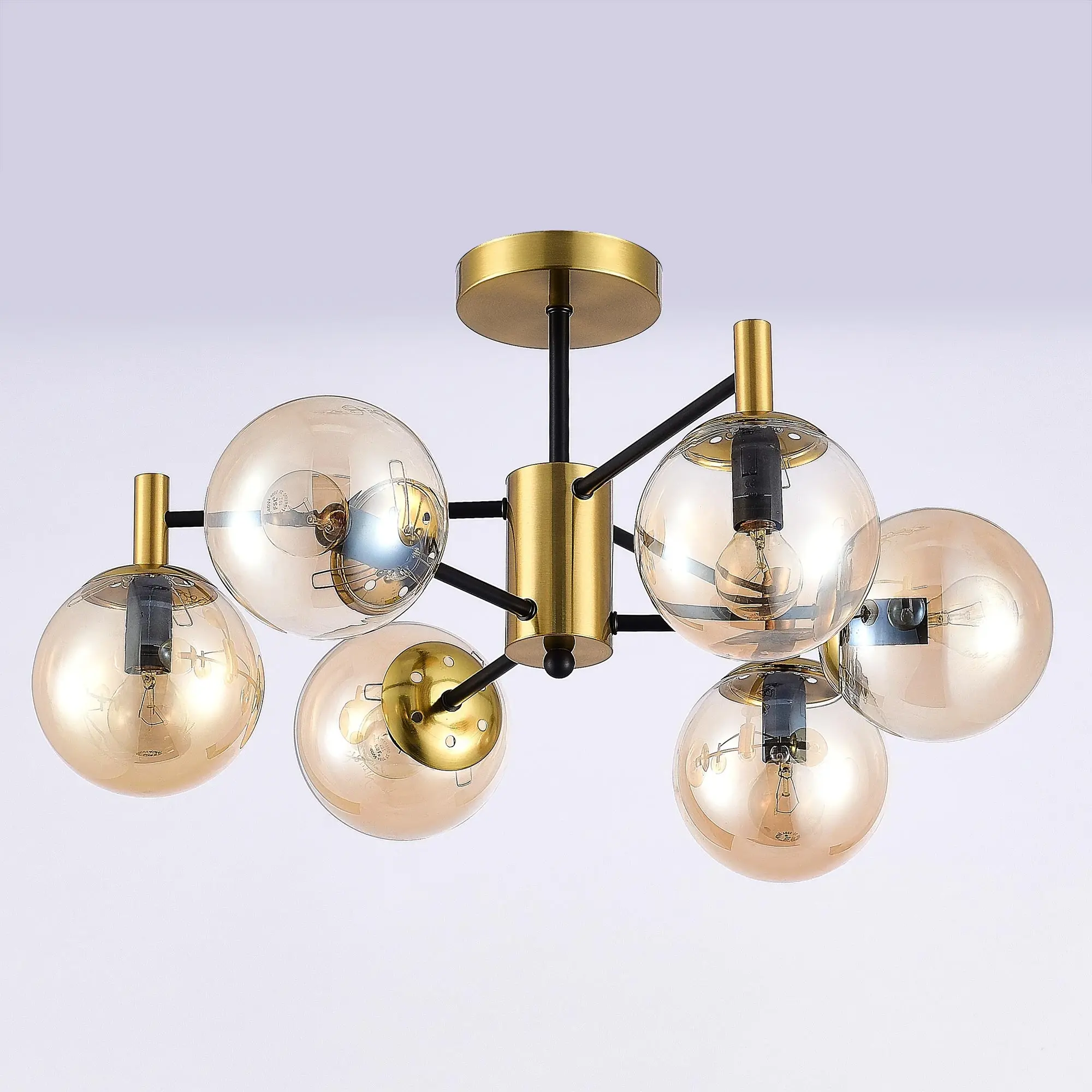 Стильная потолочная люстра Citilux Шарлиз CL143163 для модных интерьеров. Корпус светильника металлический, бронзового цвета, с декоративными чёрными элементами. Основание круглое, рожки-штанги расположены параллельно потолку. Плафоны в форме шара изготовлены из прозрачного стекла светло-янтарного оттенка. В изделии используются лампы с цоколем Е14, максимальной мощностью для ламп накаливания 40Вт. Светодиодные лампы можно устанавливать более яркие. Подходит для всех типов потолков, в том числе натяжных, тип крепления – планка. Шестирожковая люстра Citilux Шарлиз CL143163 ярко осветит площадь около 16м².